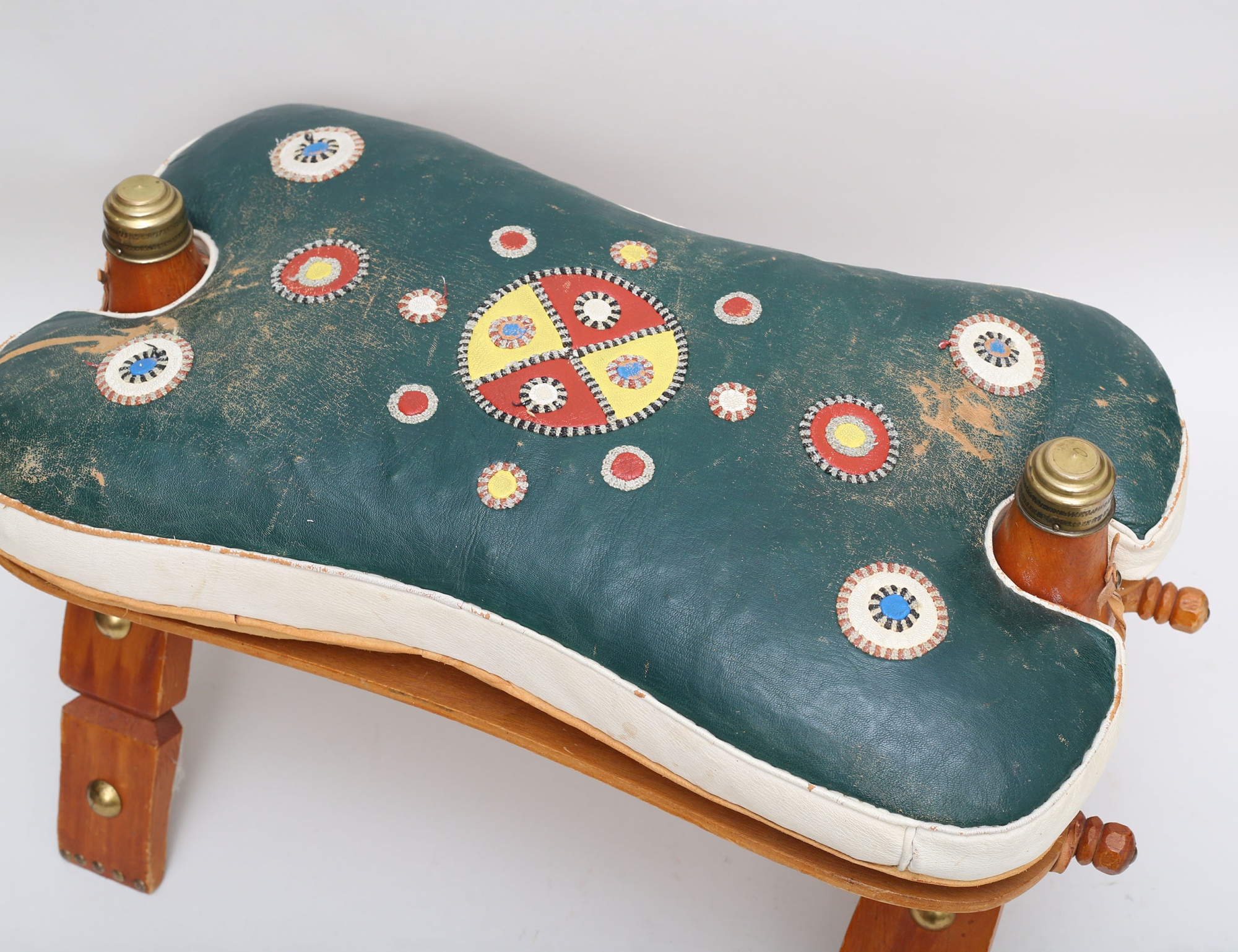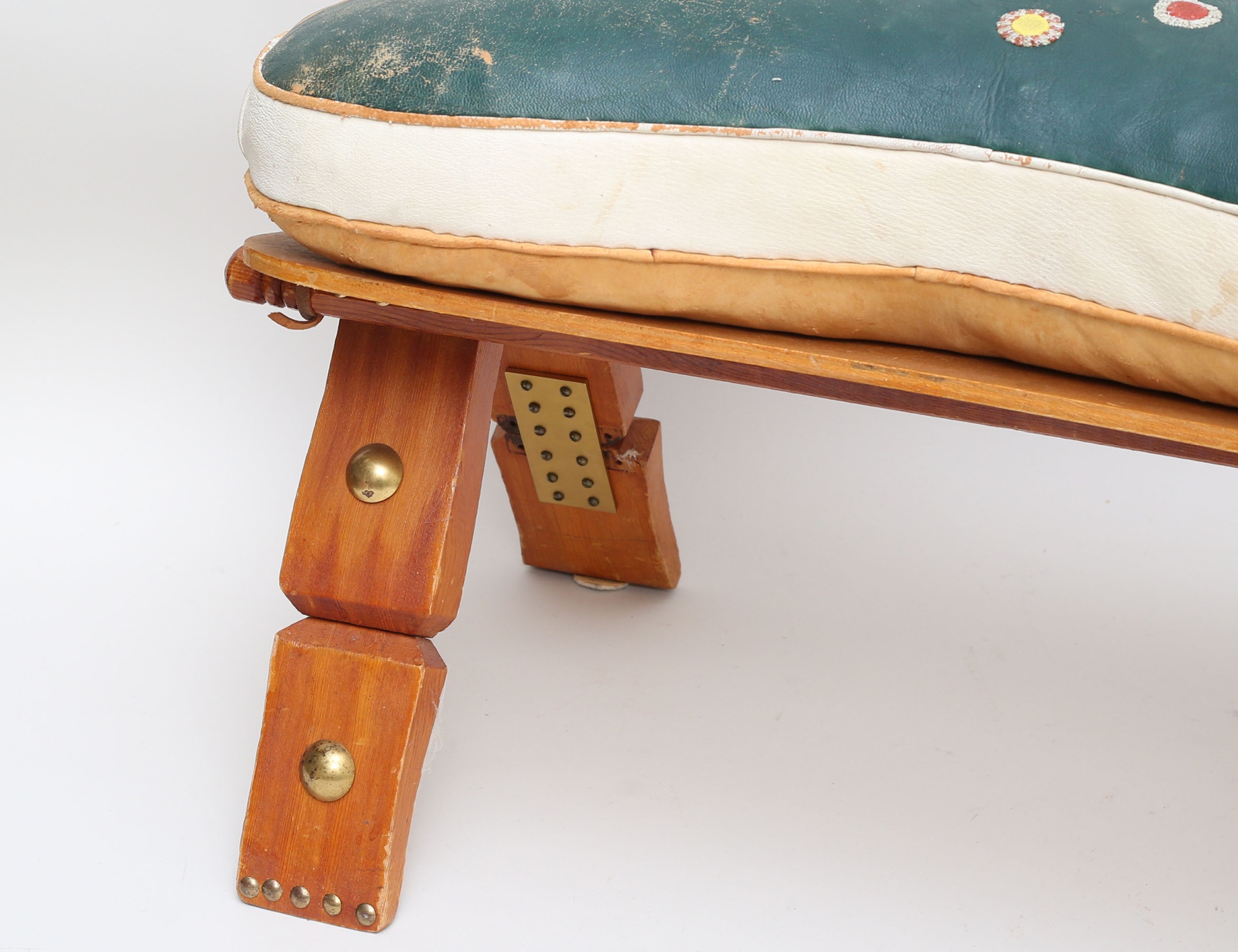 1900-talets andra hälft, stomme i trä med mässingsdetaljer, läderband, klädsel av skinn bla. grönt med traditionella mönster, höjd 41, bredd 65 (bruksslitage)