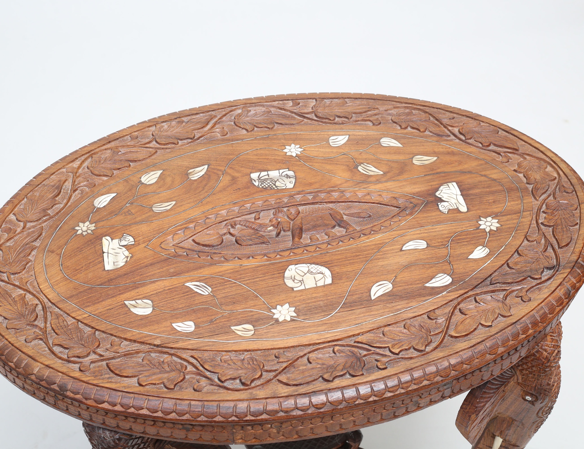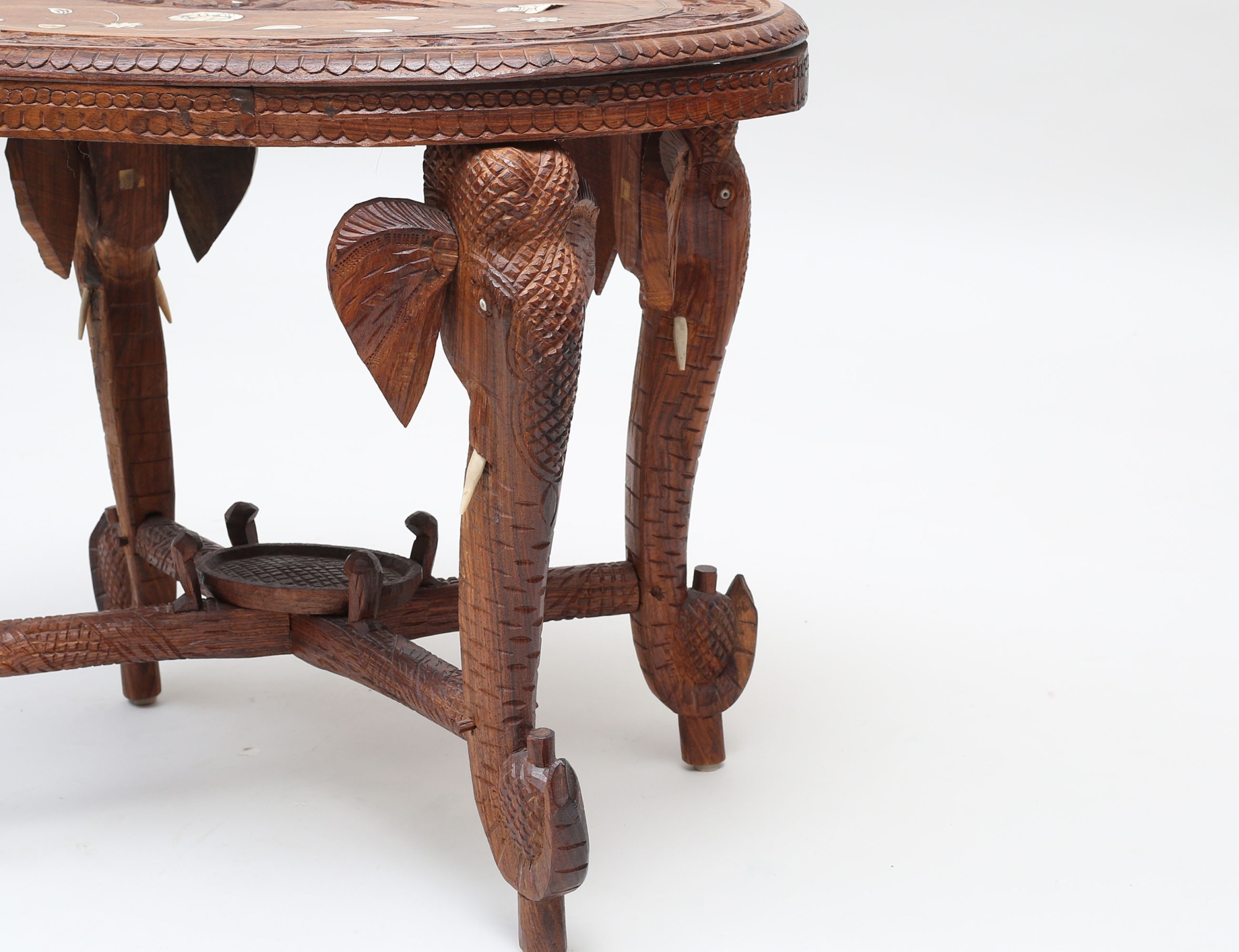 Nordafrika, rikt träskuren dekor med infällda bendetaljer, ben i form av elefanthuvuden, höjd 61, bredd 76x52 (sarg med spricka)