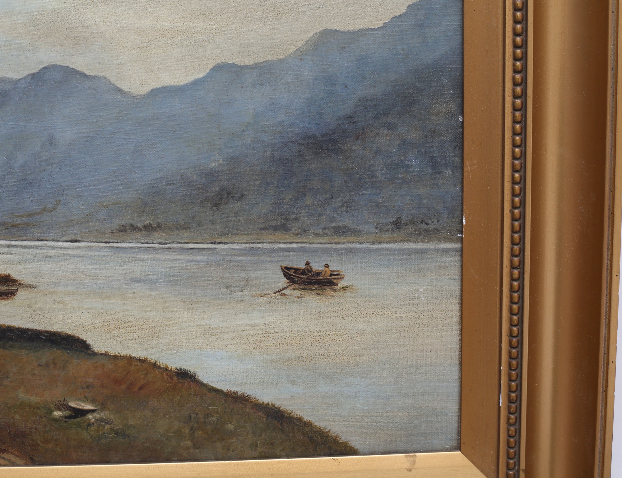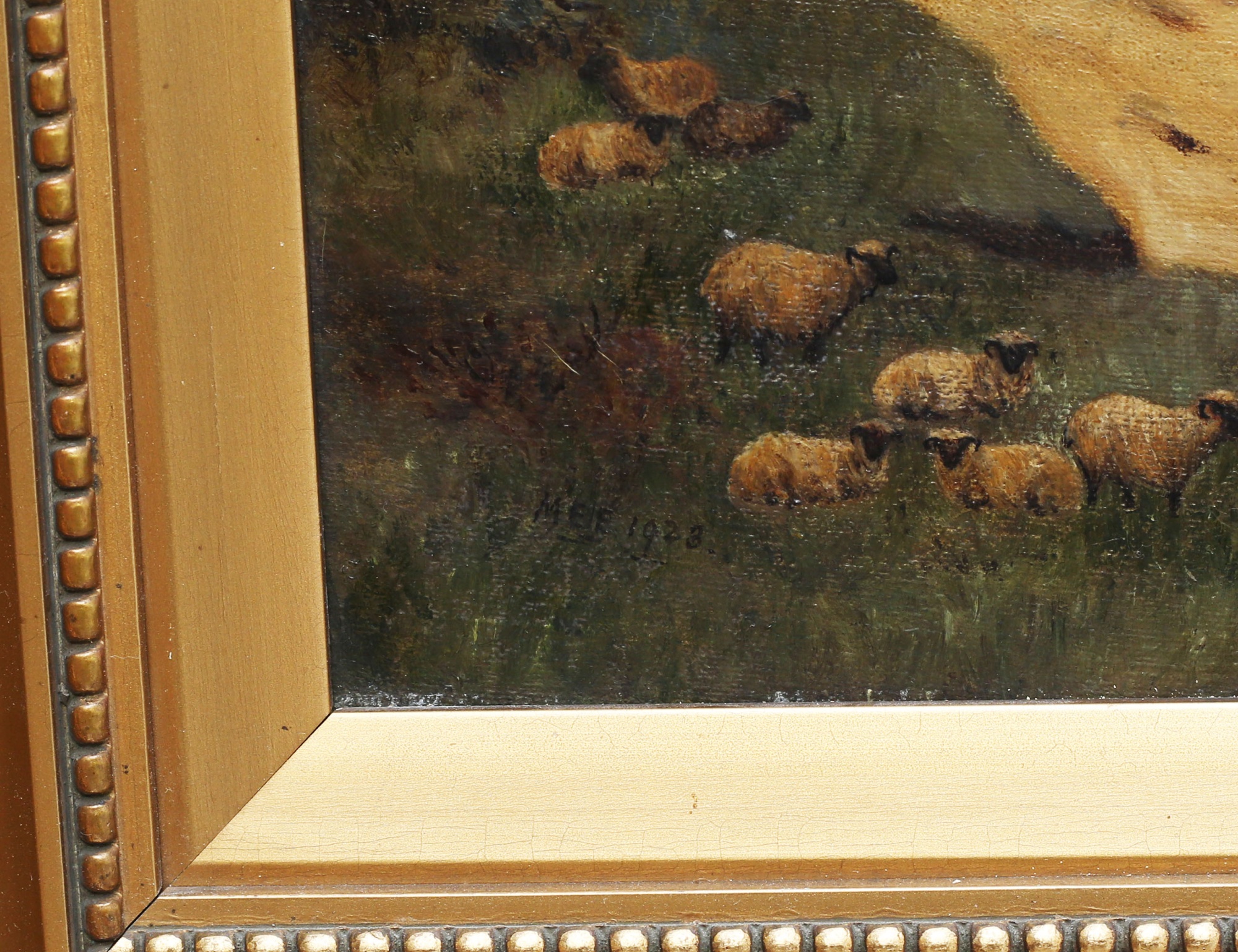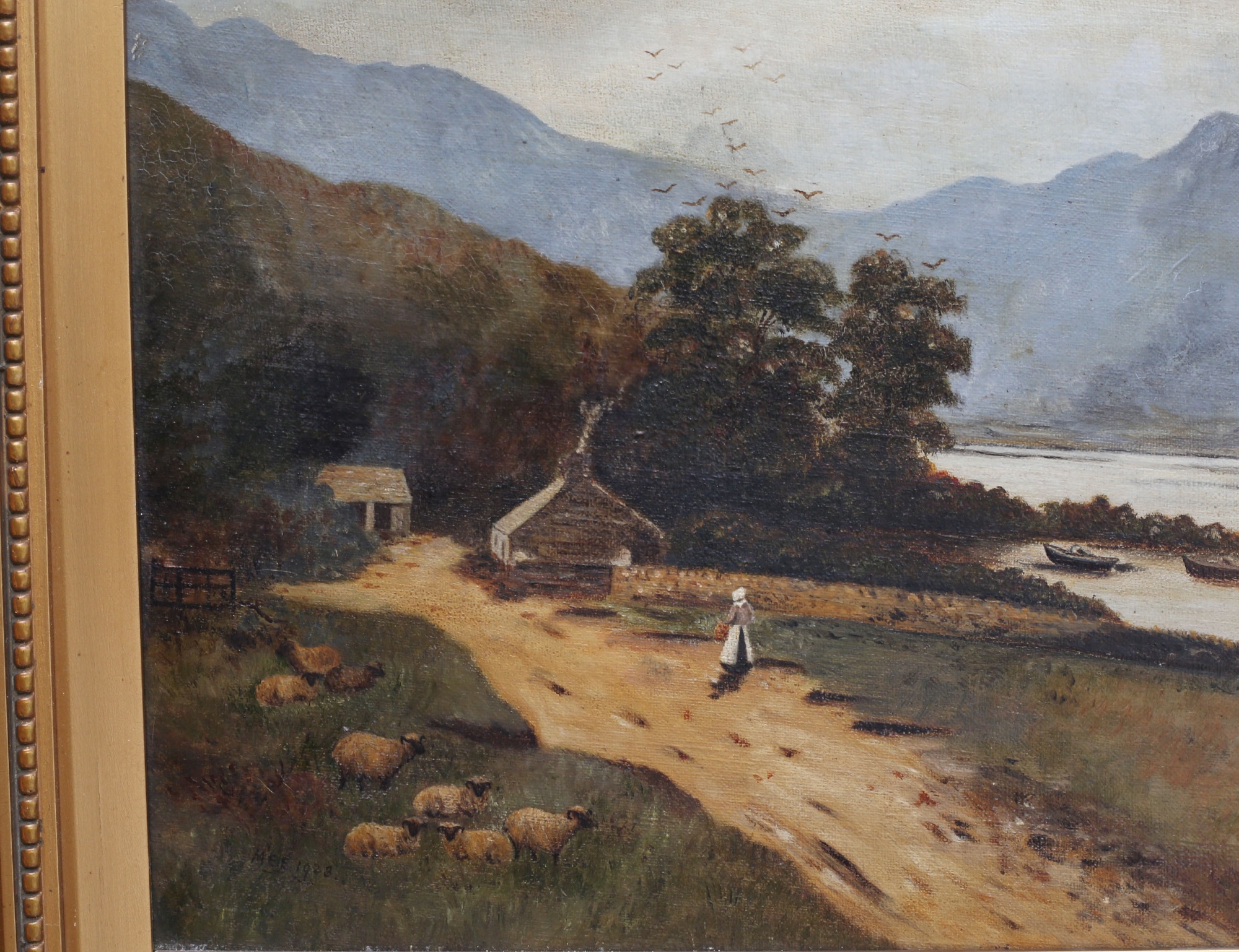 oljemålning på duk, insjölandskap med figurer i eka och gård med får, signerad MEE (?) 1928, 31x51, rammått 44x63