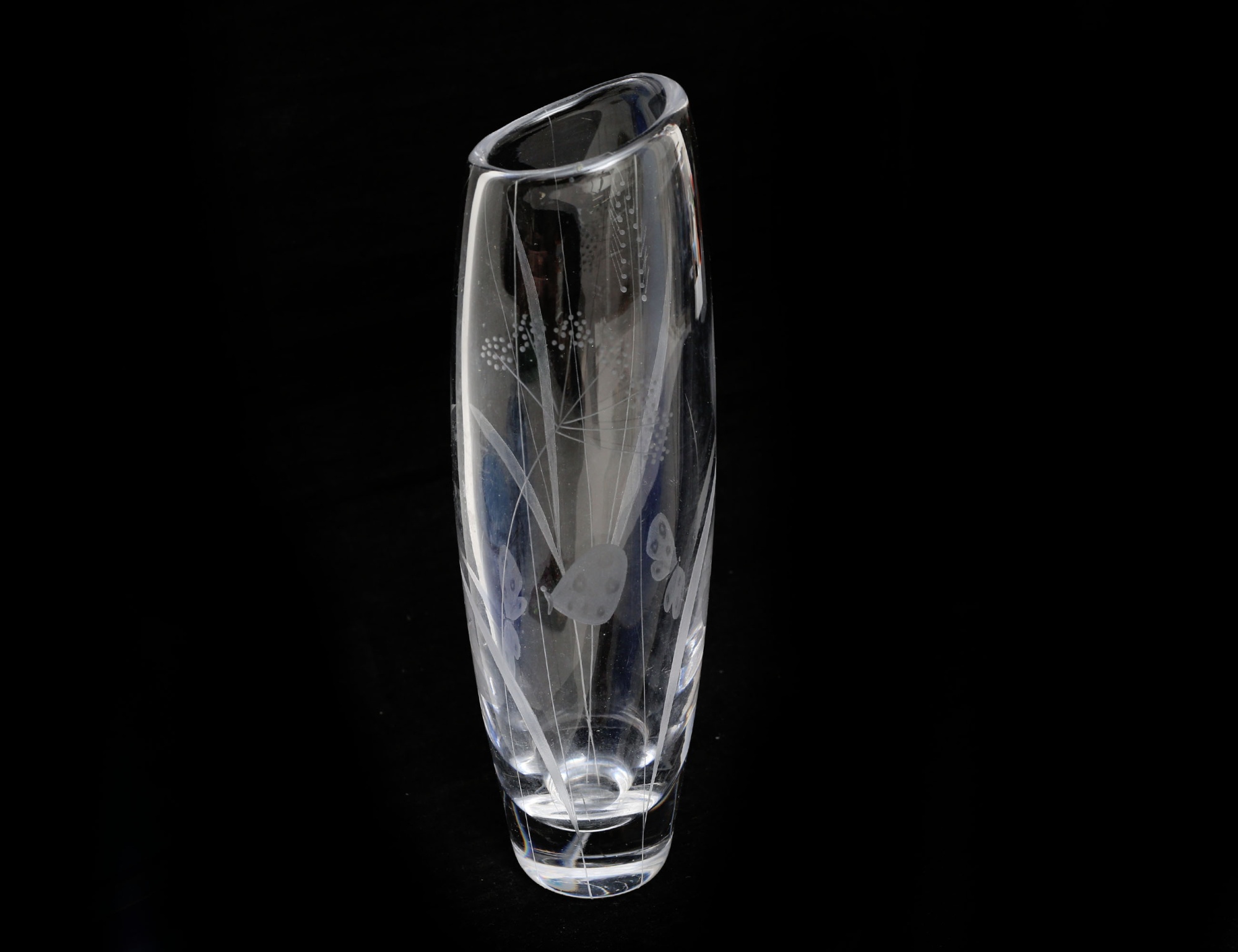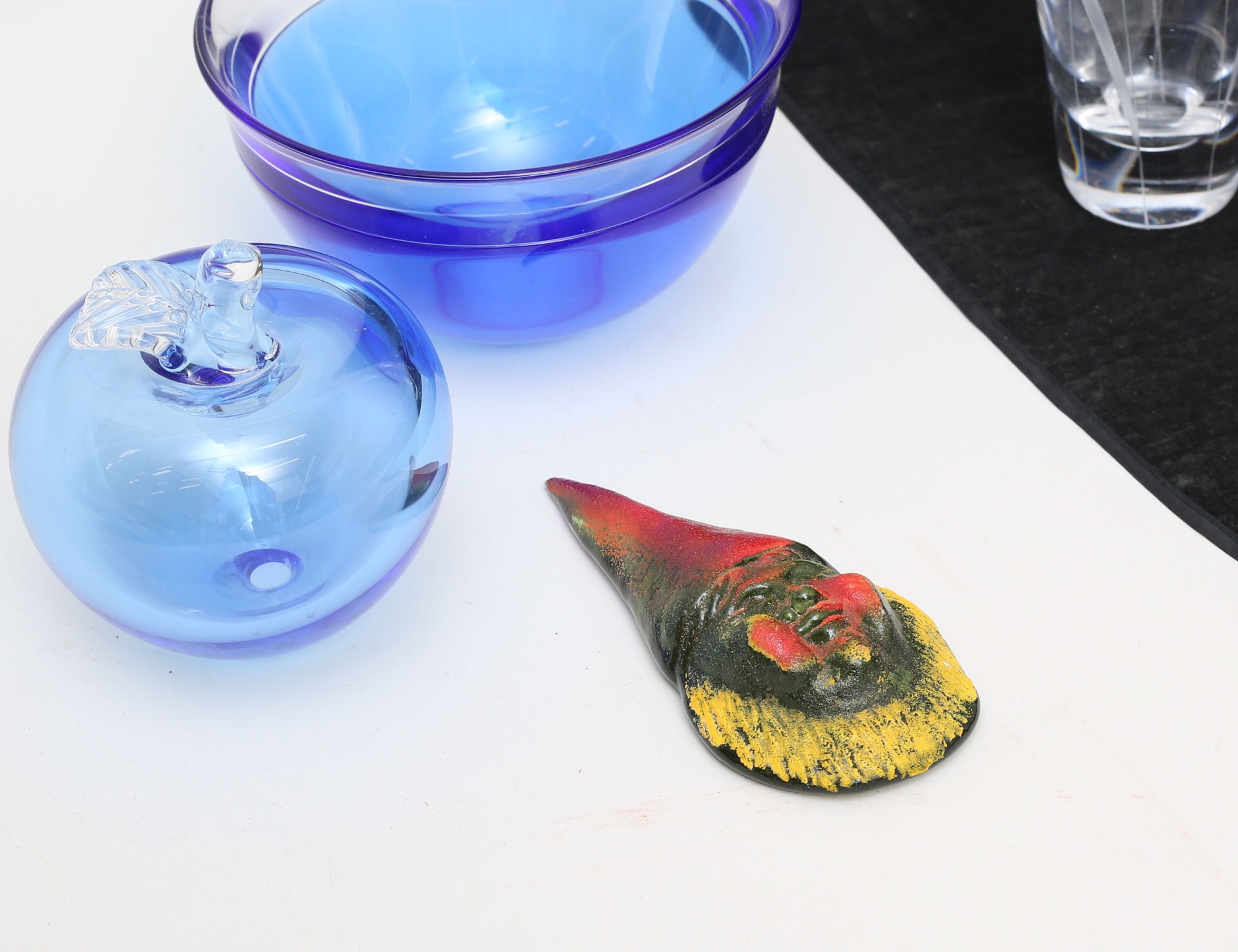 vas 1950-tal, signerad Vicke Lindstrand Kosta, höjd 29, skål "Neptunus" Lars Hellsten Orrefors, höjd 10, diameter 17, tomte signerad Kjell Engman, längd 16, äpple signerad Glasskolan OP-03, höjd 12