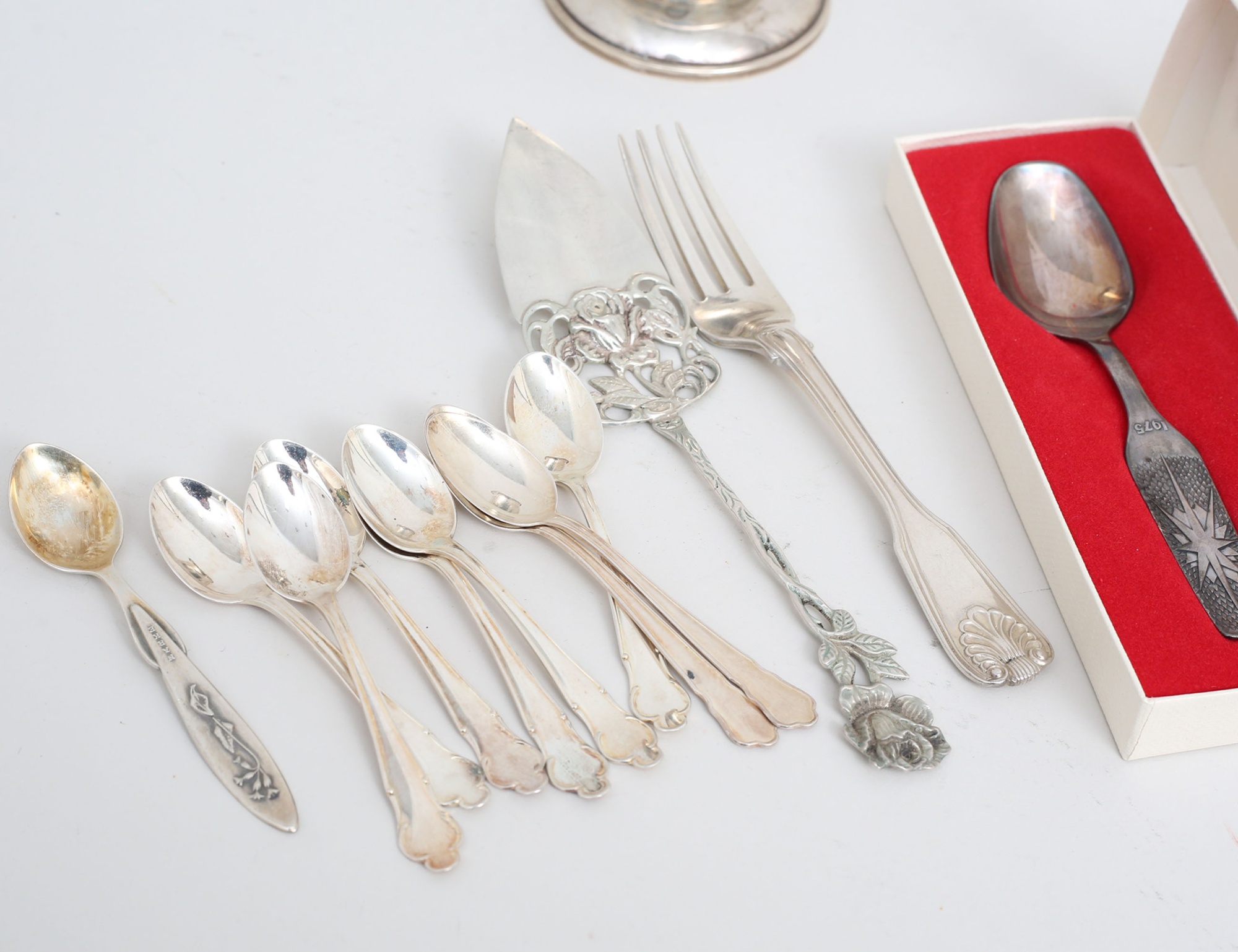 kakspade modell "Rosen", gaffel modell "Engelsk snäck" London 1843, 6 kaffeskedar modell "Disa", julsked, vas 1950-tal, höjd 16 (inskription), 2+1 kaffeskedar, vikt 347 gram
