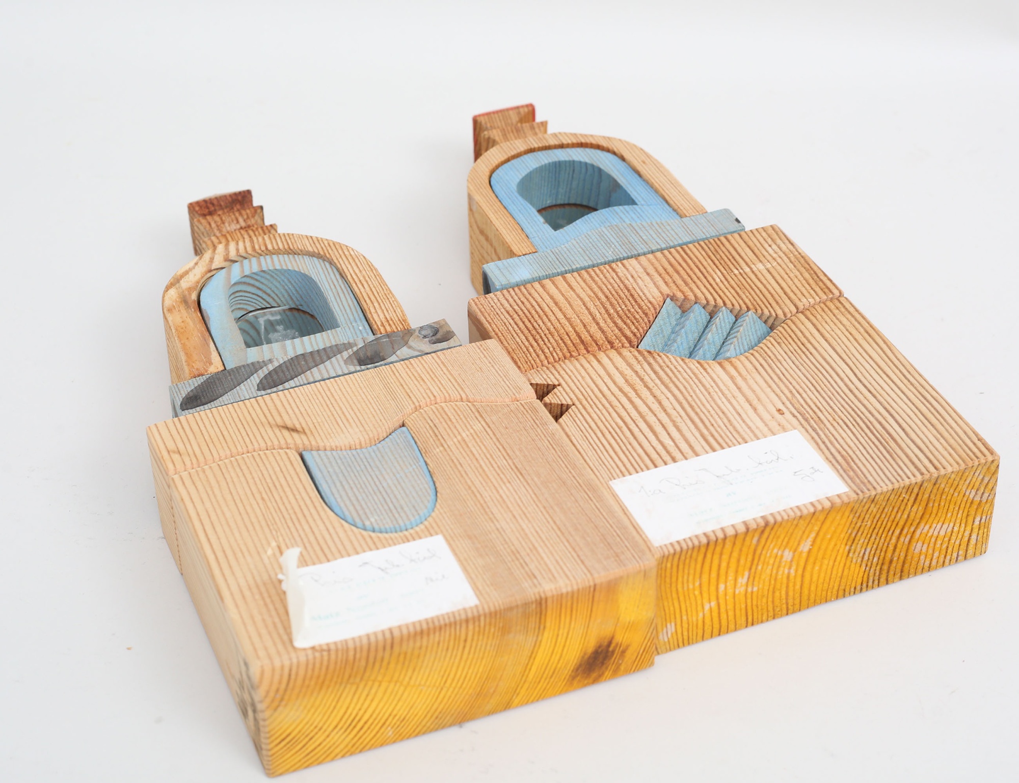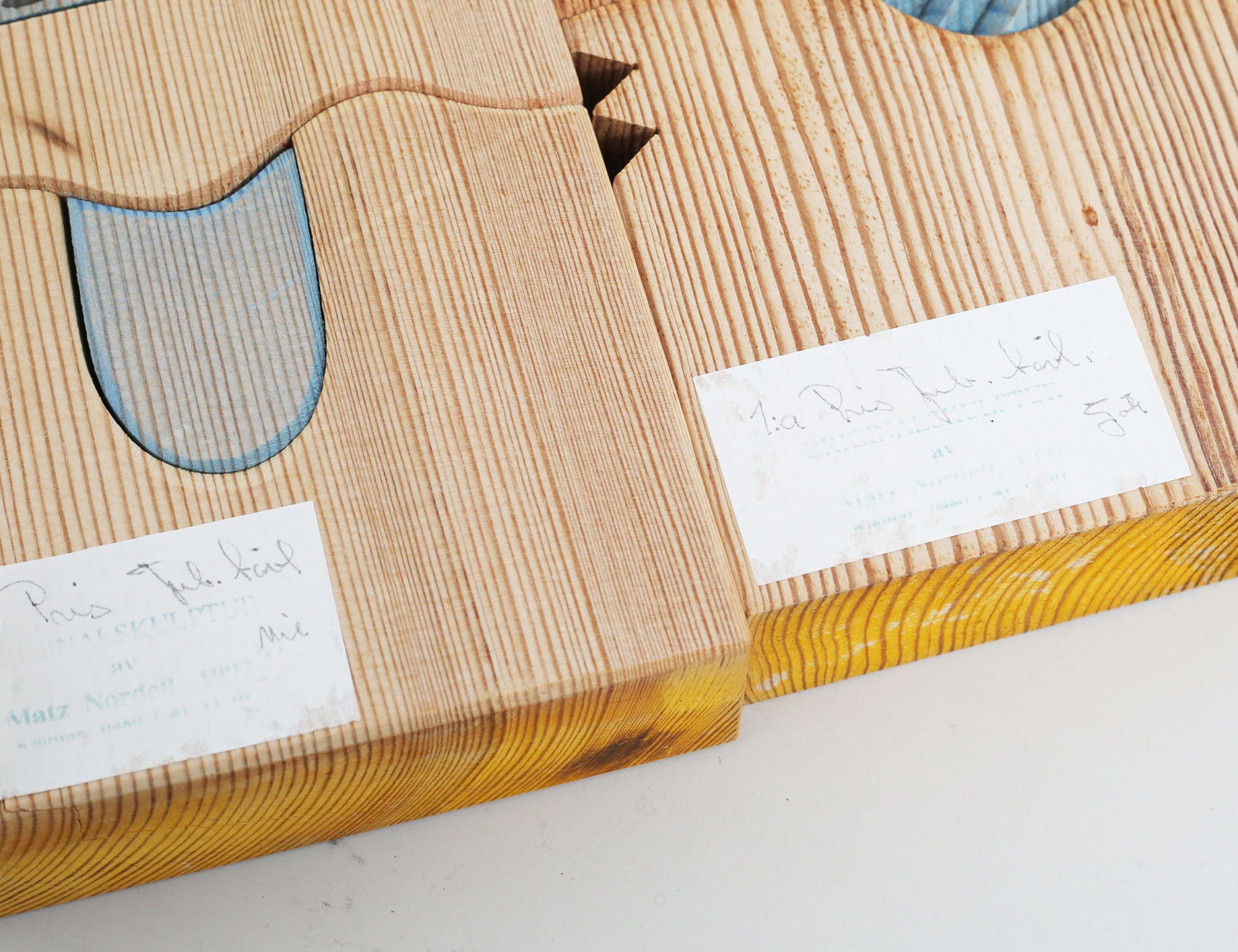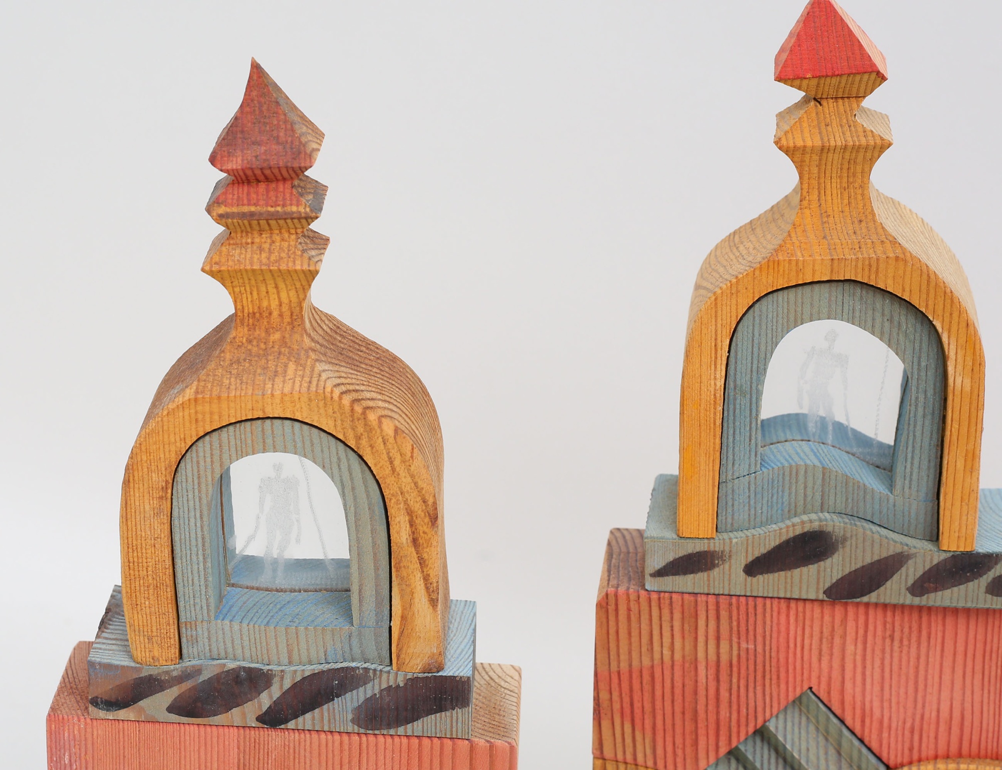 2 skulpturer skuret trä, delvis bemålade, detalj i glas, signerade 1997, etikettmärkta, höjd 32