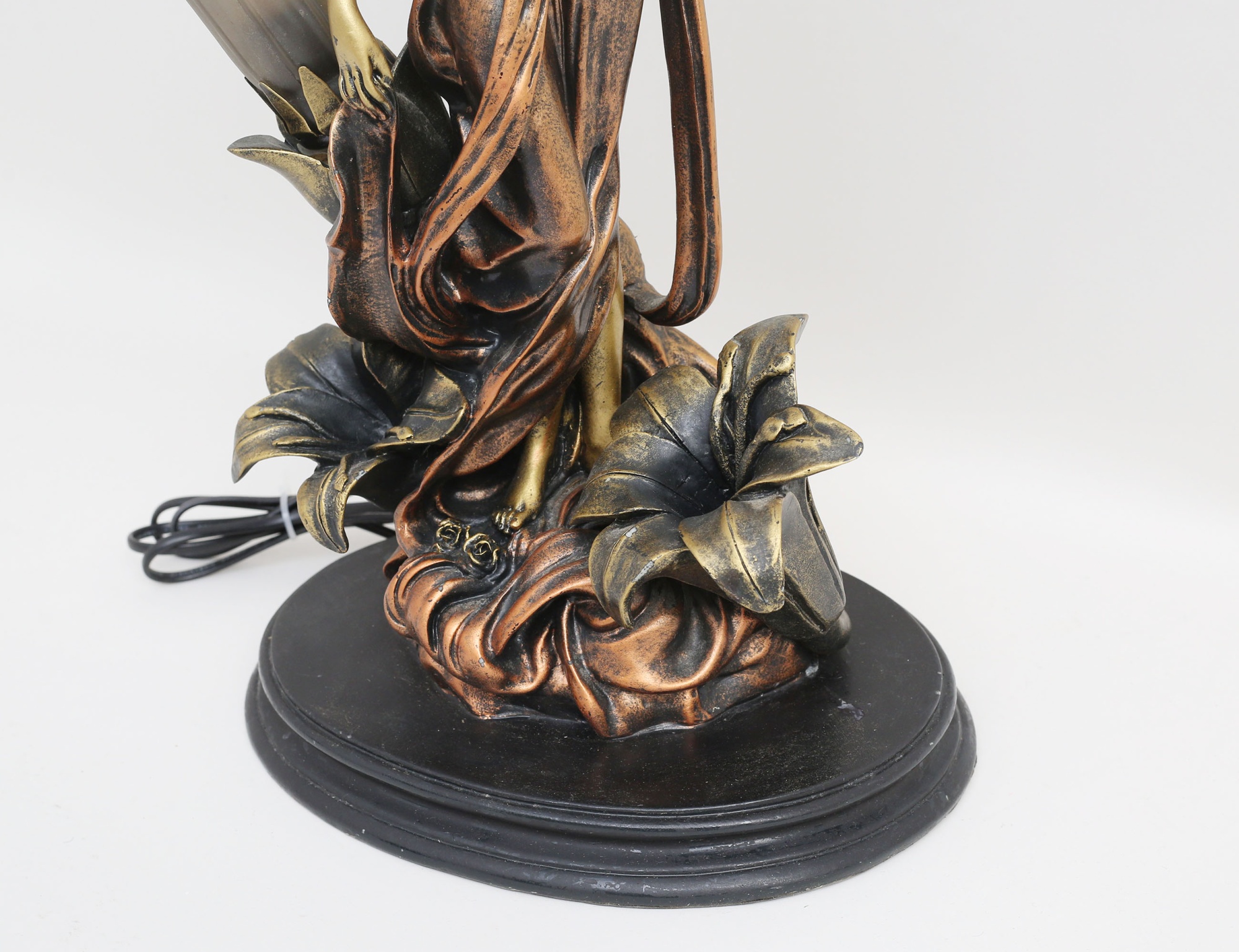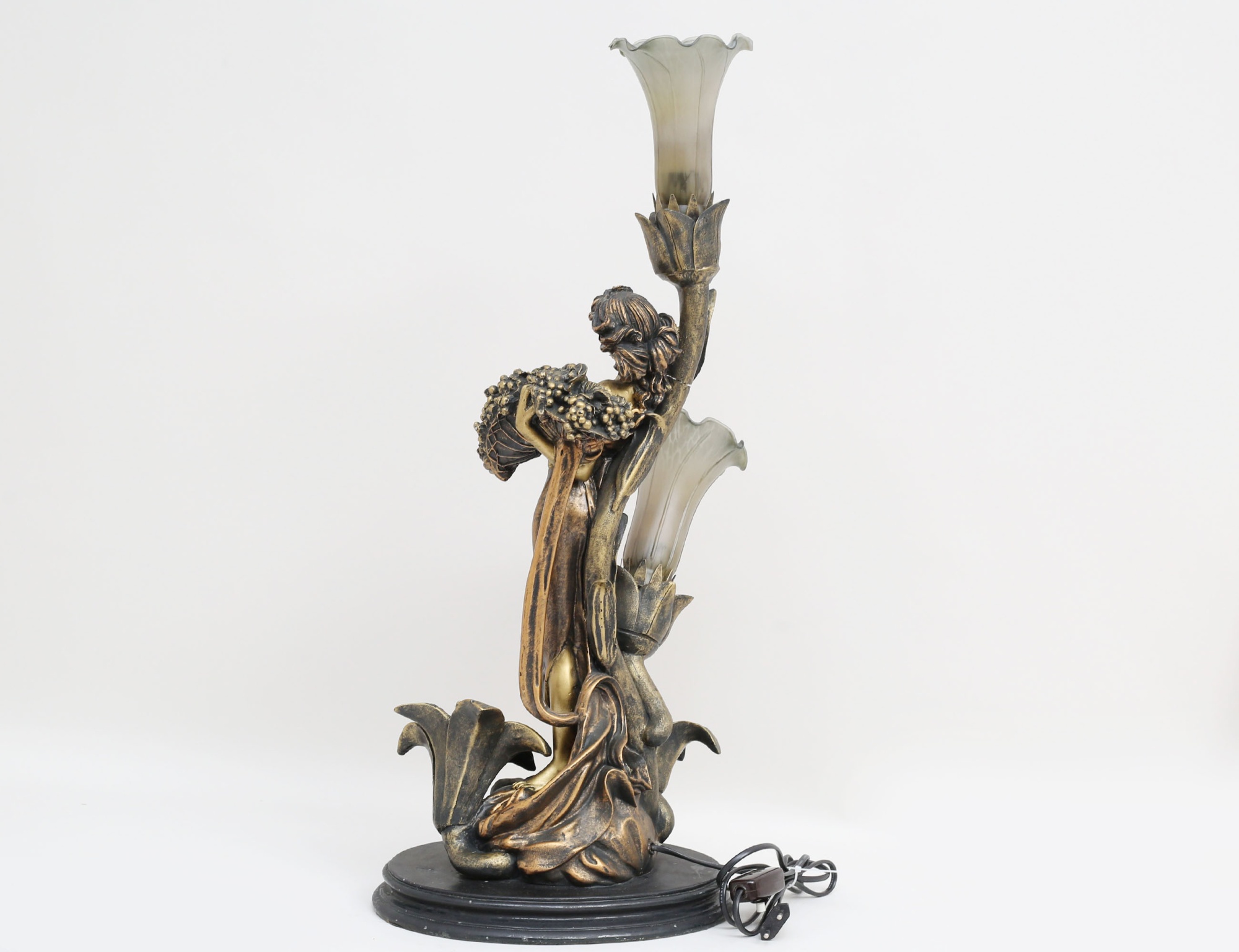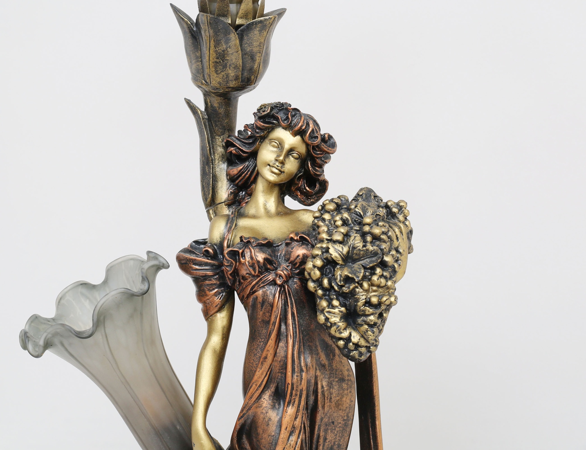 jugendstil, skulpterad konstmassa, kvinna bland blommor, två veckade kupor i melerat glas, höjd 70