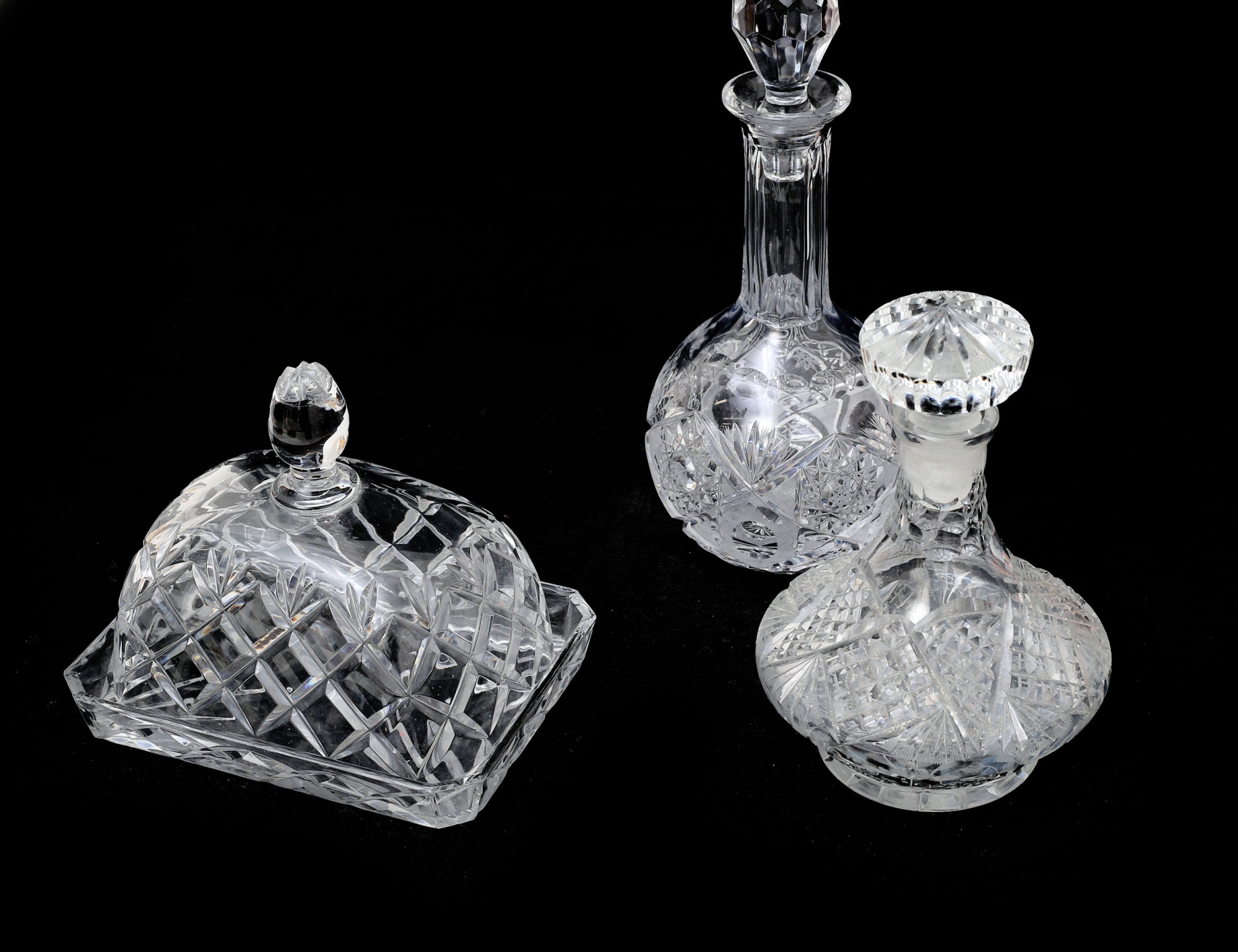 2 karaffer med propp, höjd 22/32, ostkupa med fat, 20x14 (smärre nagg på fat), vas Böhmen höjd 24
