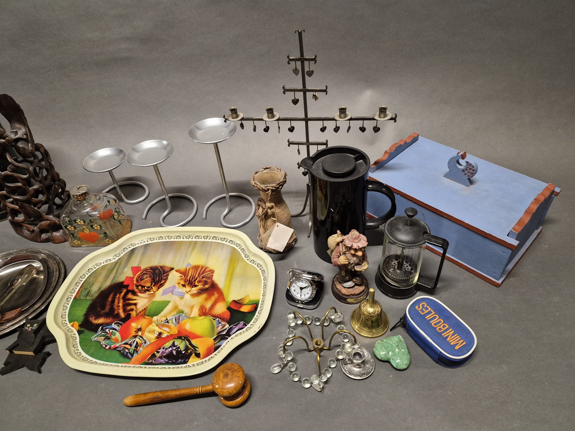 Parti bl.a bricka med katter & träskulptur, högsta 33 cm
