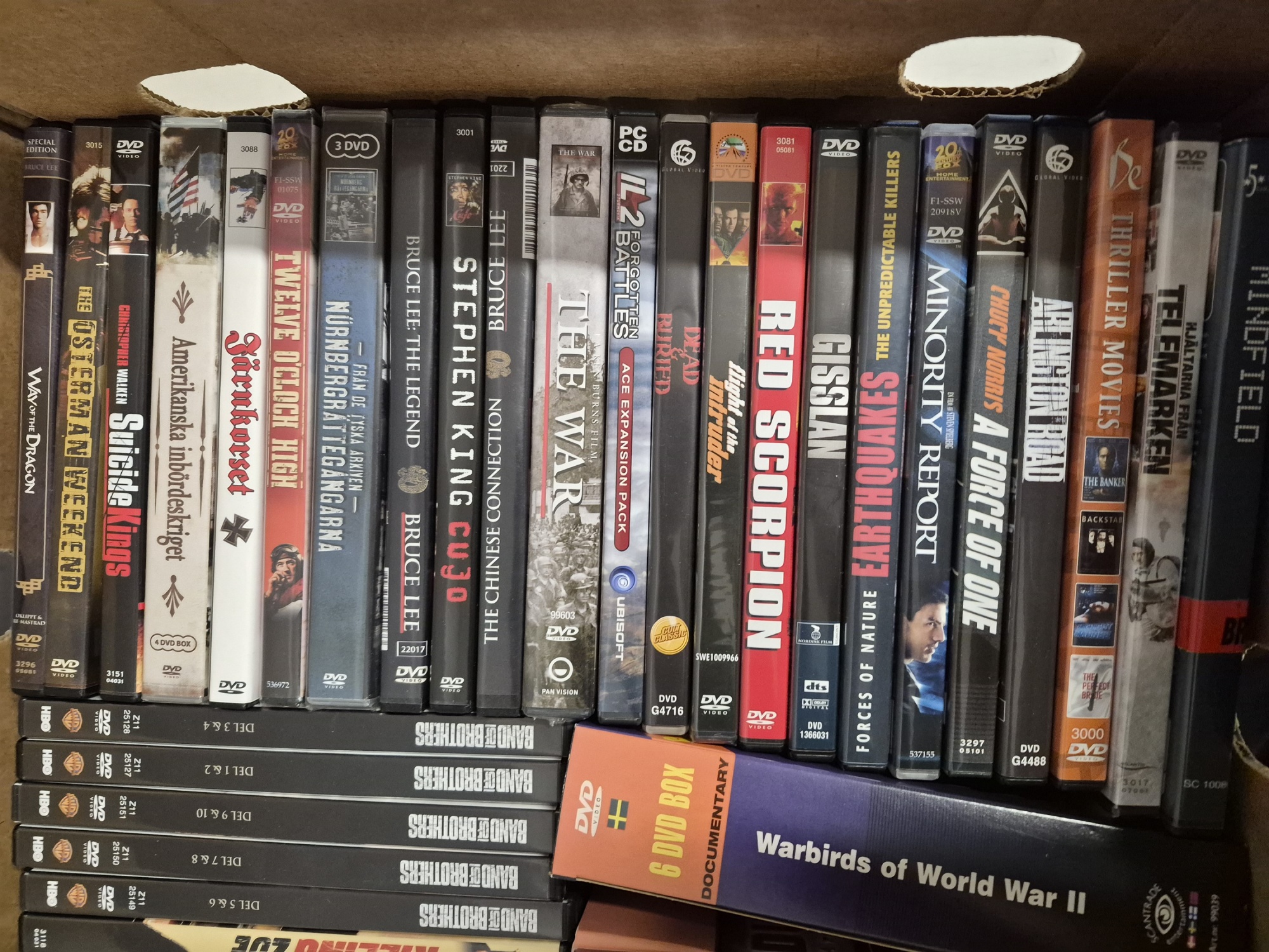 Bilder Parti DVD filmer och boxar, bl.a Band of Brothers, Bruce Lee filmer, Warfare, Stephen King Cujo och Killing Zoe