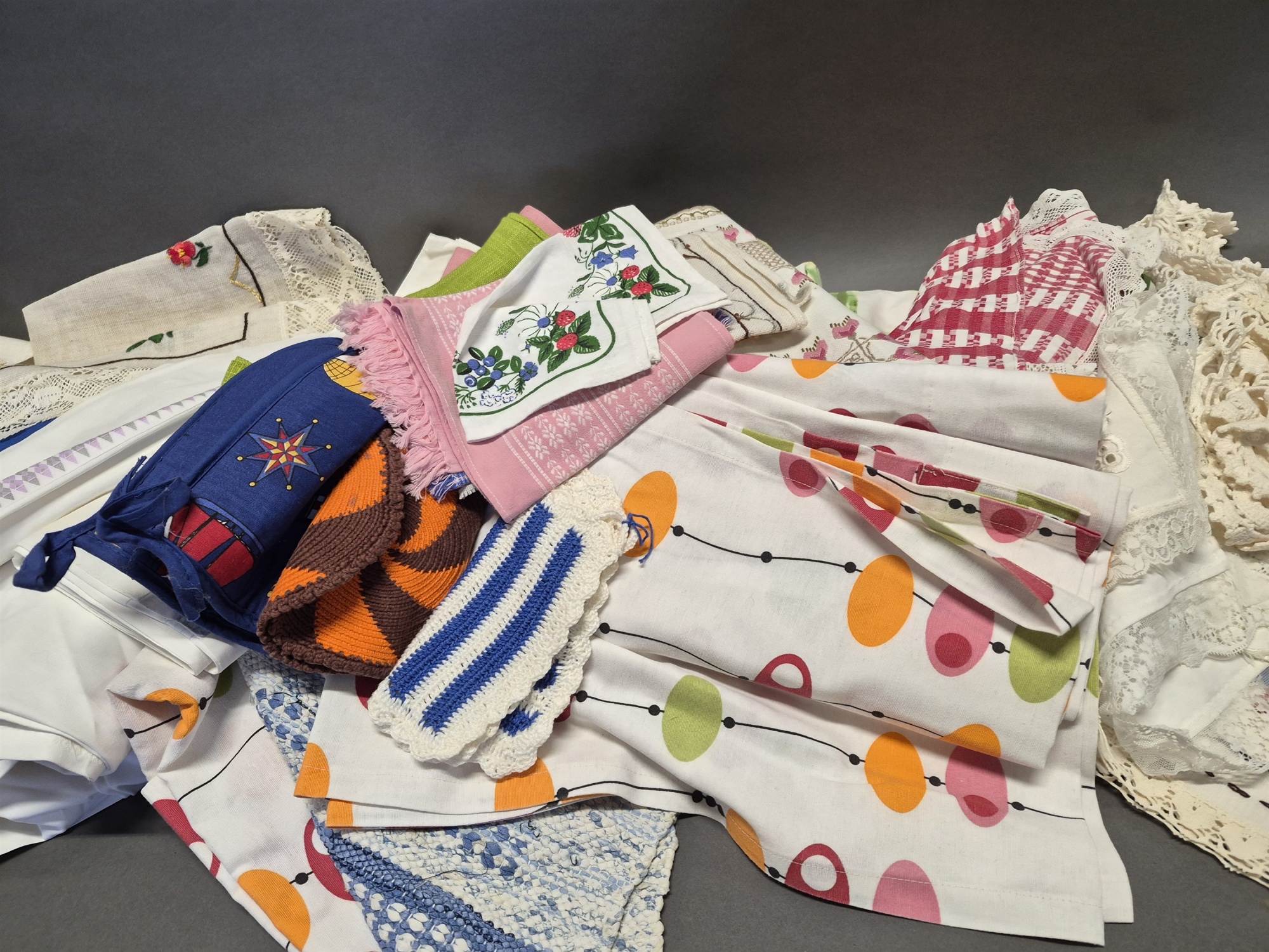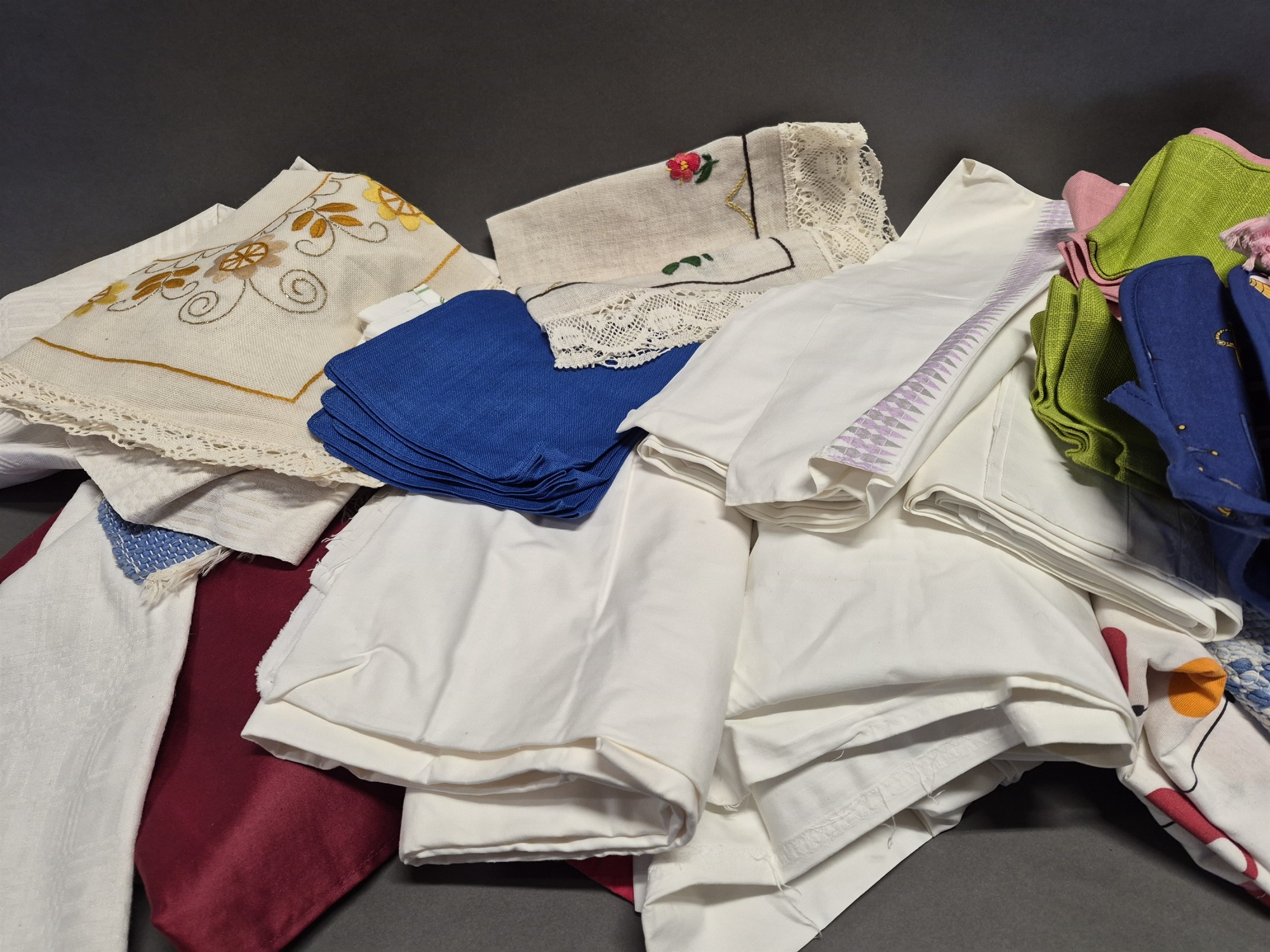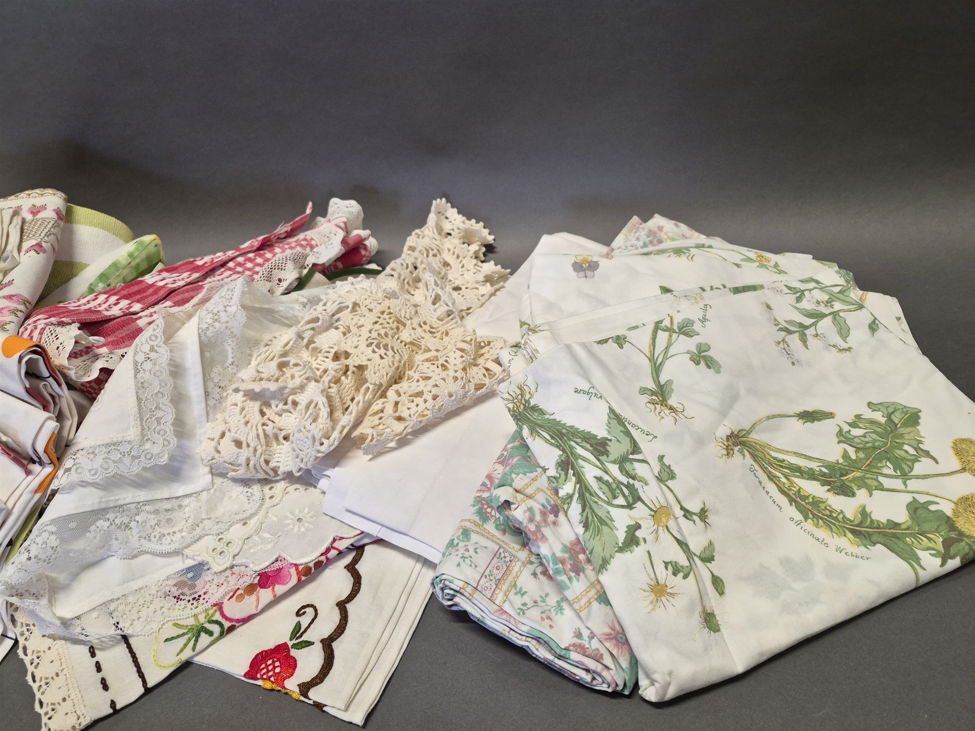 Parti textiler bla sänglinne och dukar, fläckar finns