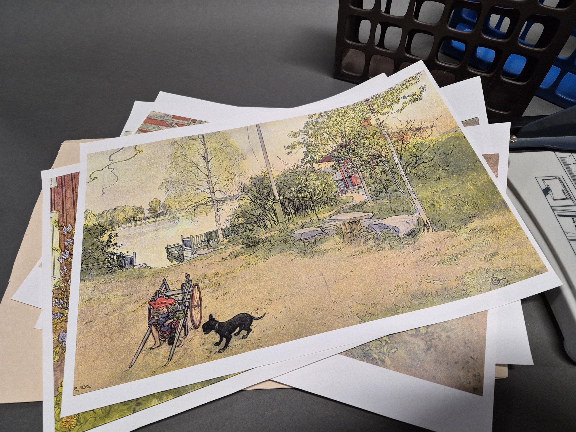 Bilder Parti kontorsmaterial bla pärmar & papperskärare och Carl Larsson tryck