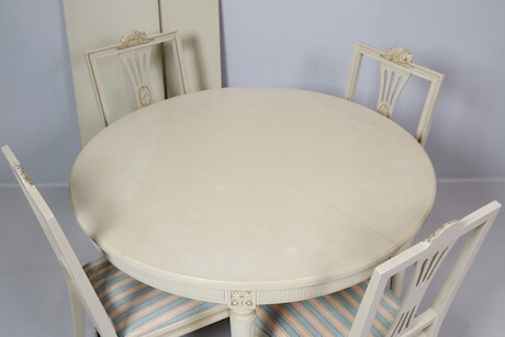Matgrupp Gustaviansk stil, bord D=11 + 2 st ilägg a40 H=72 och 4 stolar