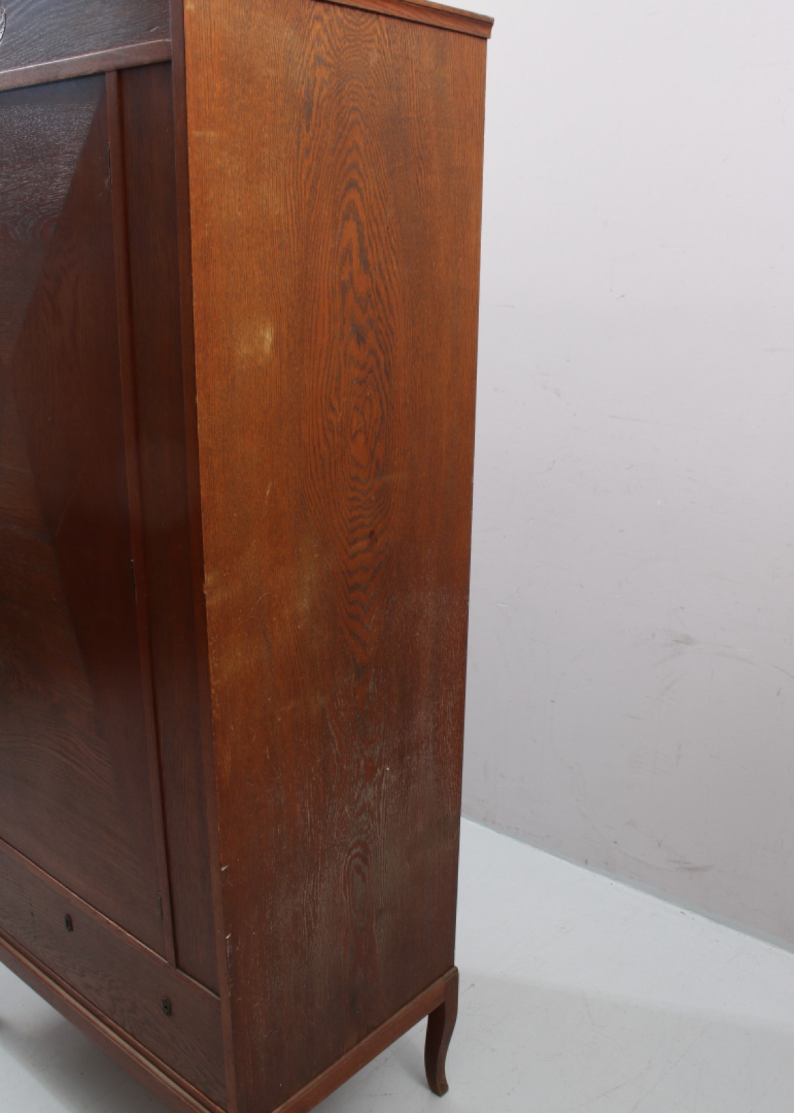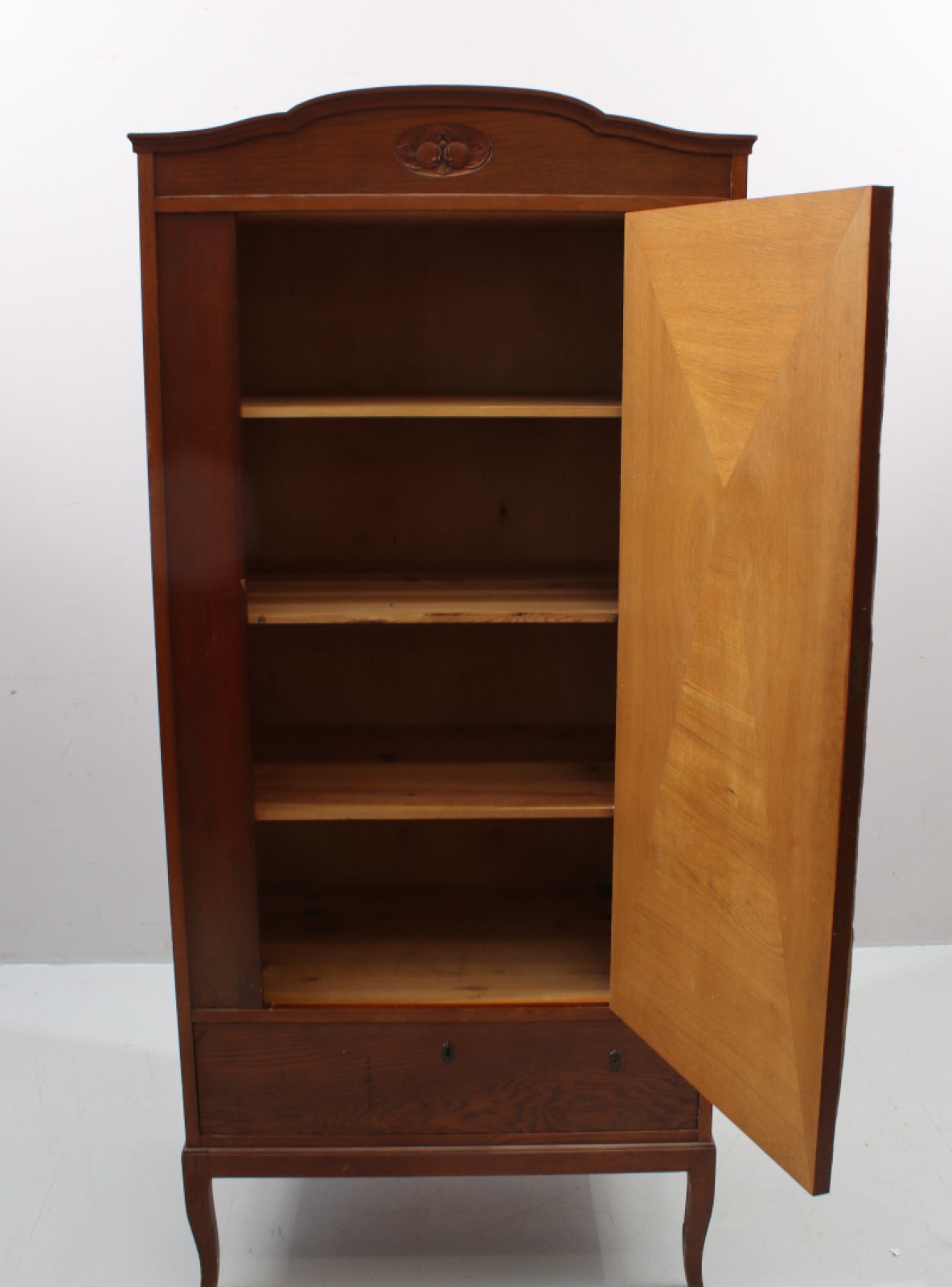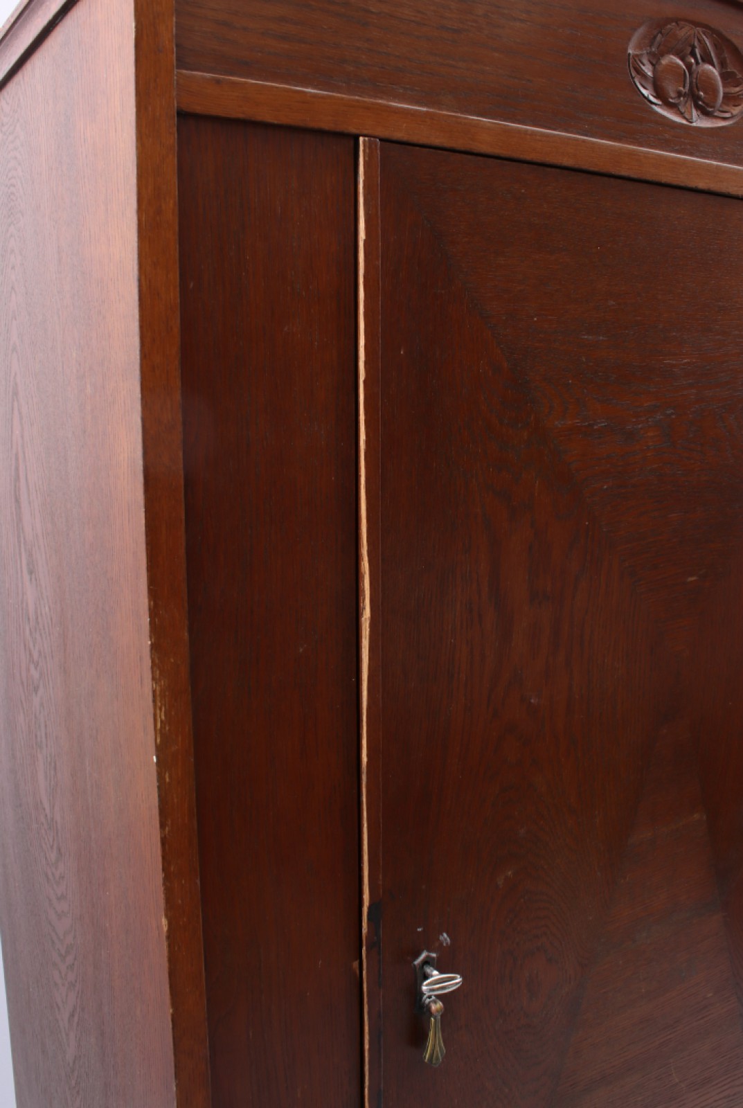 Fanerat med ek, krön med skuren dekor "Äpplen", 1920,30-tal, åldersrelaterat slitage dock dörrlist med skada (se bilder), H.180, B.80, Dj.50 cm. (vån1)