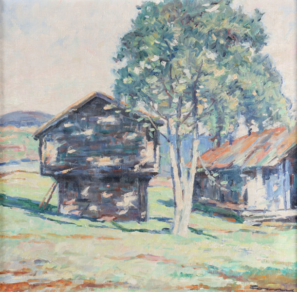Sigurd Fosnes(1877-1943): Gård, olje på lerret. 48x49 cm.