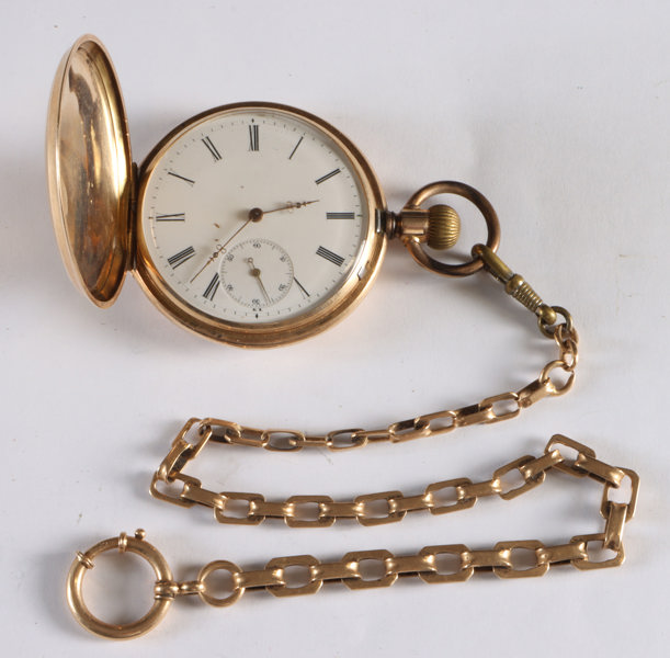 Lommeur i gull med lenke i gull(ytterste ledd ikke i gull.). D: 5,2 cm. Vekt: Klokke 94 gram, band 25,5 gram.