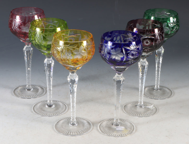 6 vinglass med farget klokke, Bømisk type. H: 21 cm.