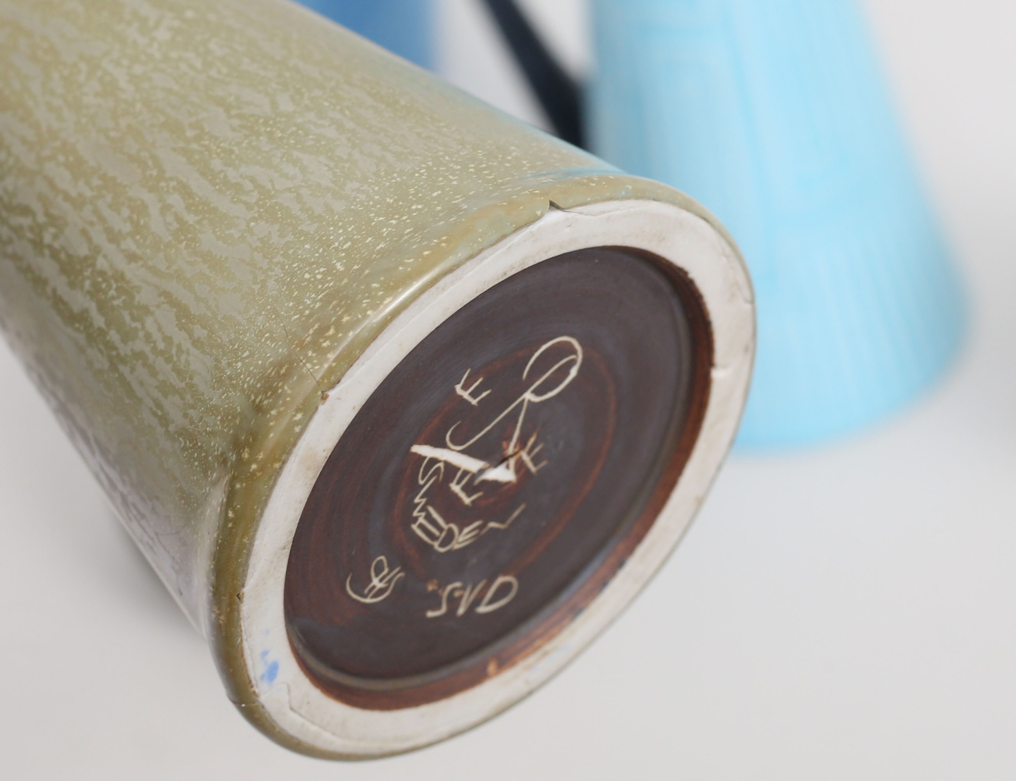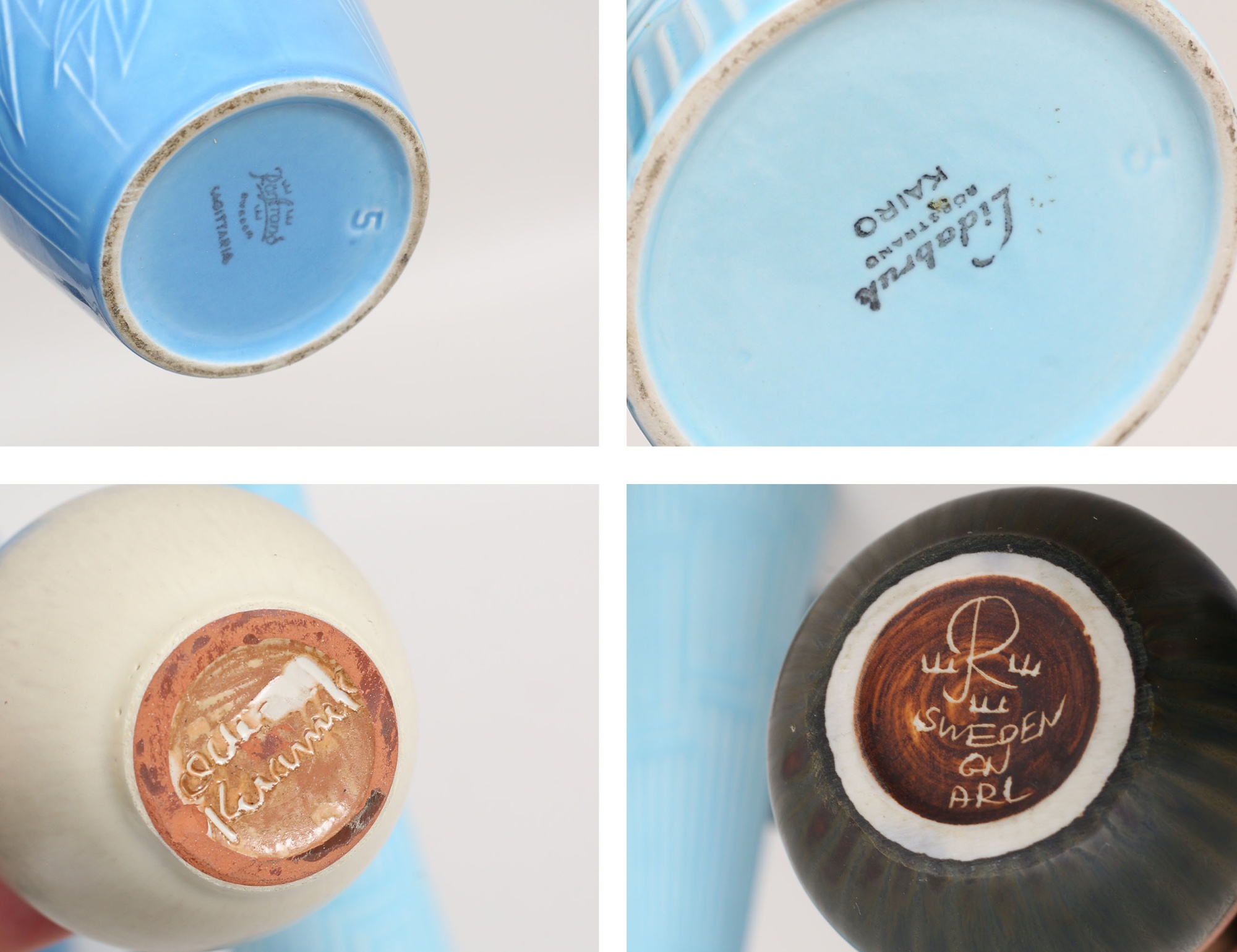 Gunnar Nylund - hänkelvas glaserat stengods, höjd 20, Carl Harry Stålhane - vas glaserat stengods, höjd 22 (lagad), samt kanna "Sagittaria" höjd 29, vas "Kairo" höjd 25, vas glaserat stengods oidentifierad formgivare, höjd 10 (5)