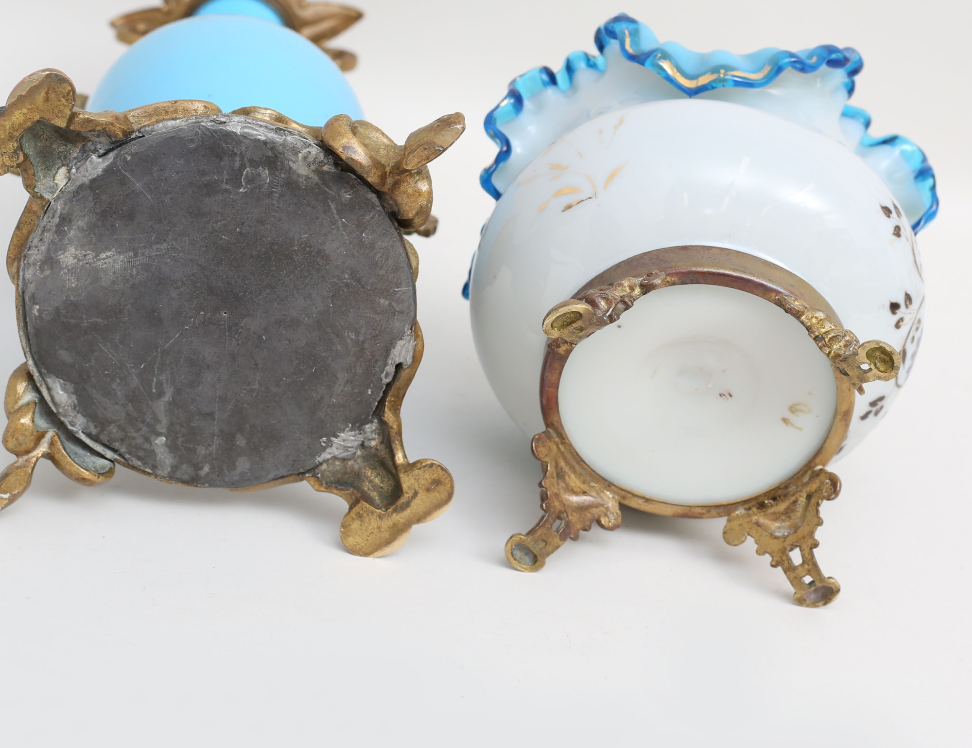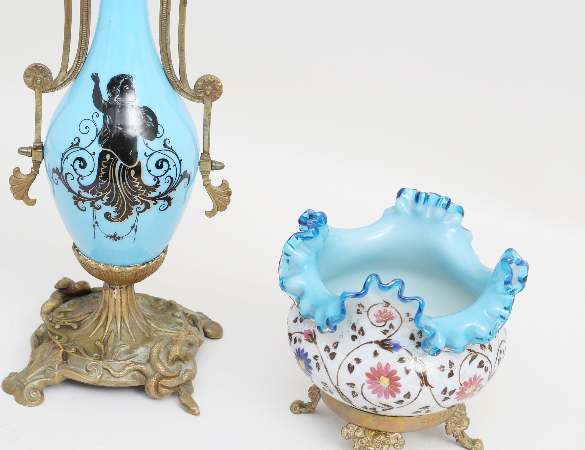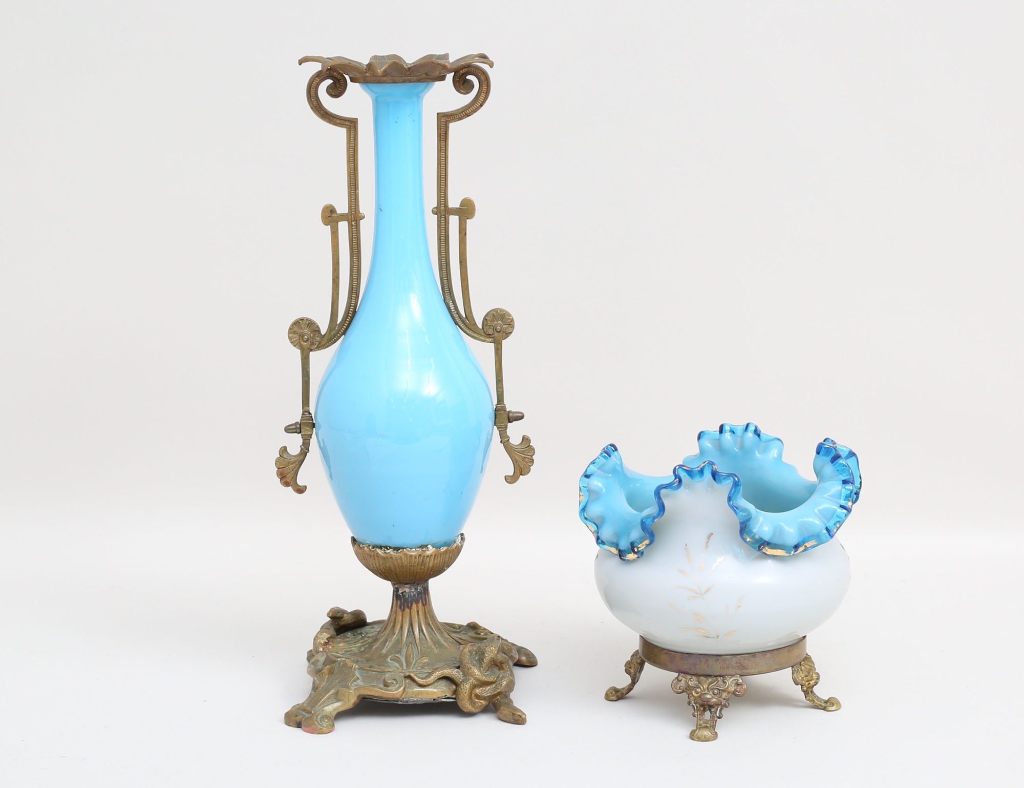 opalinglas med dekor i svart och guld, skulpterad brons med ormdekor, höjd 36, skål c.1900, opalinglas och mässing, höjd 15 (personnummer) (2)