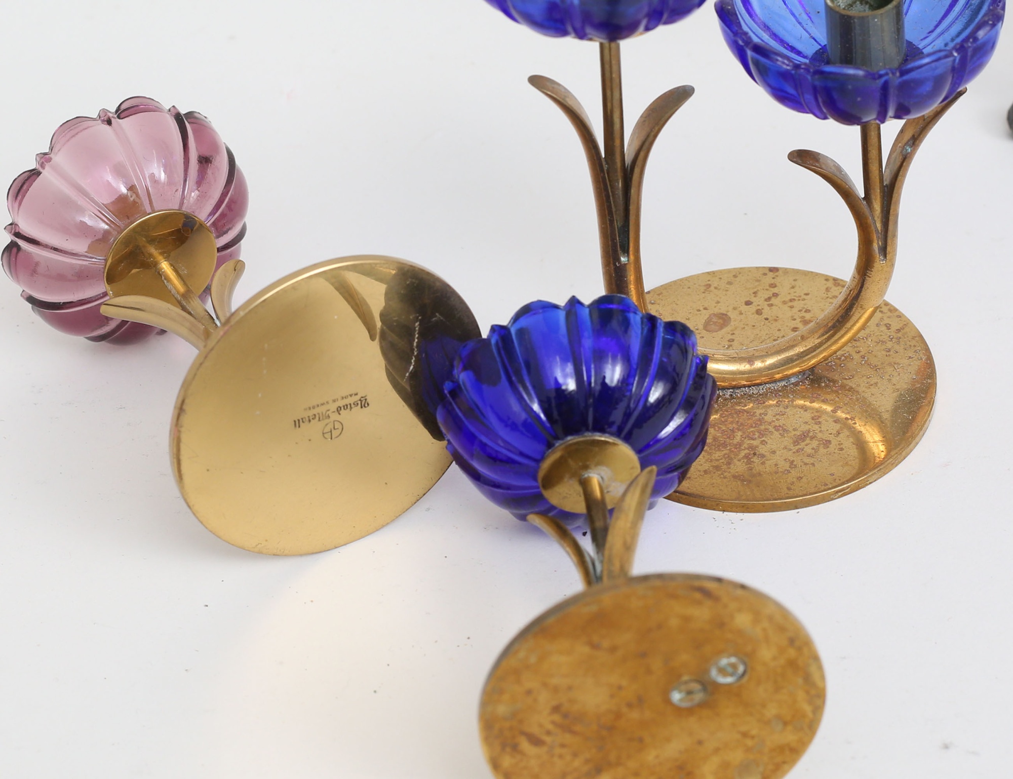 kandelaber för två ljus och ljusstake, smide och glas, höjd 23/19, ljusstake för två ljus och två ljusstakar Ystad Metall, mässing och glas, höjd 12/9, 1 par ljusstakar nysilver (ej G. Ander)