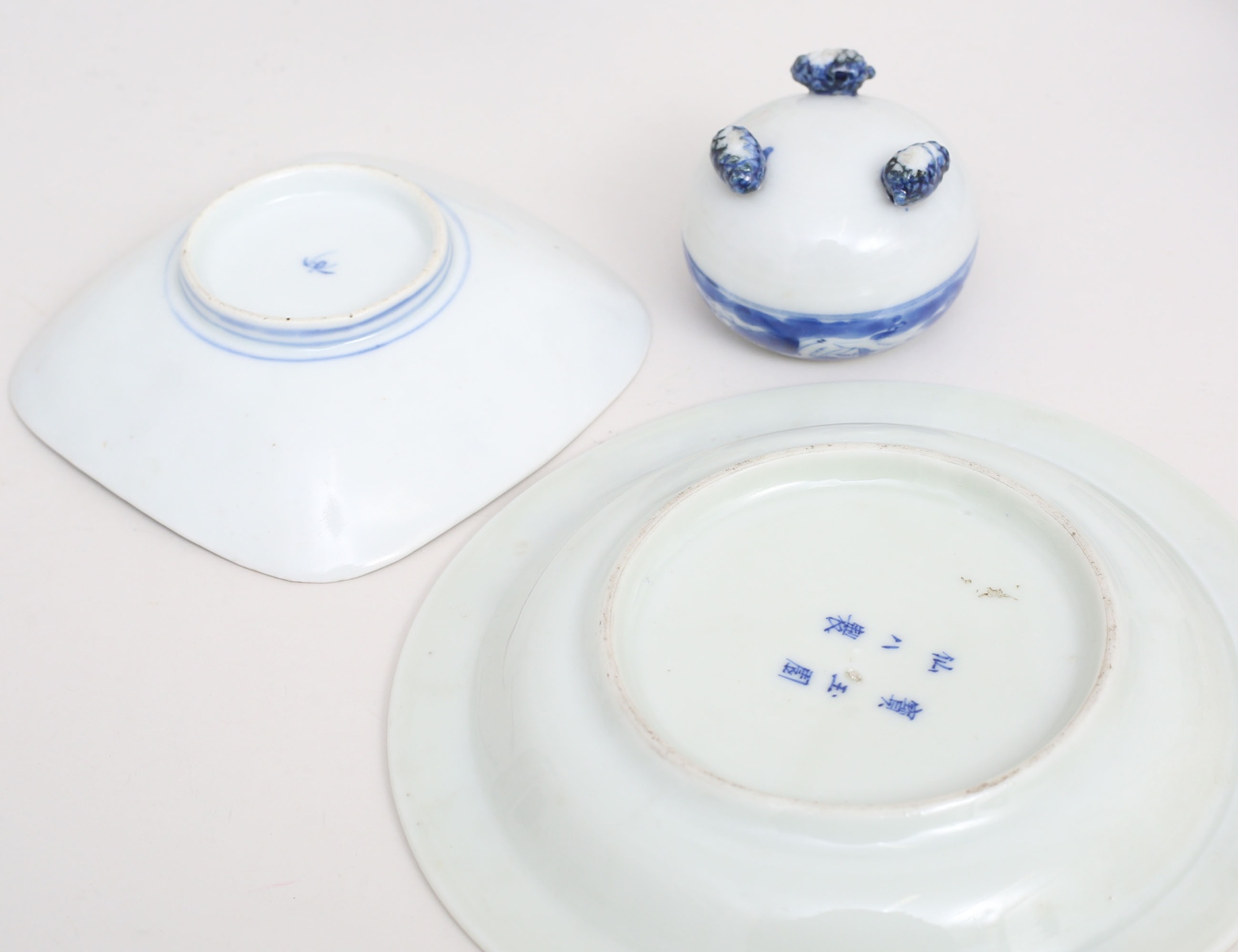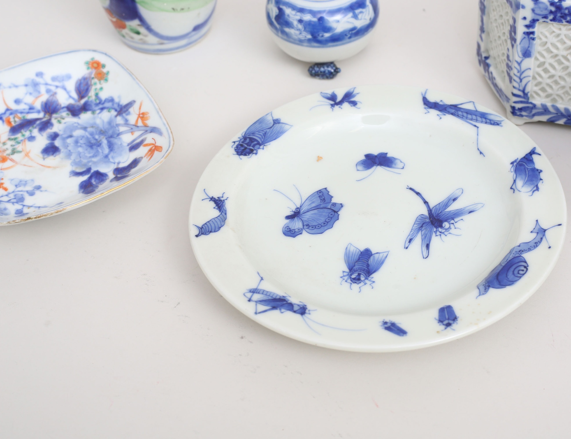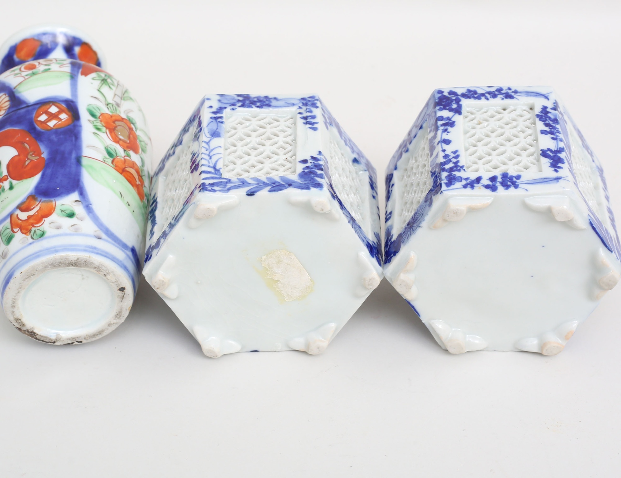 ljuslyktor 1 par, genombruten dekor, höjd 9, vas på kulfötter höjd 5,5, fat 13x13, assiett diameter 8,5, - blåvit underglasyrdekor, vas Imari höjd 18