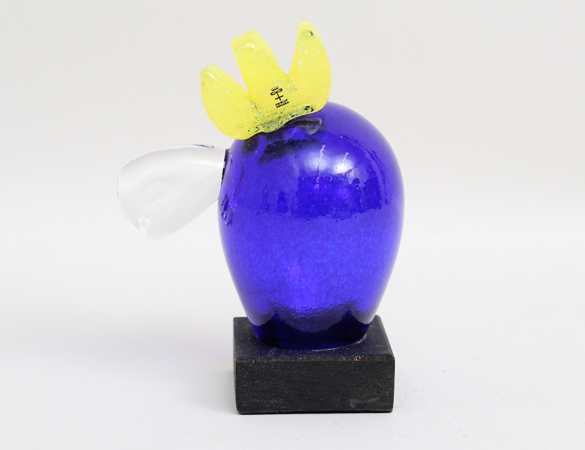 glas i form av fågel, monterad på träsockel, osignerad, etikettmärkt, höjd 11,5