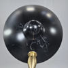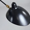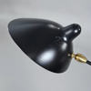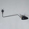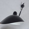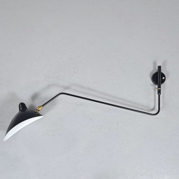 Vägglampa designad av framstående franske formgivaren Serge Mouille år 1954. Handgjord. Asymmetrisk aluminiumskärm, svartlackerad arm i stål och detaljer i mässing. Nypris ca 34 000:- inkl. moms.