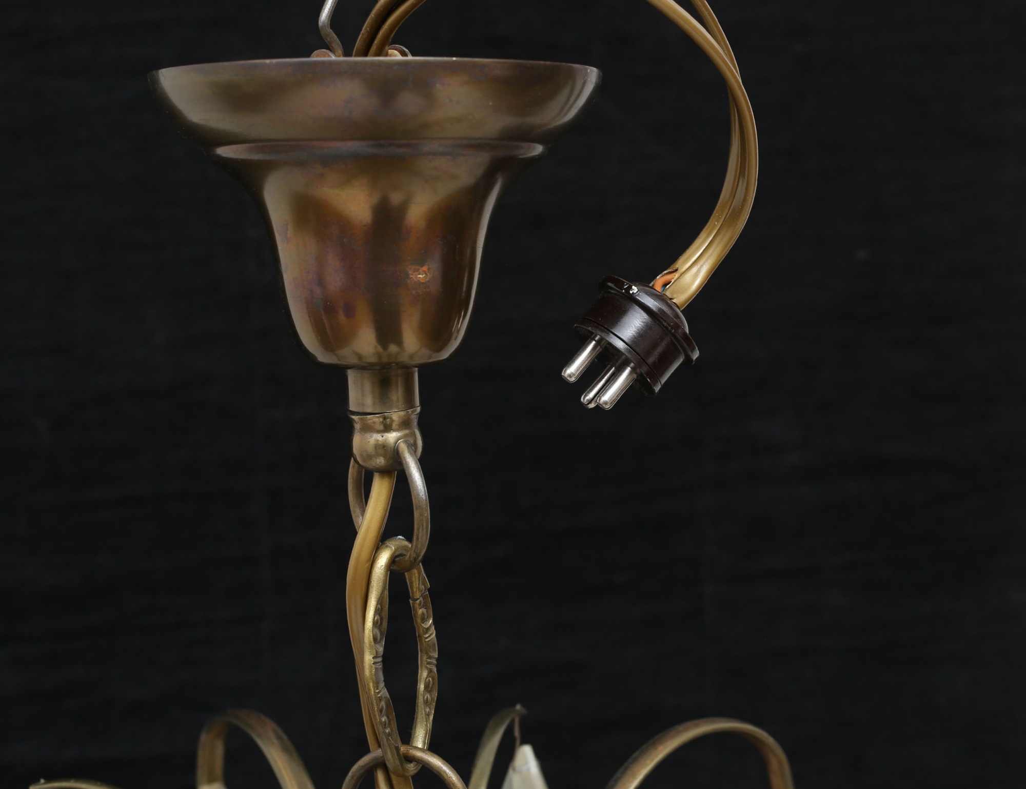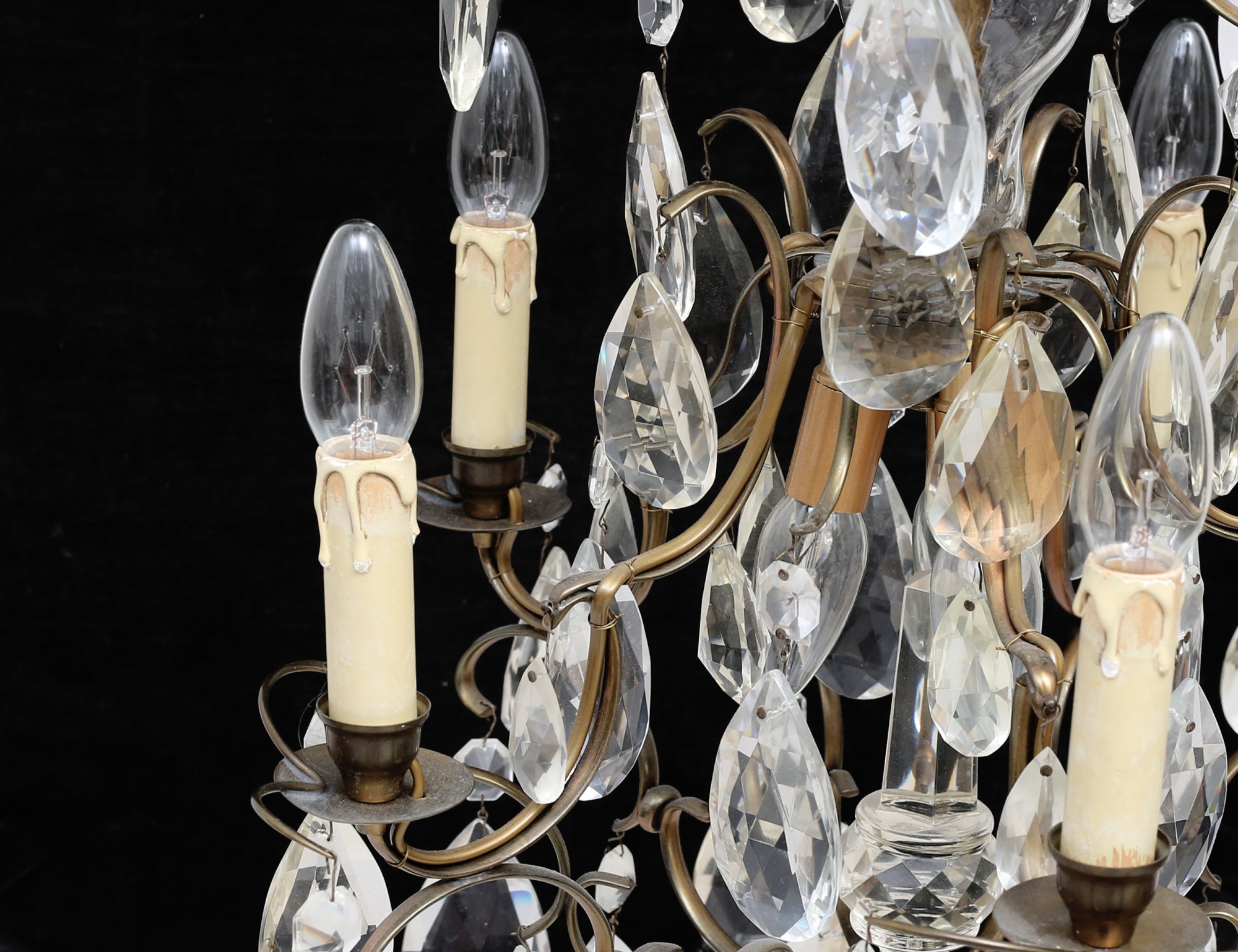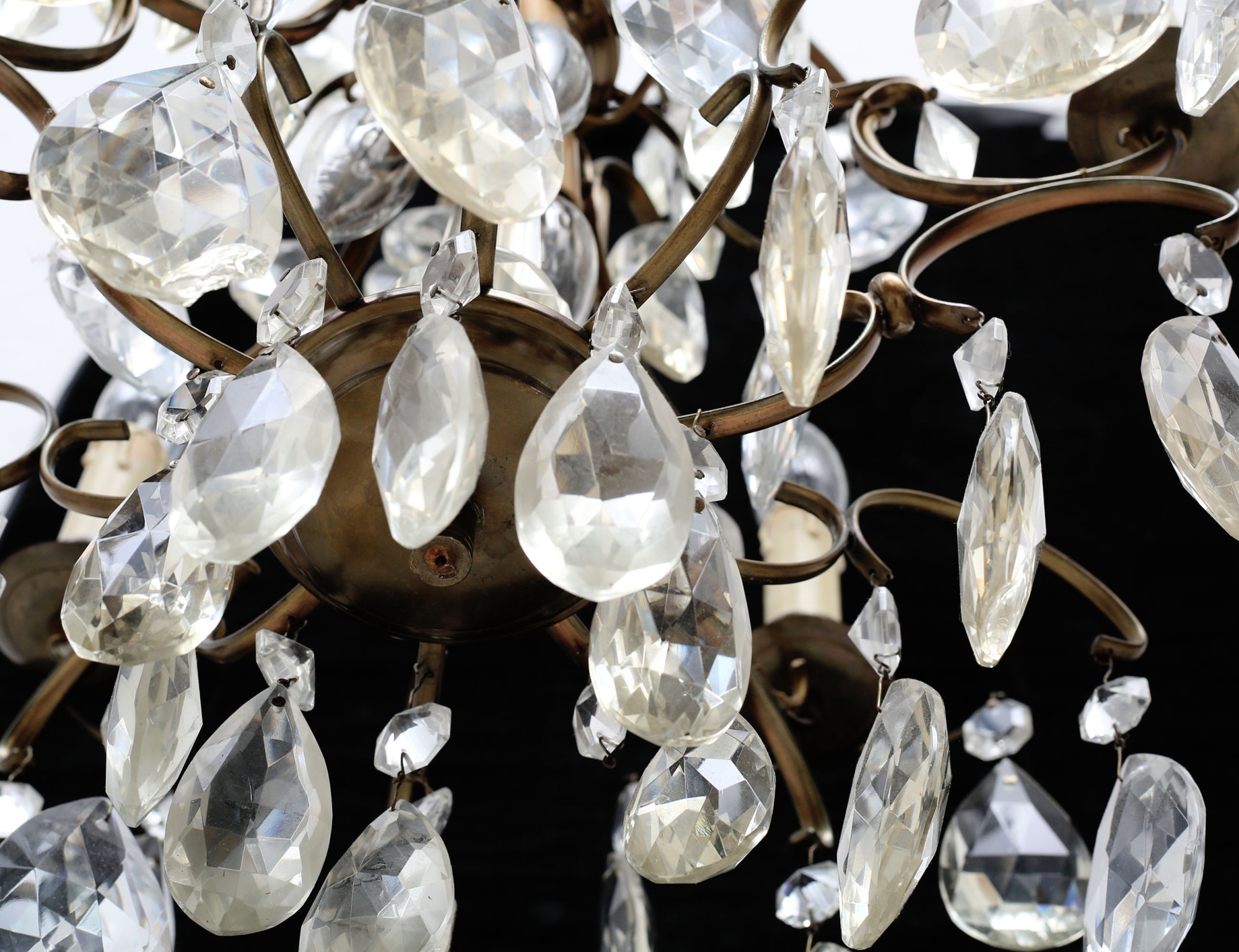 stomme i patinerad mässing, fem ljusarmar, fasettslipade droppformade prismor, glasobelisk, höjd 80, diameter 50