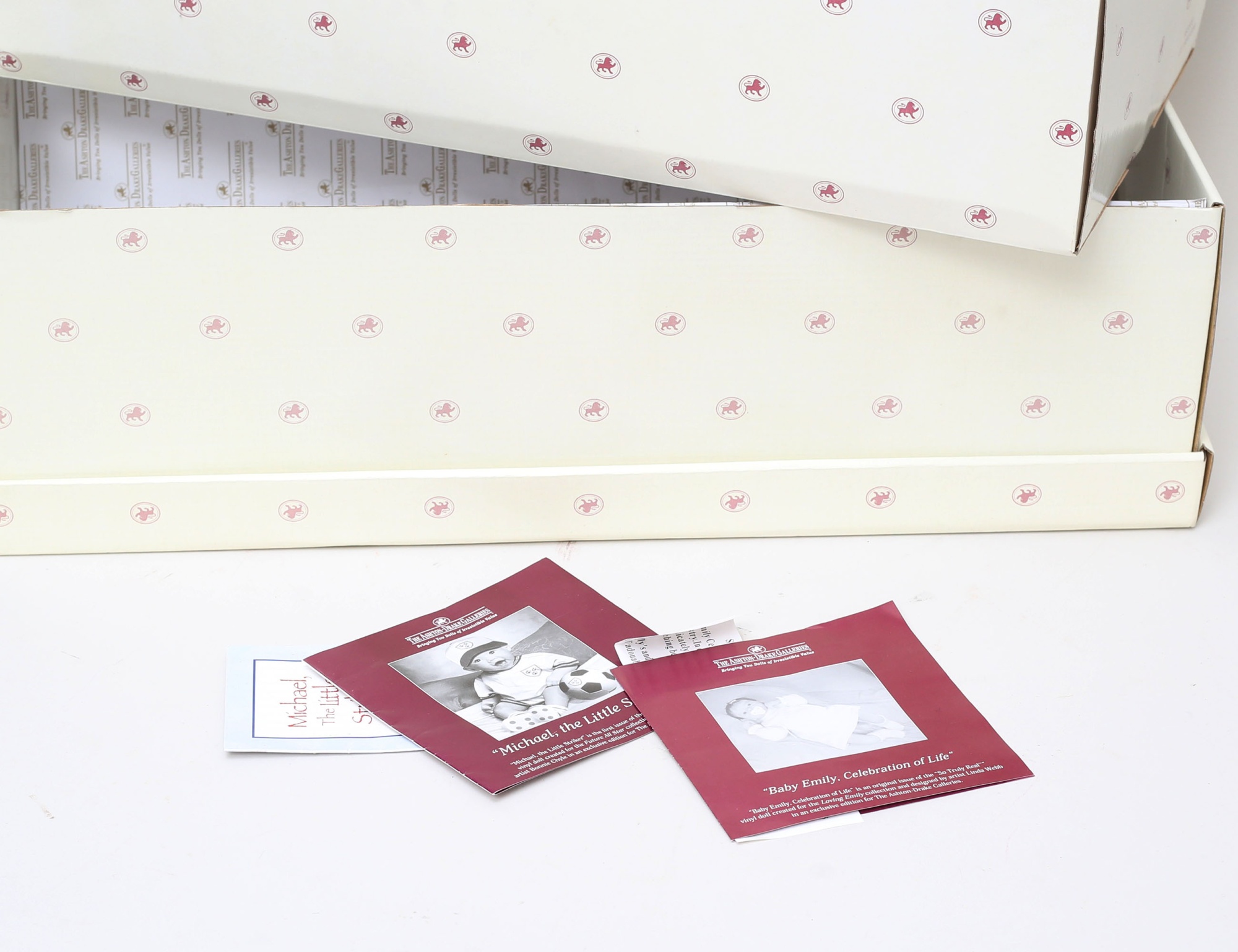 2 realistiska dockor, "Michael the little striker" (boll saknas, smärre bruksslitage), samt "Baby Emily celebrations of life", originalkartonger m.m., längd ca. 52