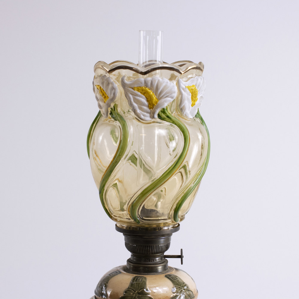 Fotogenlampa, majolika, jugend, bemålad kupa, Matadorbrenner, sannolikt kompletterad med ovandel från annan lampa, höjd ca 64 cm