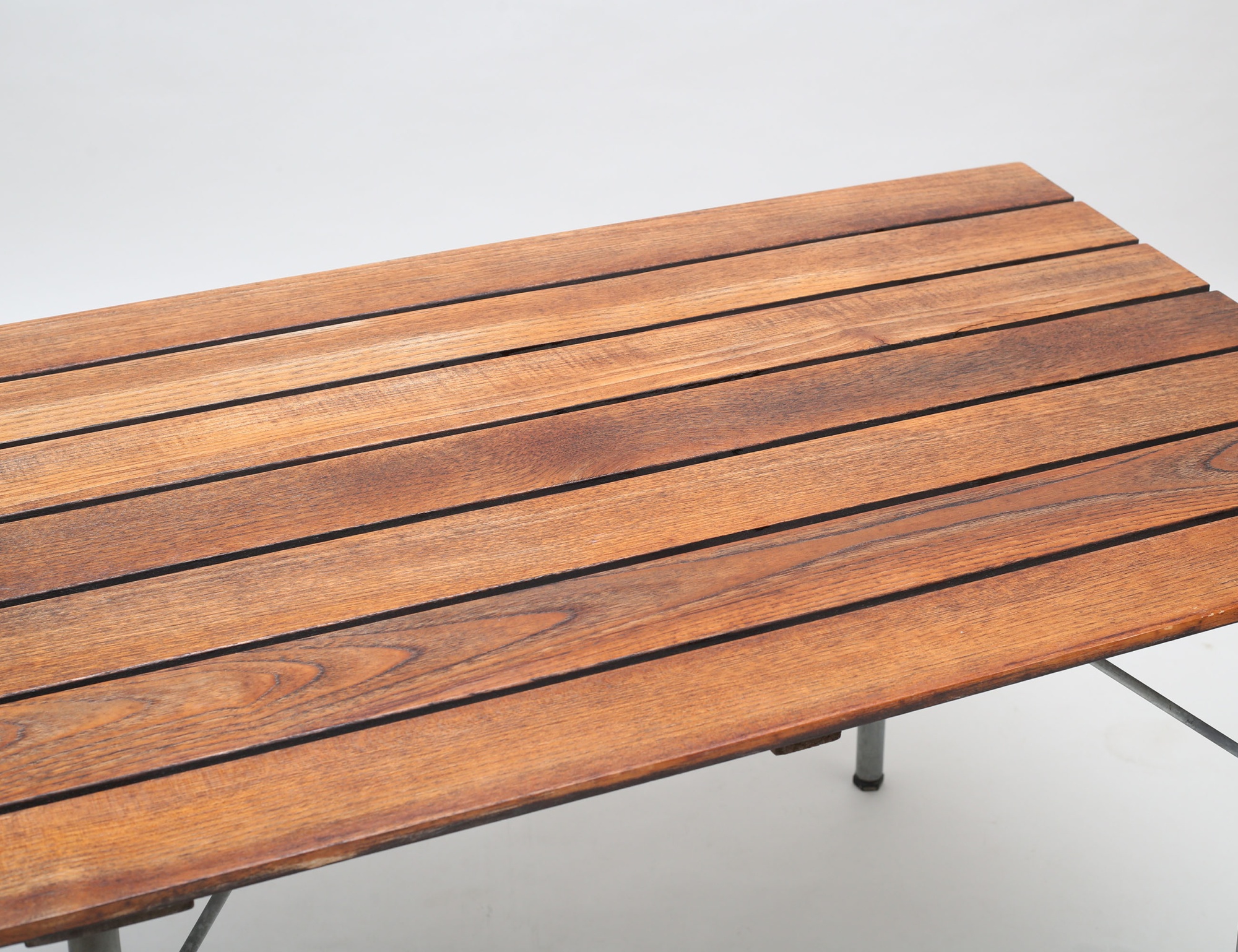 stomme i stål, hopfällbart, träribbor i teak, höjd 70, bredd 120x70