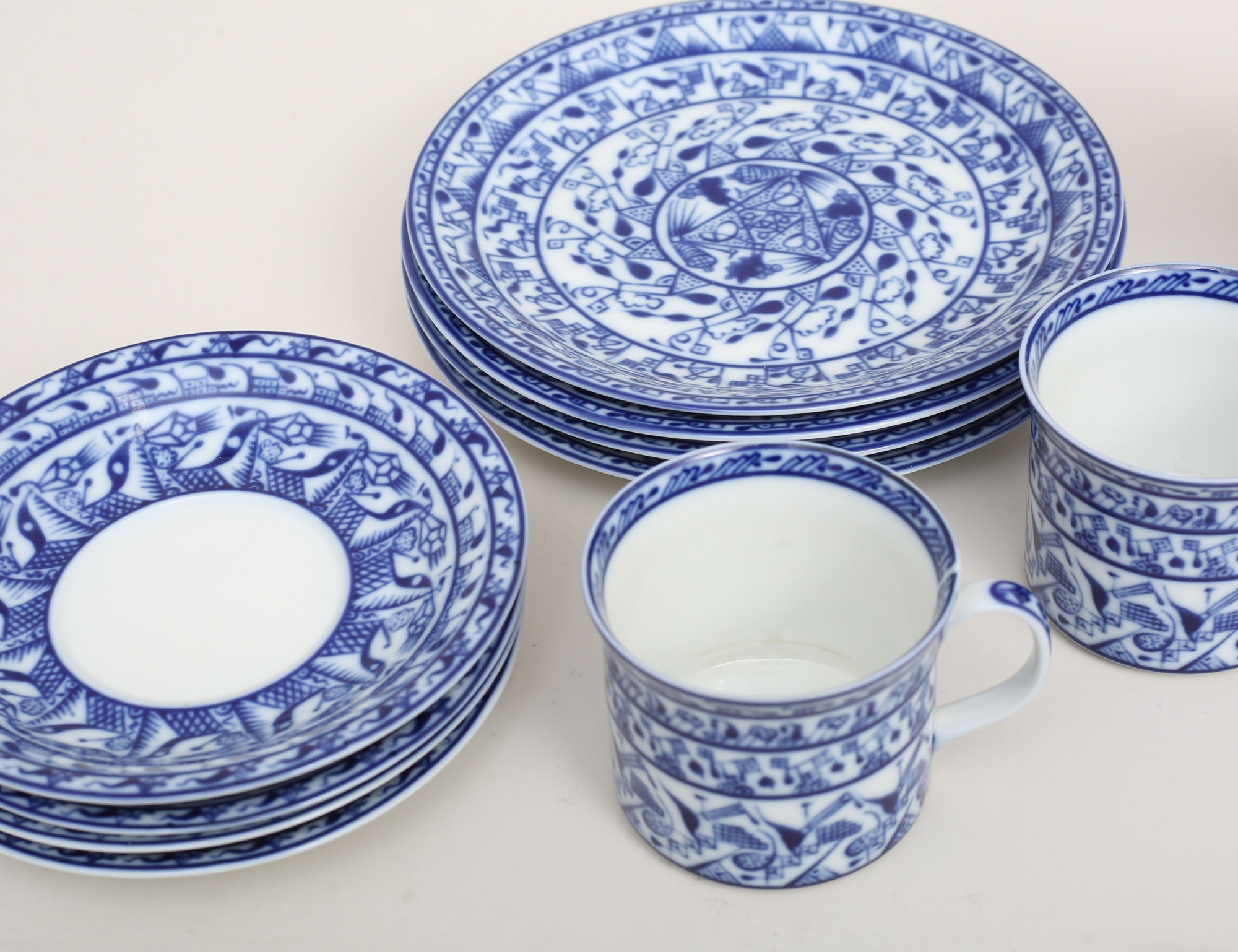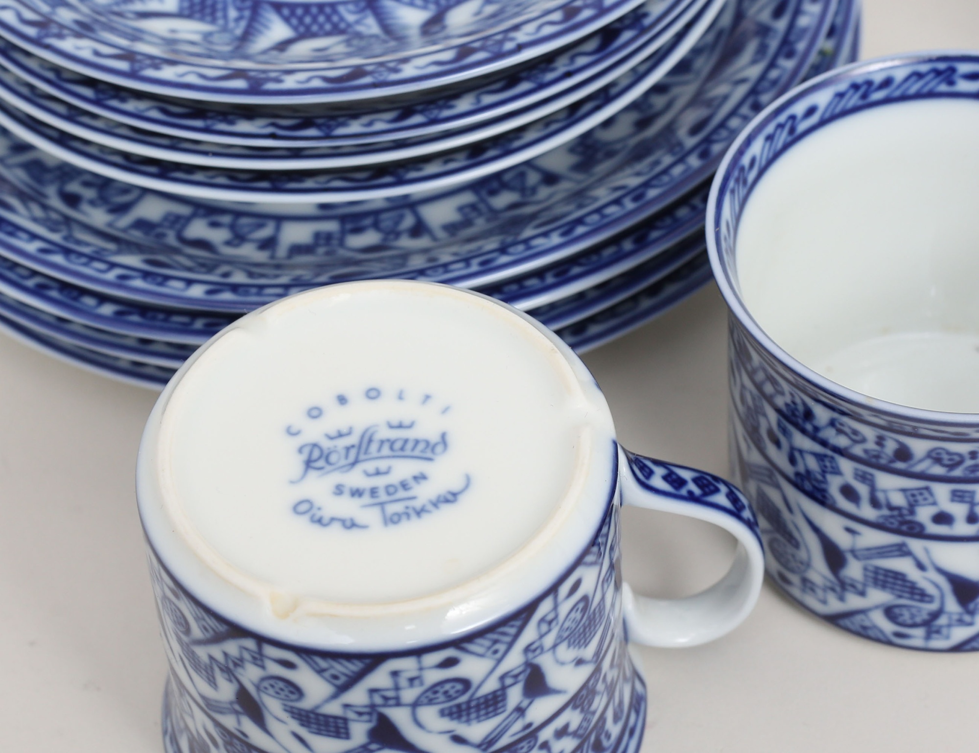 Oiva Toikka Rörstrand, 4 kaffekoppar med fat samt 4 assietter, mörkblå underglasyrdekor, höjd 6,5 (8)