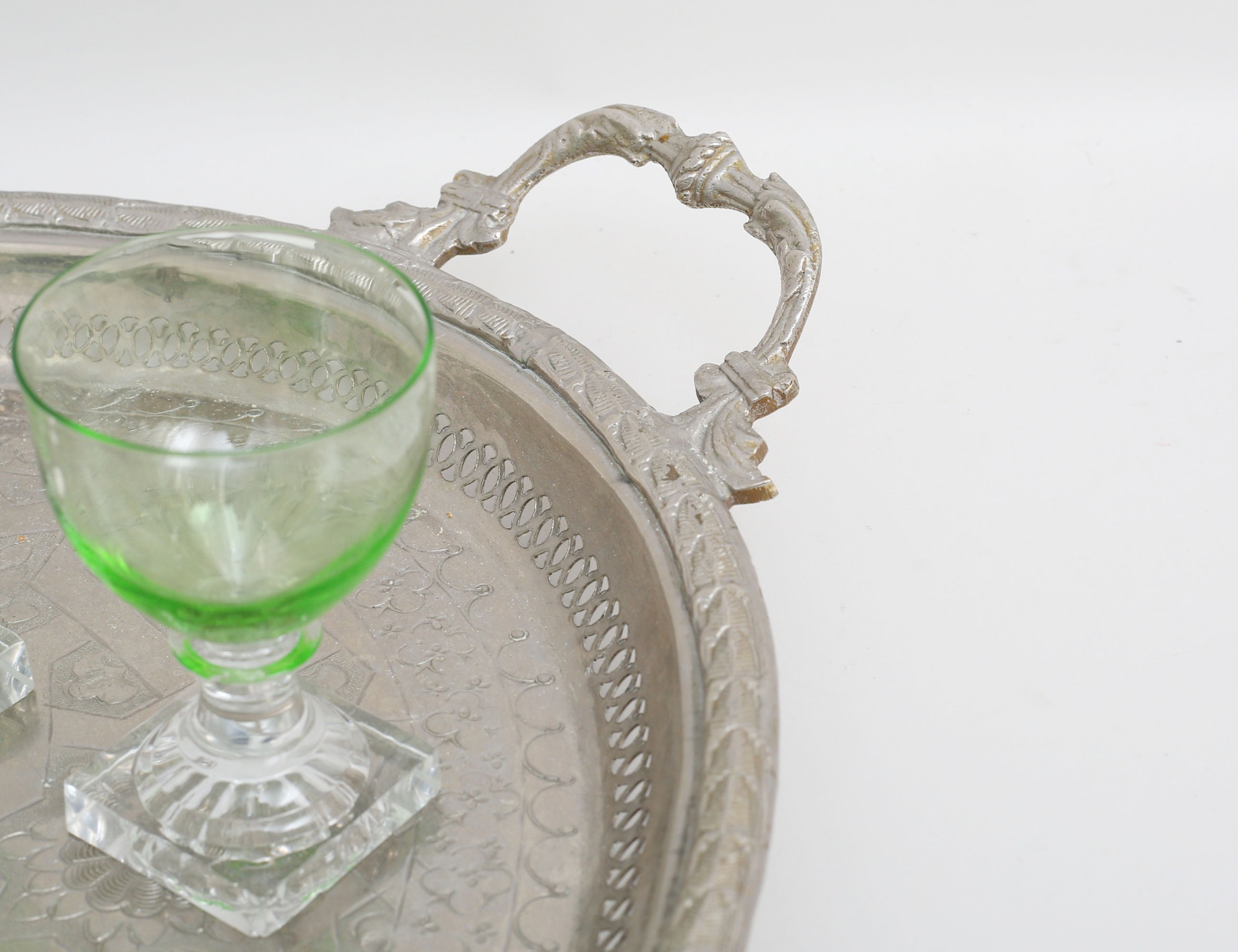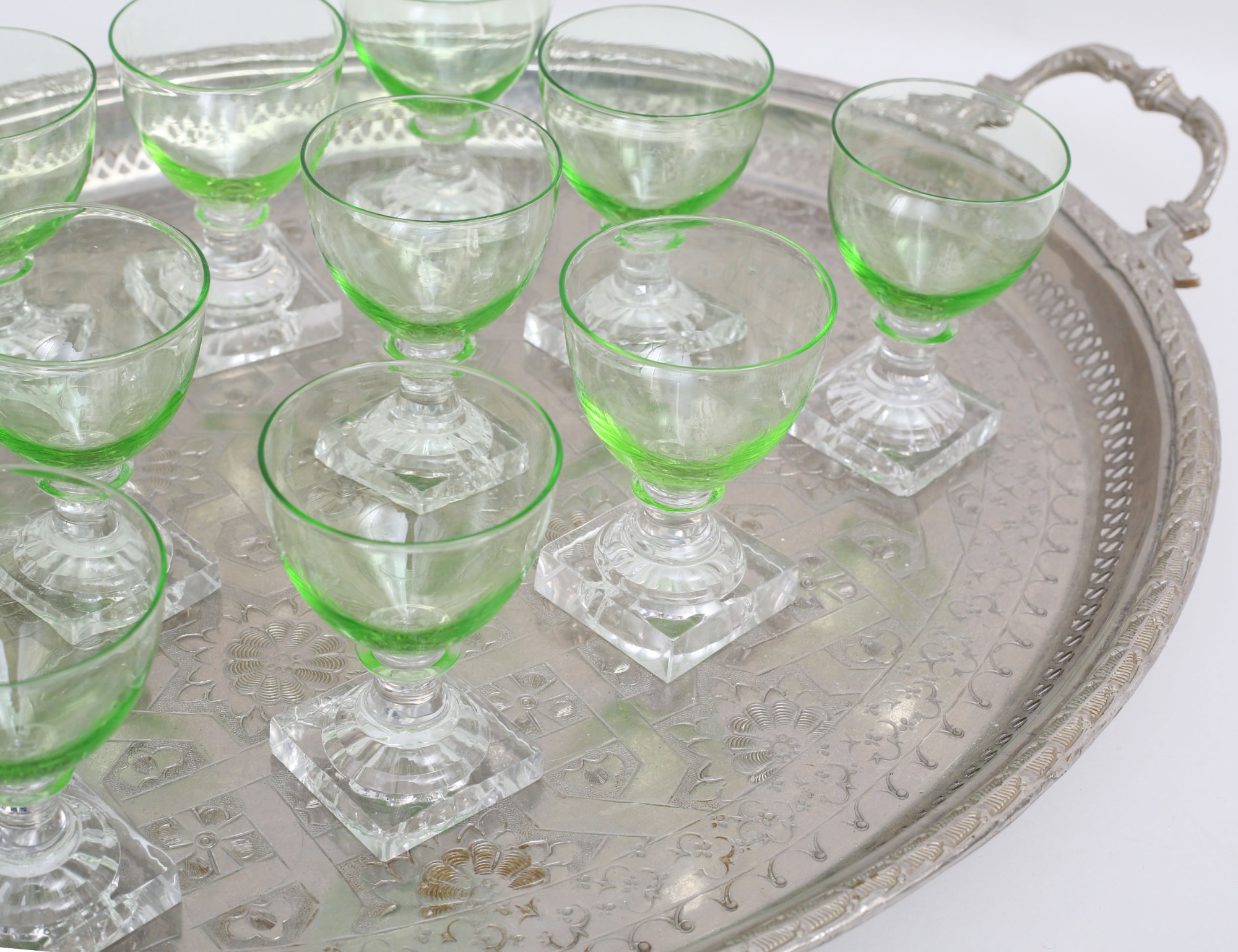 förnicklad, genombruten dekor, 63x43, 12 vinglas möjligen Elis Bergh Kosta, grön kuppa, kvadratisk fot, höjd 10