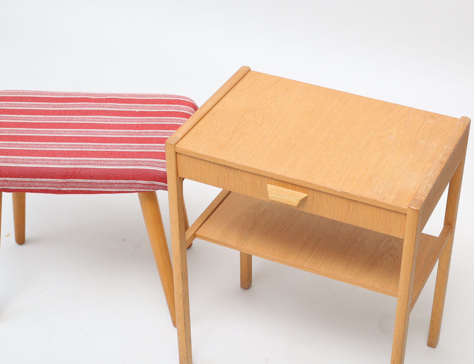 ek, sarg med en låda, höjd 55, bredd 44x30, pall 1950/60-tal, björk, fast stoppad sits, höjd 40, bredd 45x30 (2)