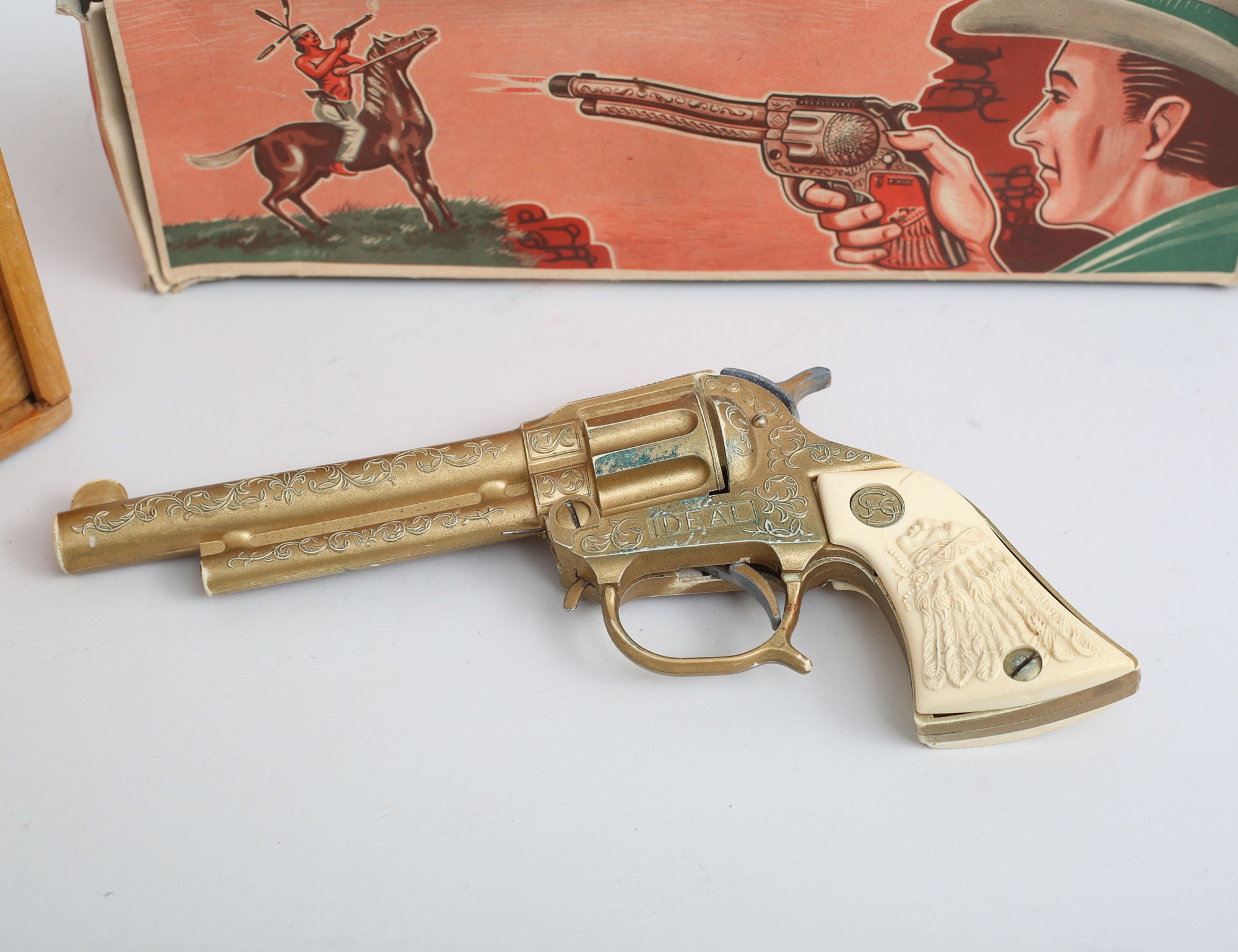 spelpjäser i trä, i schatull, regelbok medföljer, höjd 12, 24x18, leksakspistol Mustang 6000, plast, i originalkartong (2)