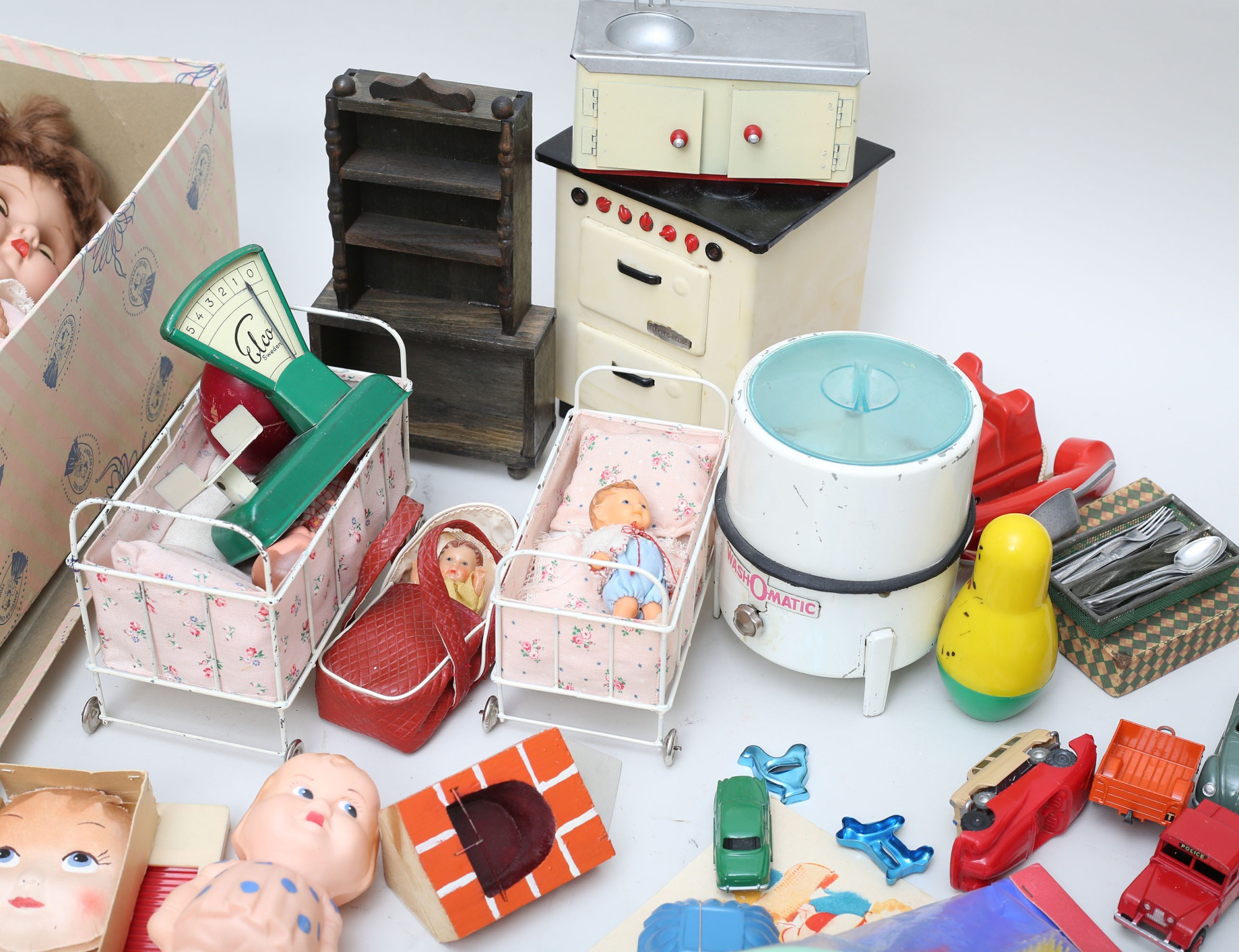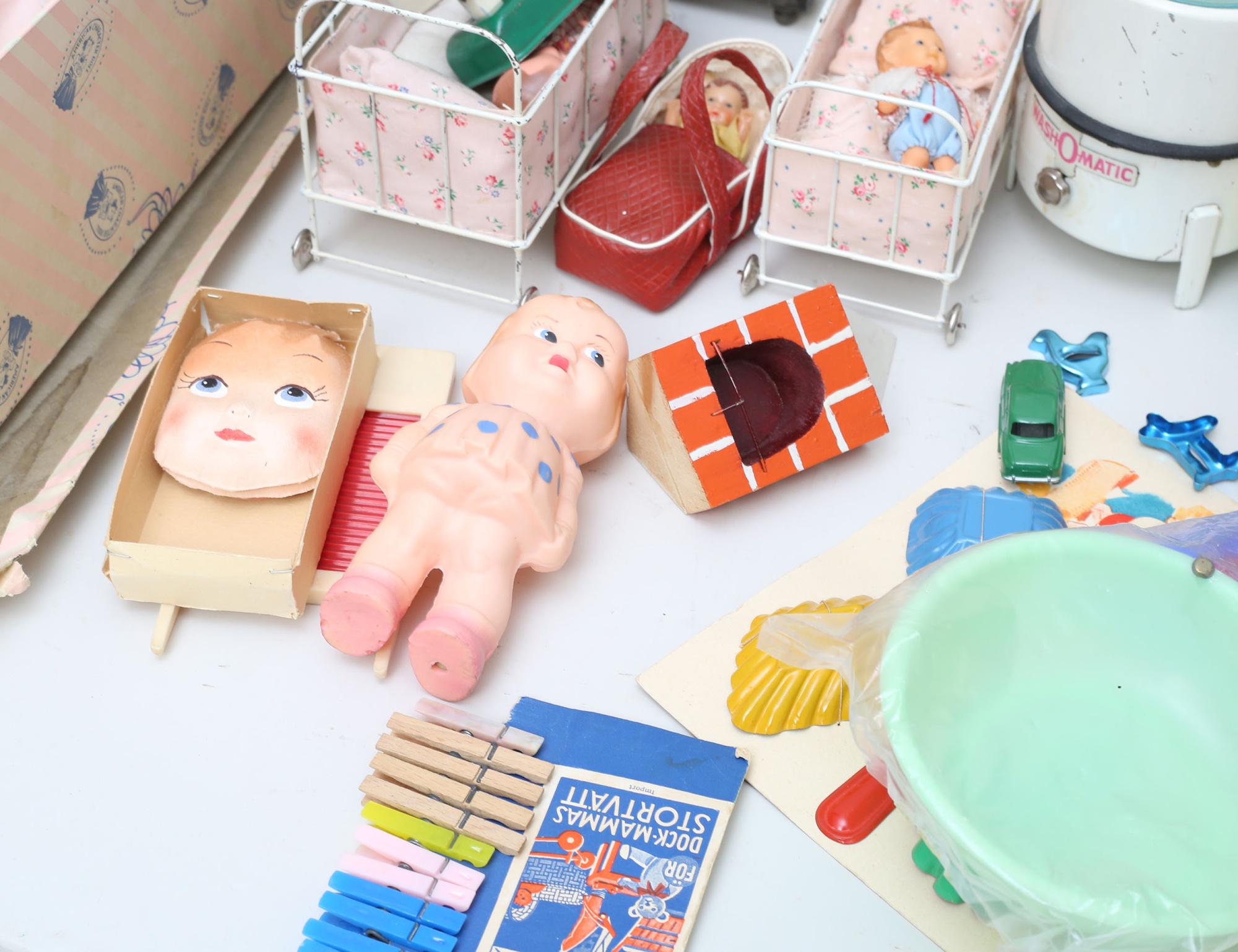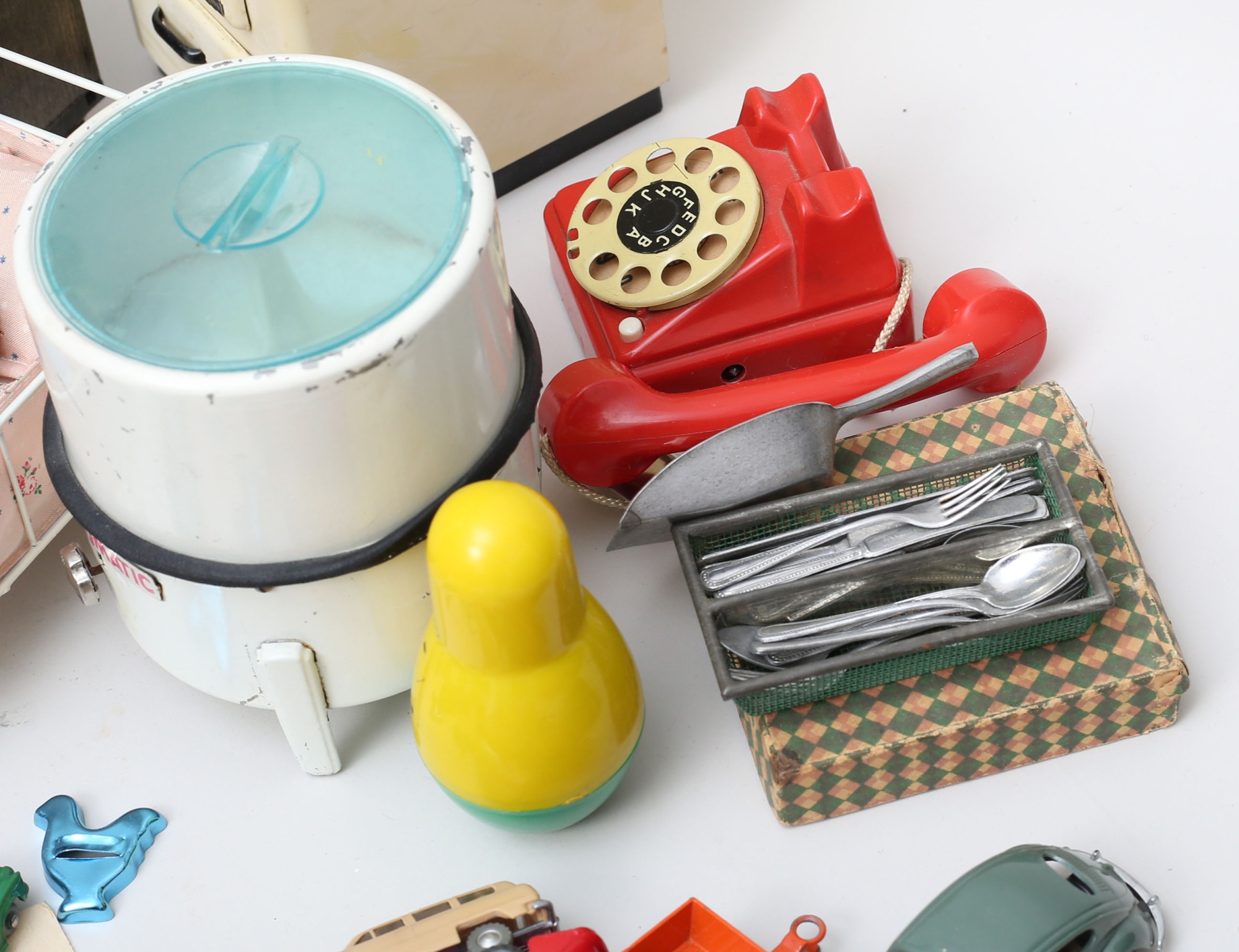 originalkartong, längd 50, leksaker - spis Elektrolux, tvättmaskin Washomatic, våg, telefon, 2 docksängar, öppenspis, diskbänk, bestick m.m.