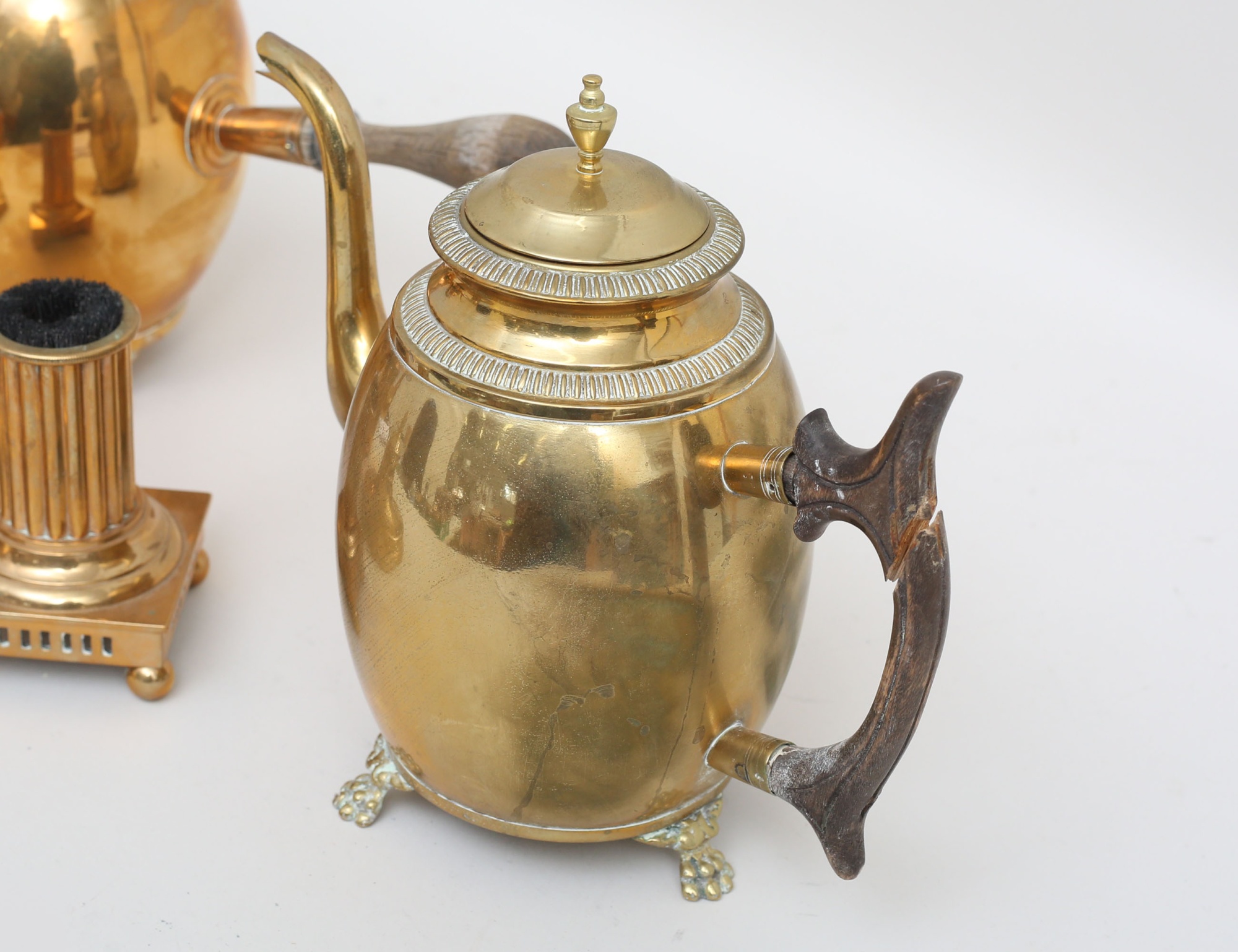 Skultuna tidigt 1900-tal, mässing, höjd 14/10, 3 serveringskannor c.1900, mässing, Sundsvall/Eskilstuna, höjd 20-21