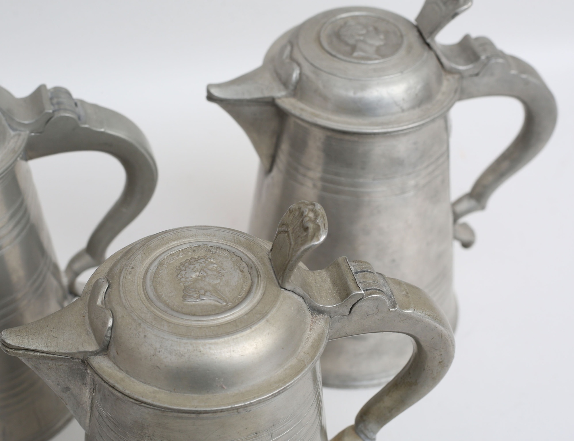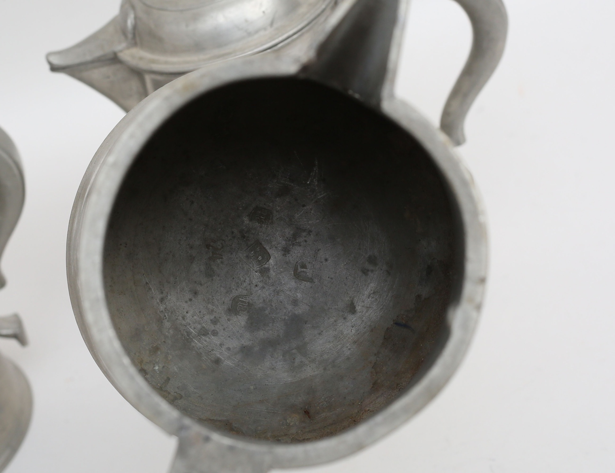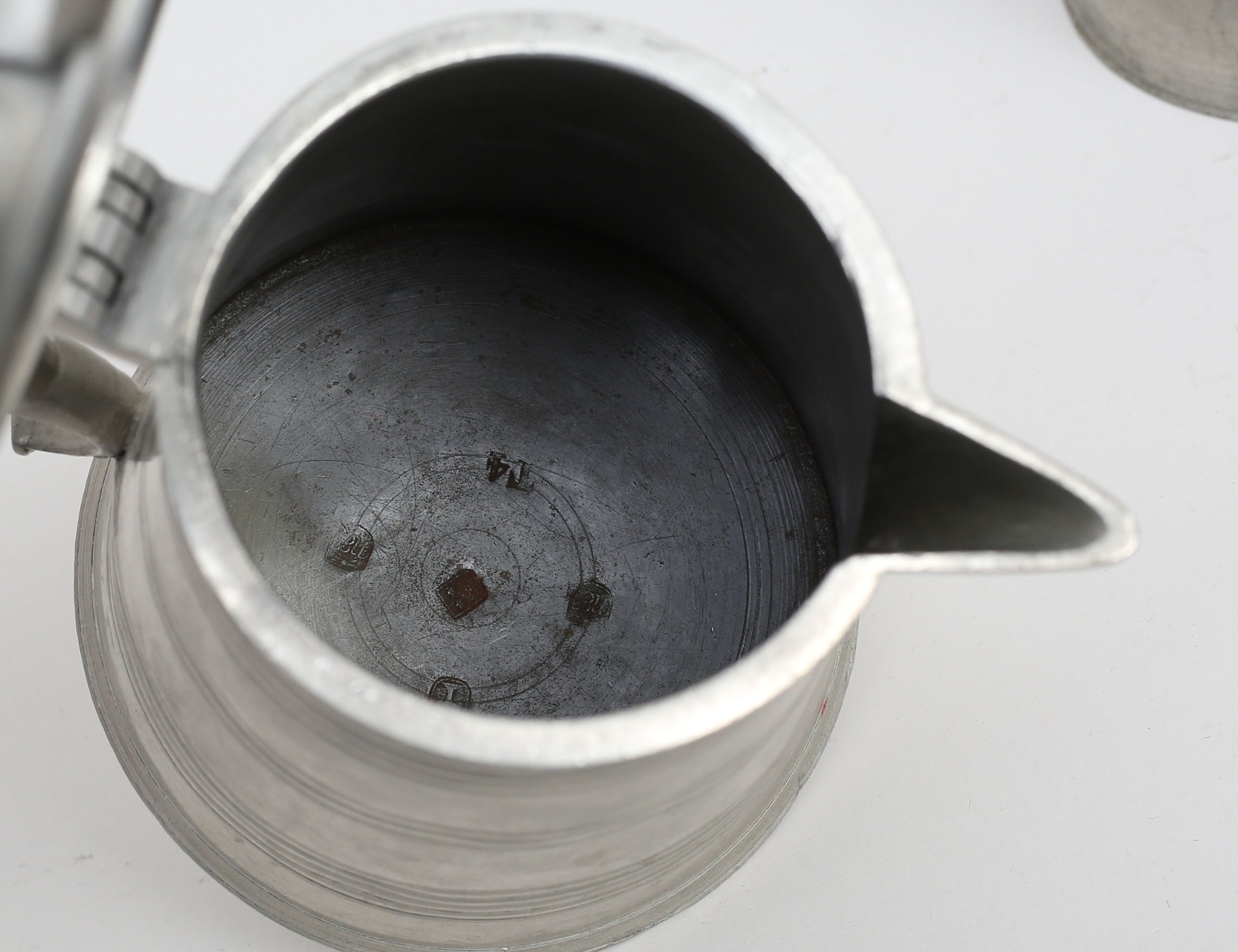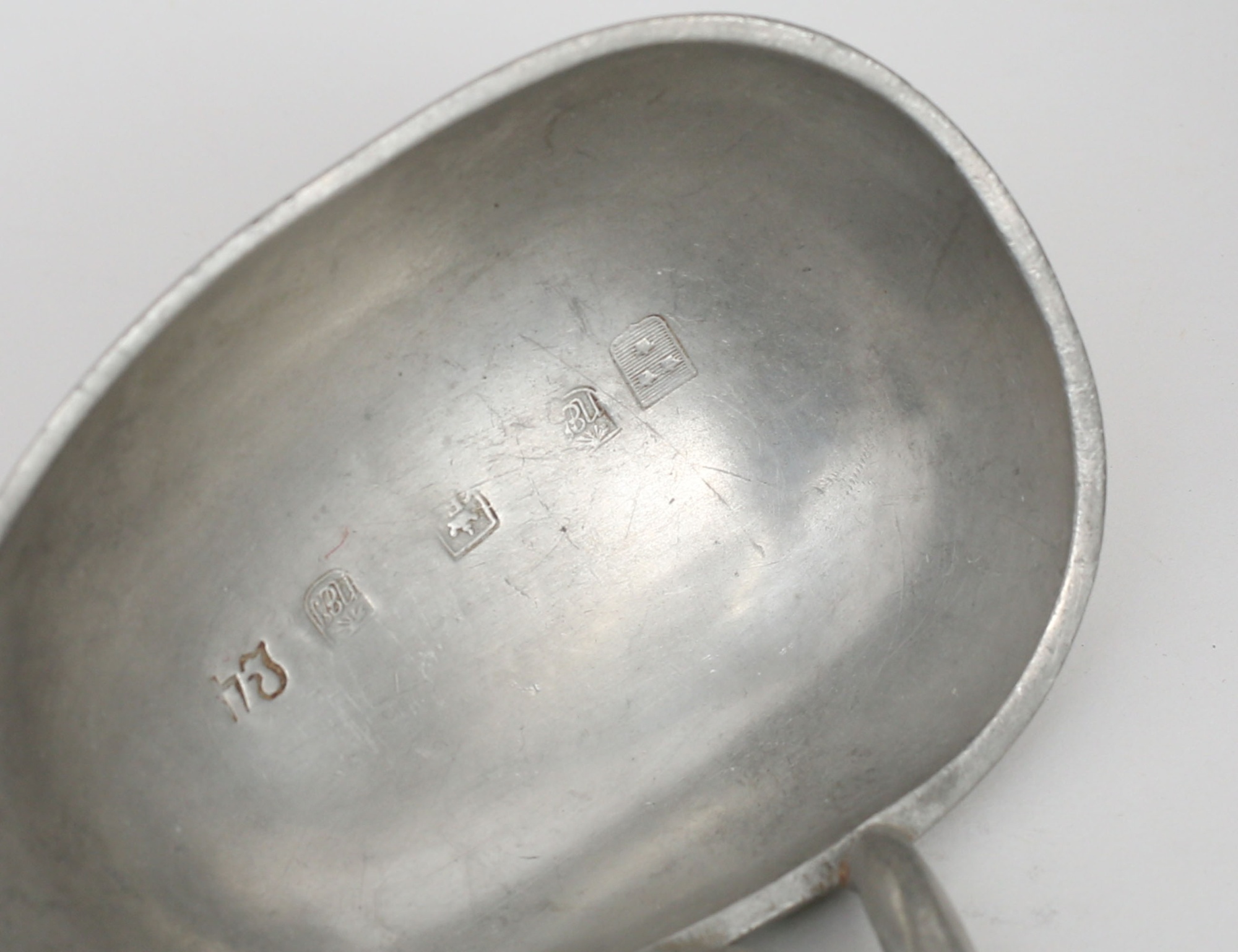 tre stop - 1843, 1847 samt 1849, höjd 20, soppslev 1841, svarvat trähandtag med benknopp, längd 39 (smärre hänkellagningar) (4)