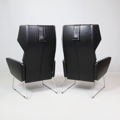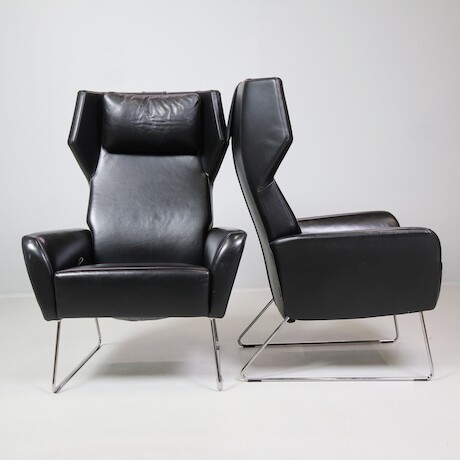 Roger Persson, fåtöljer ett par Swedese, med fotpallar, skinn & metall, ställbara
