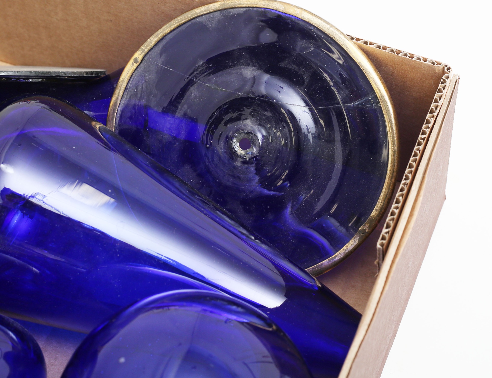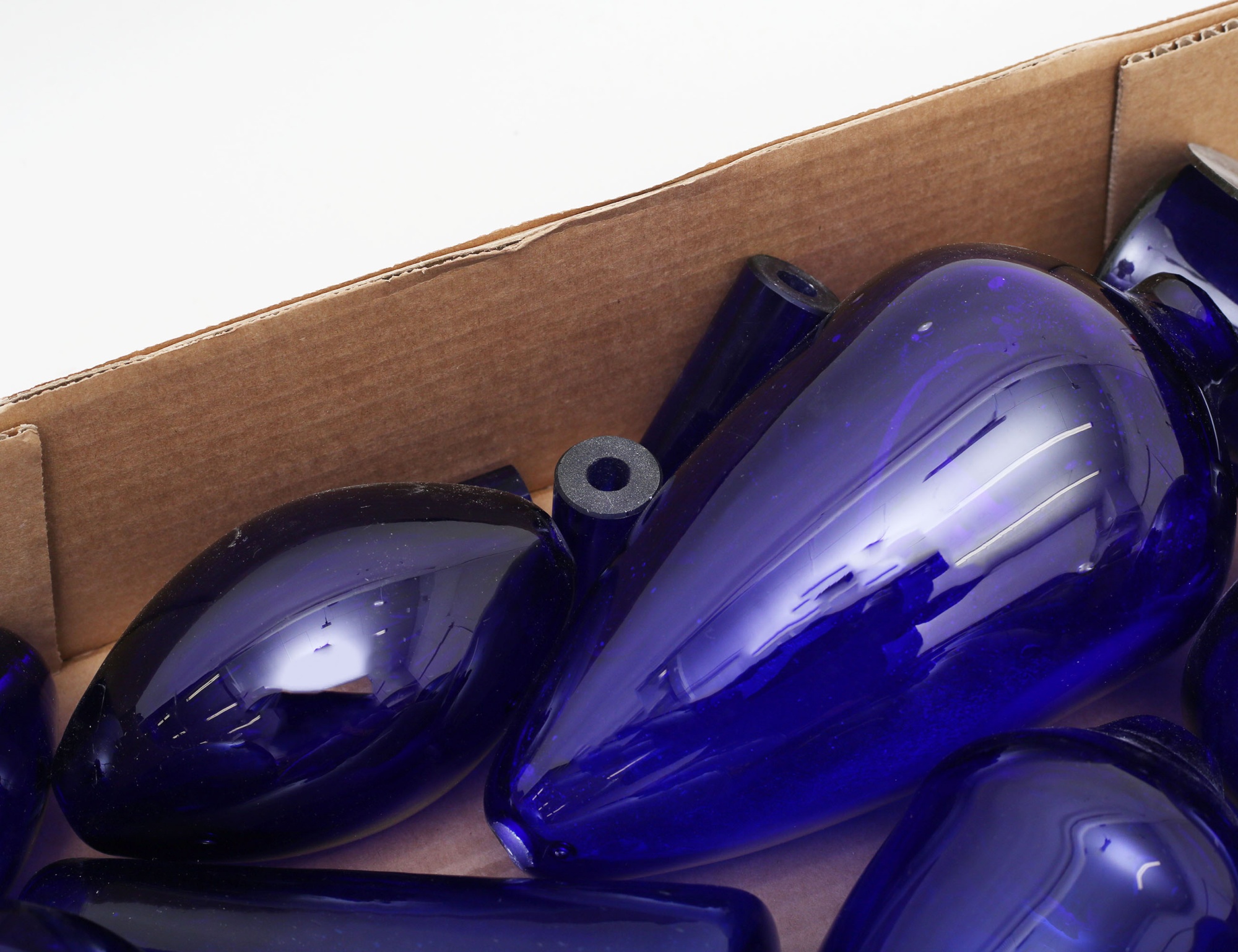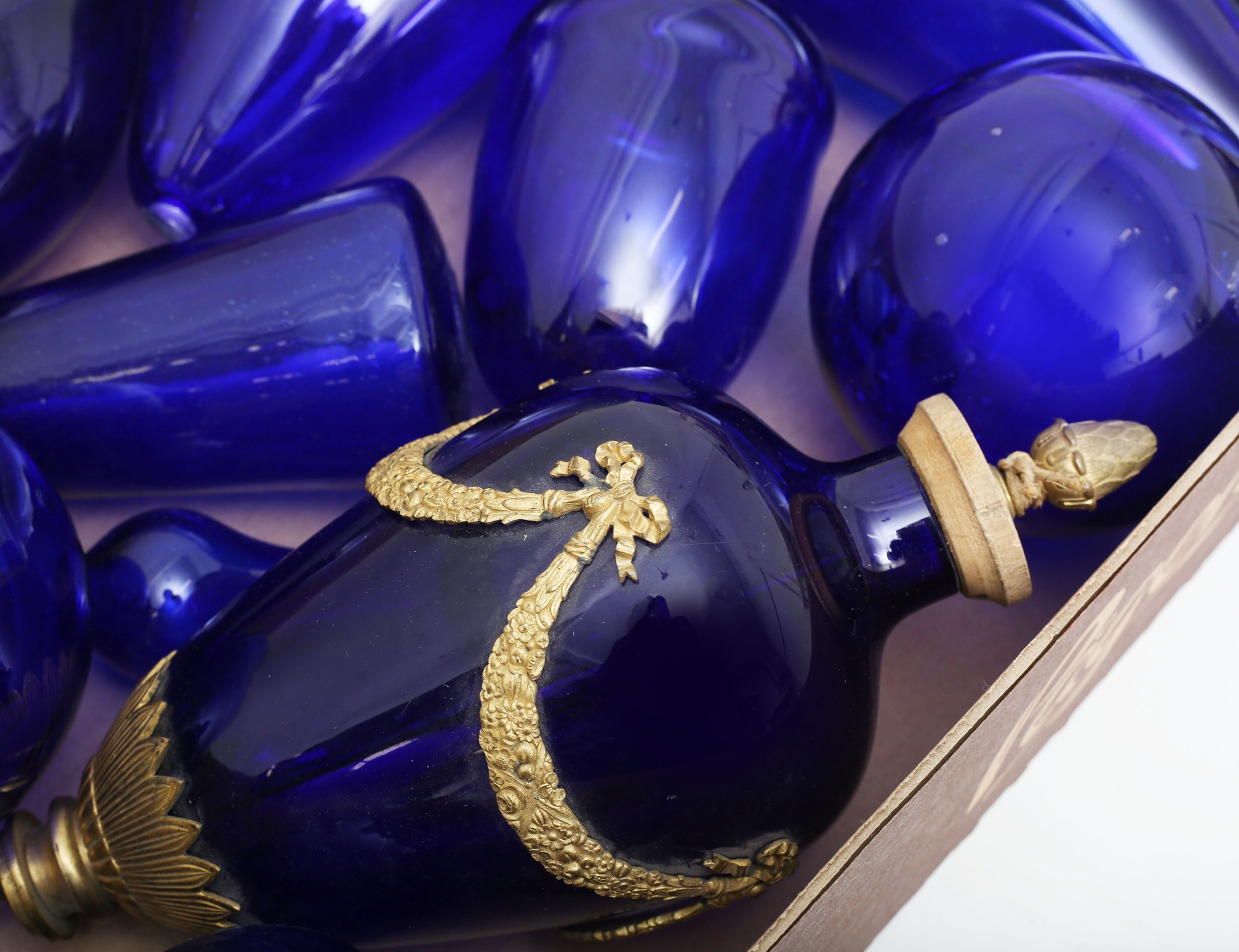 blått glas i for av urnor, klot, skivor,en urna med mässingsdekor, proveniens: Neumans Antikhandel Stockholm