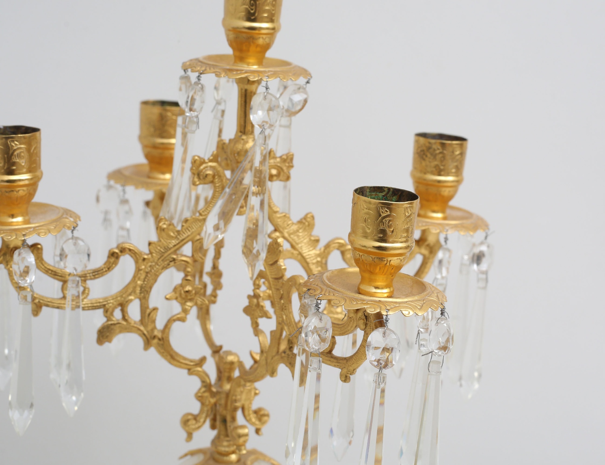 förgylld genombruten mässing, för fem ljus, fasettslipade prismor, stam i alabaster, höjd 47