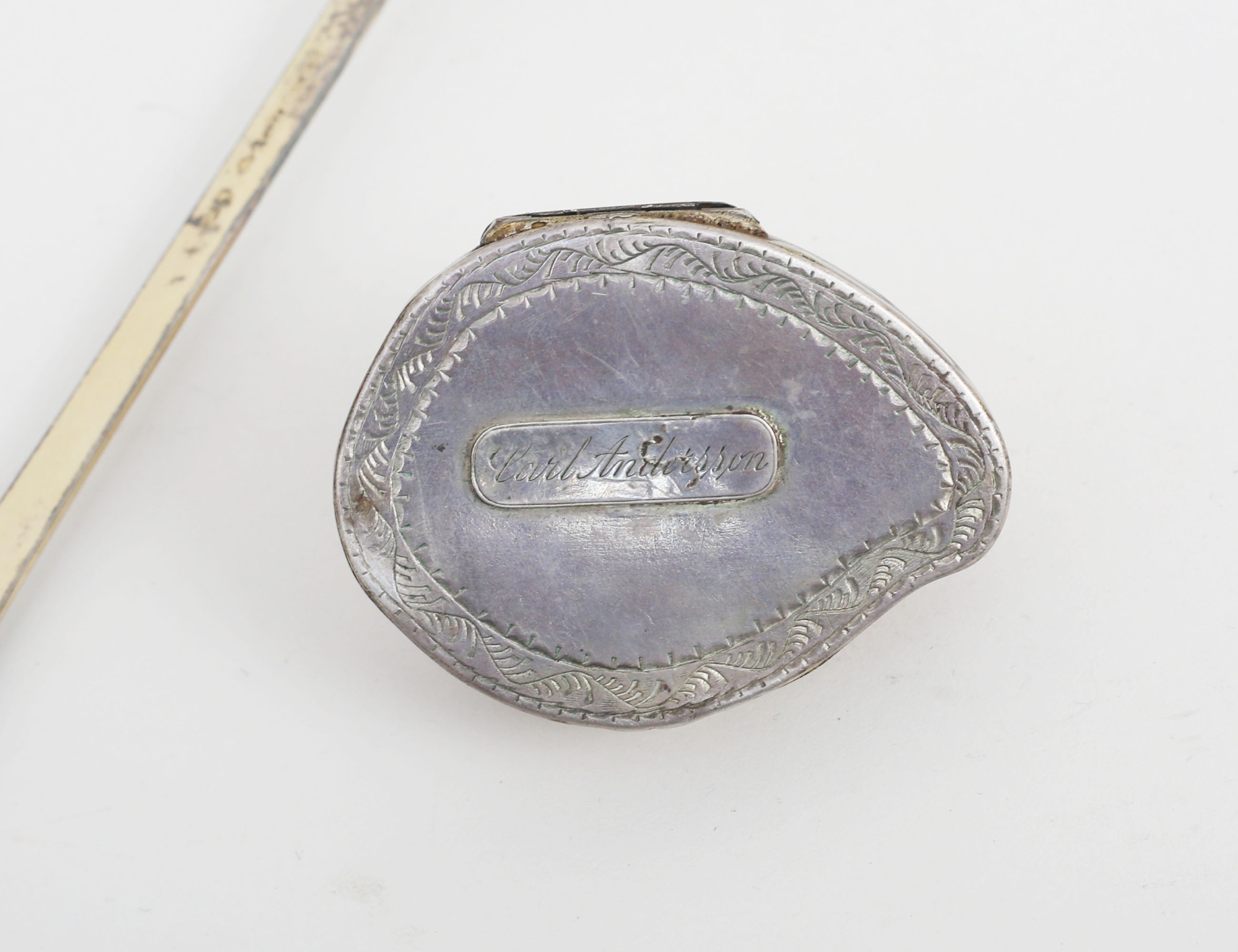 CG Hallberg Stockholm 1897, förgylld, längd 28, Claes Christian Carlén änka Borås 1859, vikt 105 gram (skada gångjärn, inskription) (2)