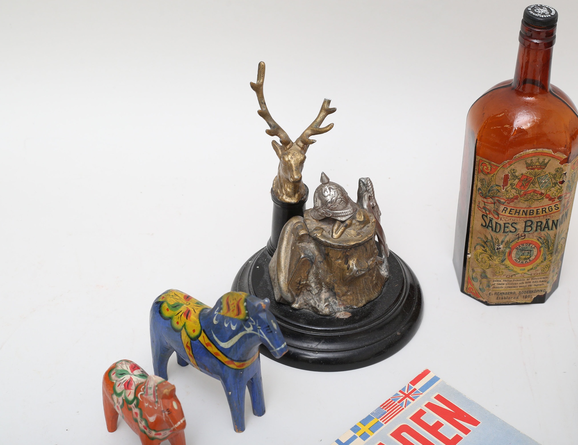 flaska Rehnbergs Sädesbrännvin tidigt 1900-tal, höjd 27, godismagasin Dixi Miniatyr 1950-tal, längd 27, bläckhorn c.1900 (skador), 3 dalahästar höjd 7-14