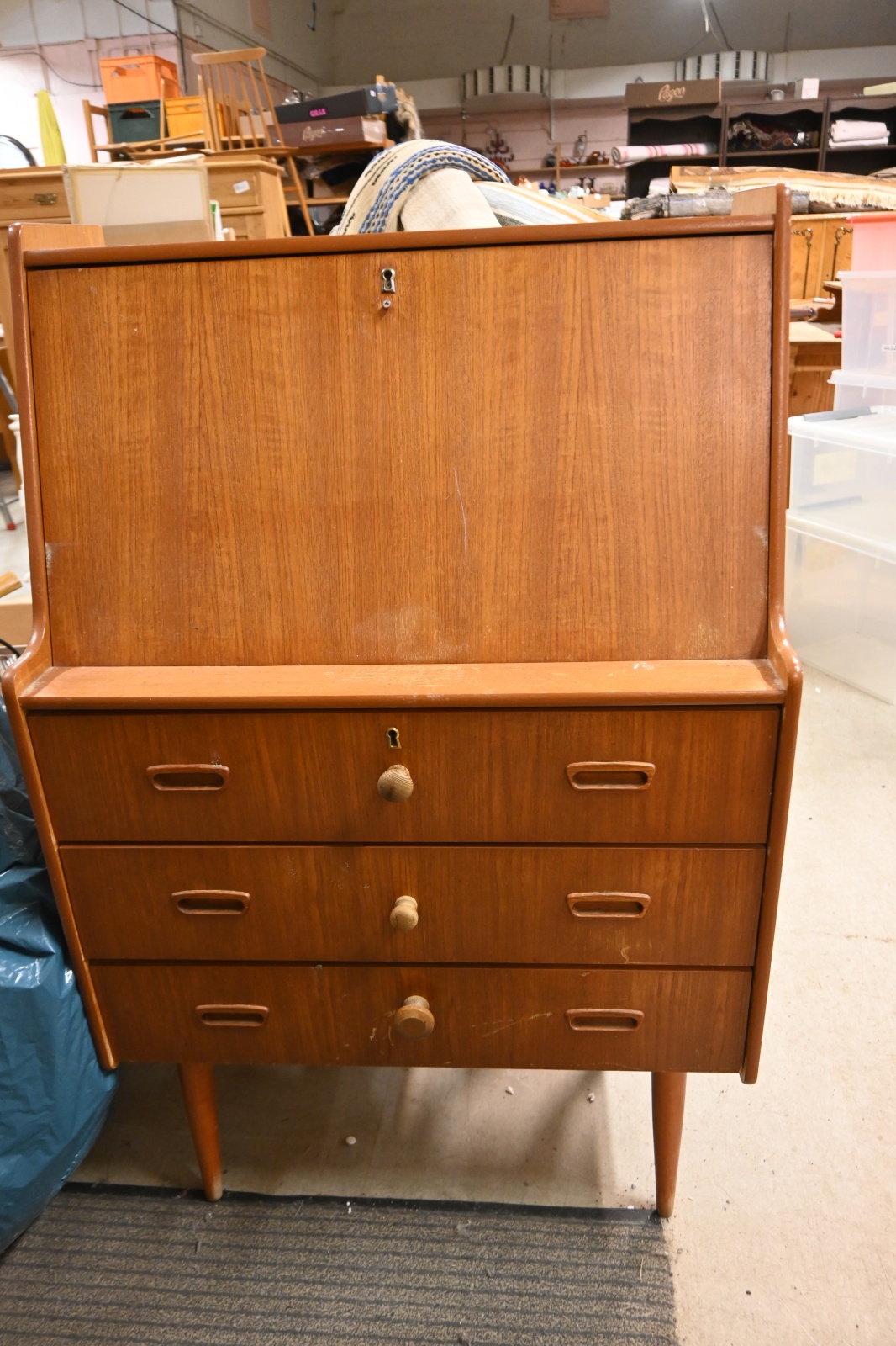 Skrivseketär i teak (slitage, nyckel saknas)