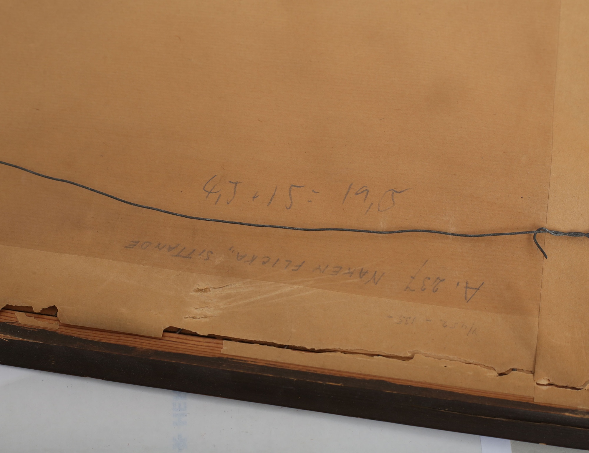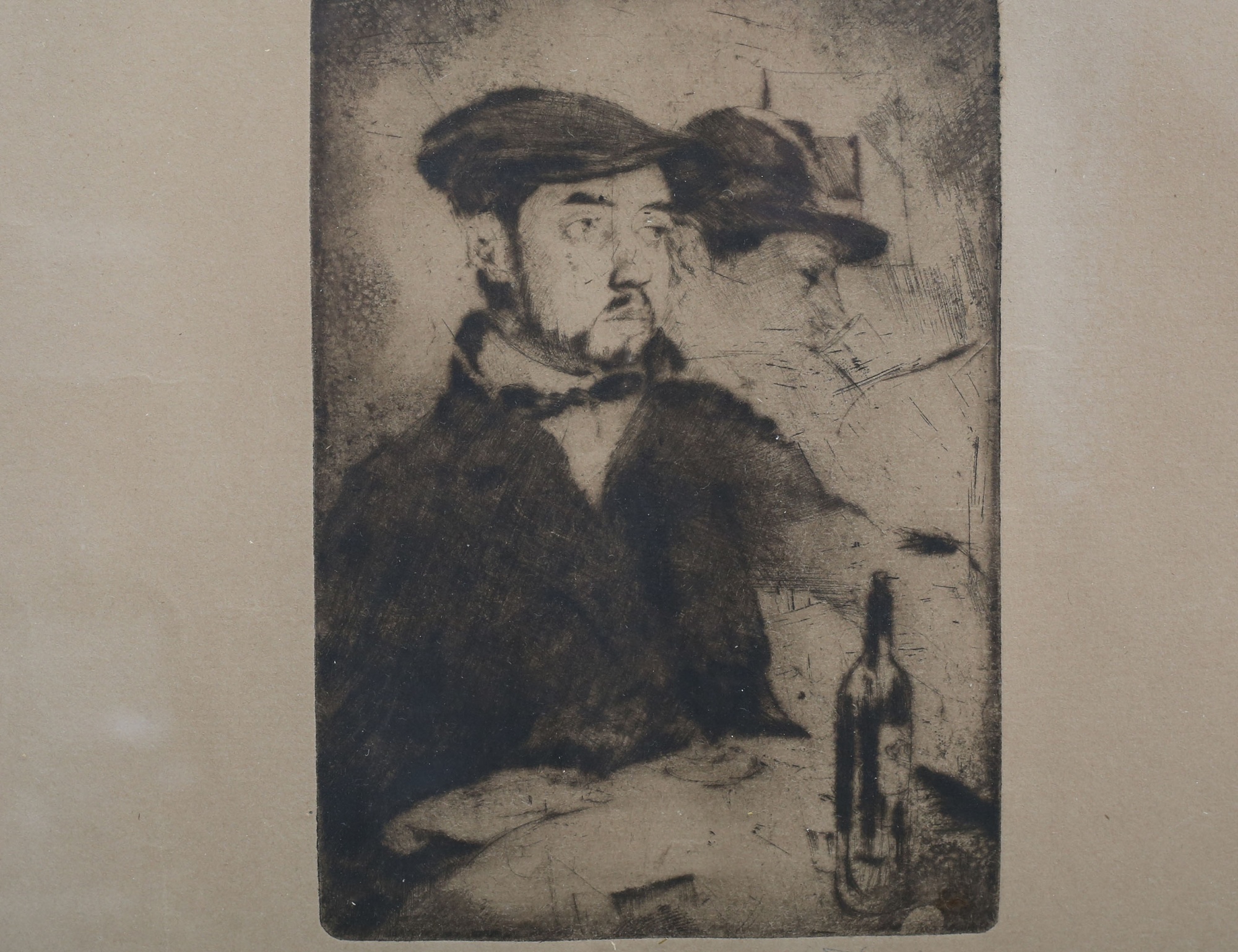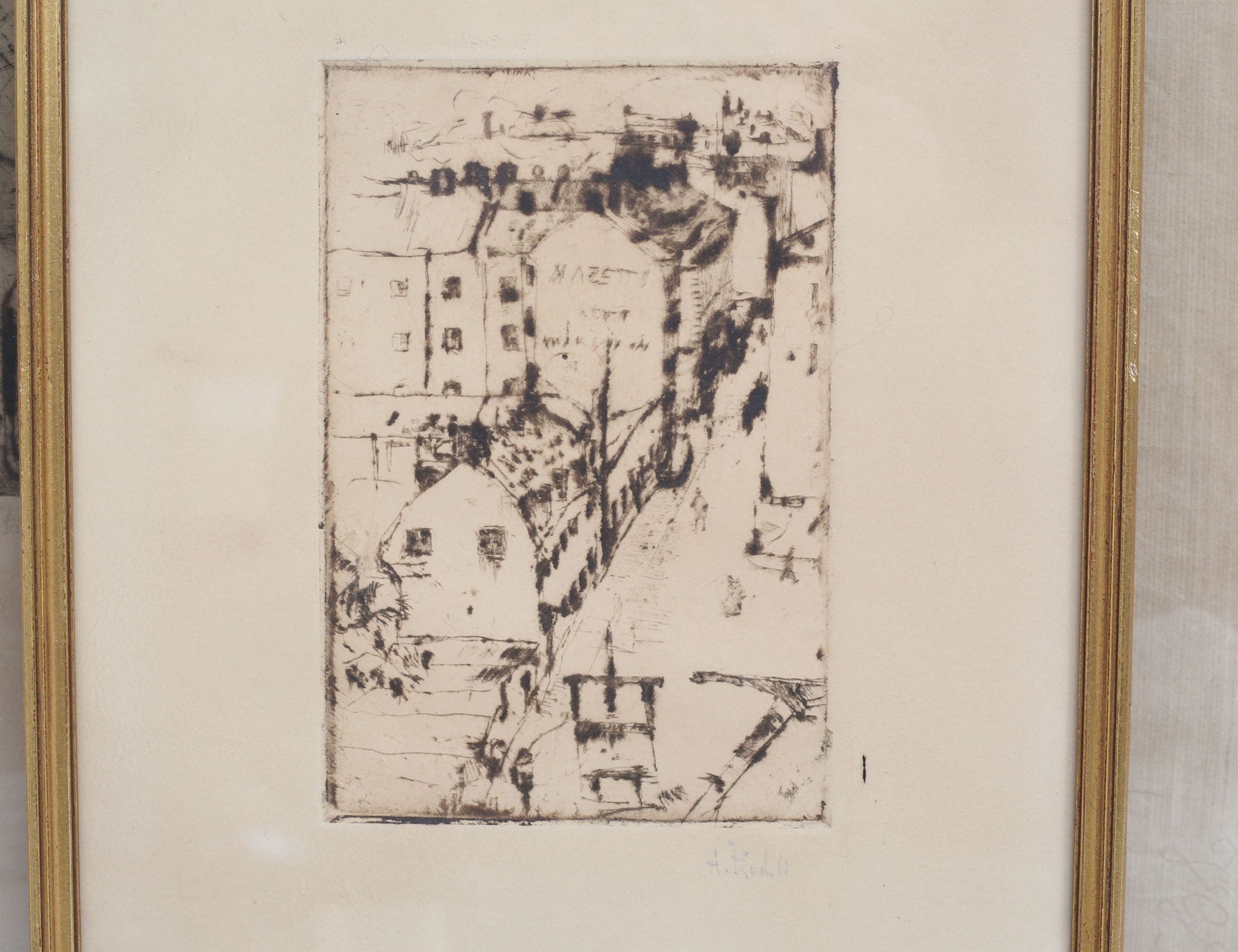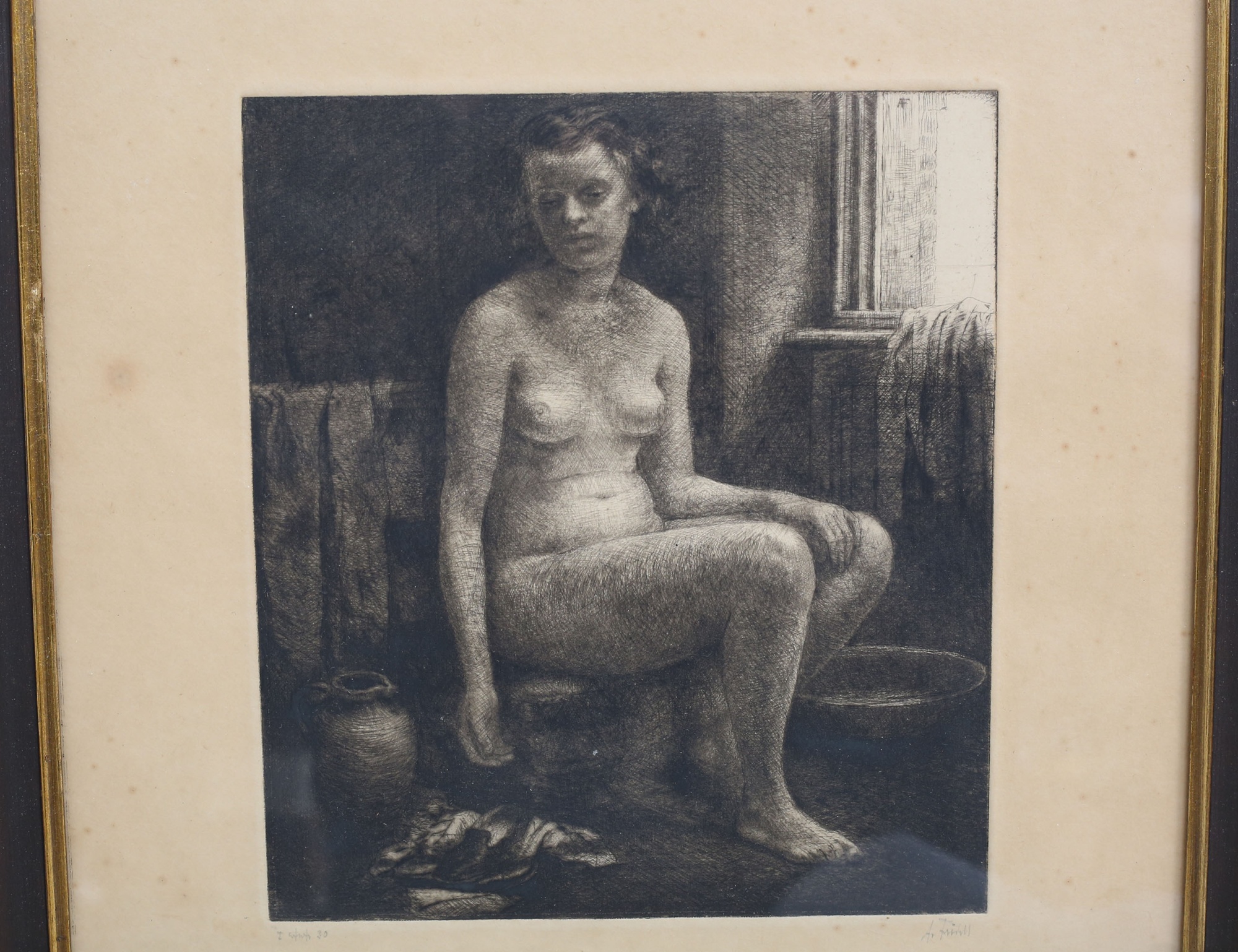 4 etsningar, "Naken flicka" 16x18, "Kvinna med hatt" 15x19, "Man på krog" 13x18, "Stadsvy" 12x18, förgyllda ramar och glas