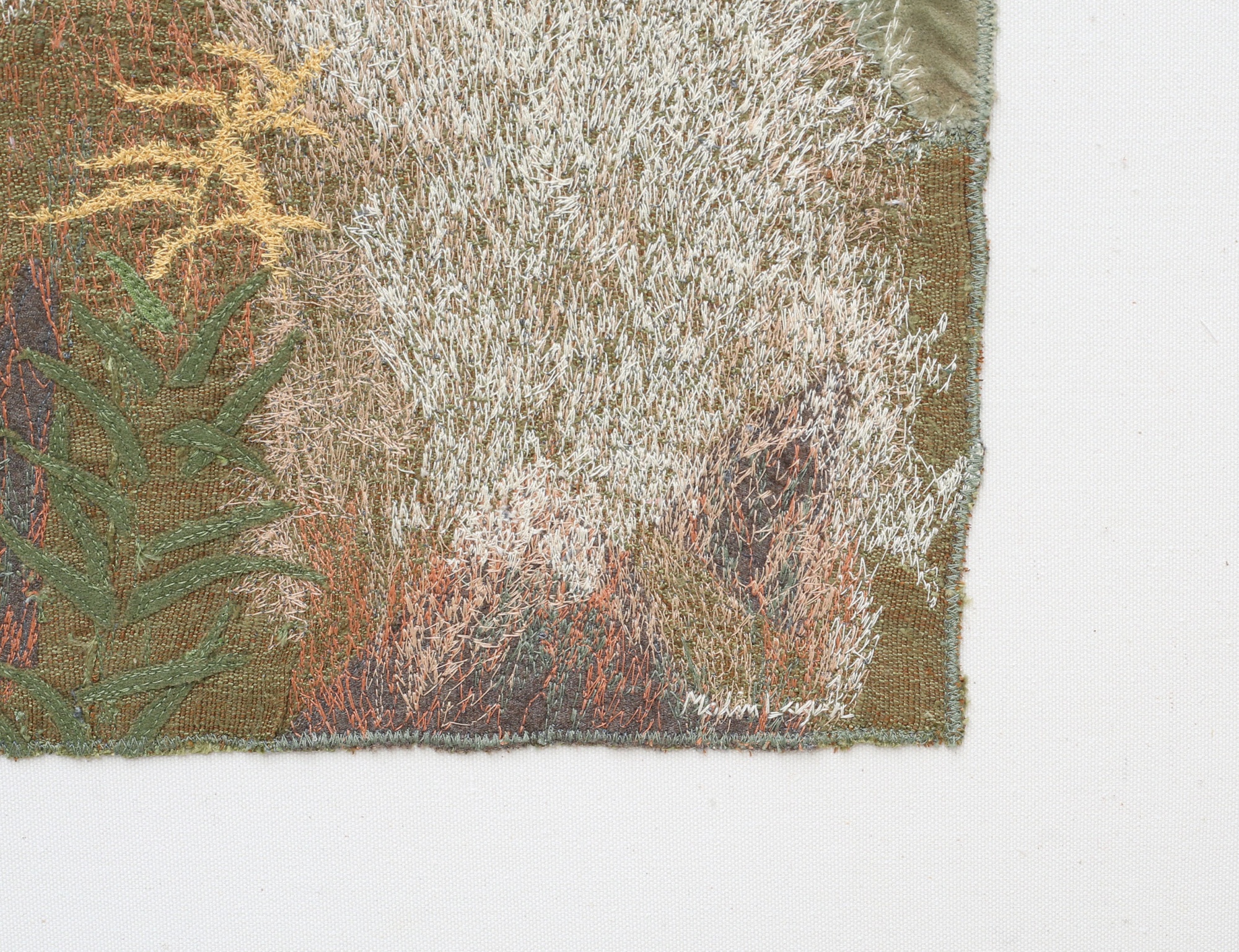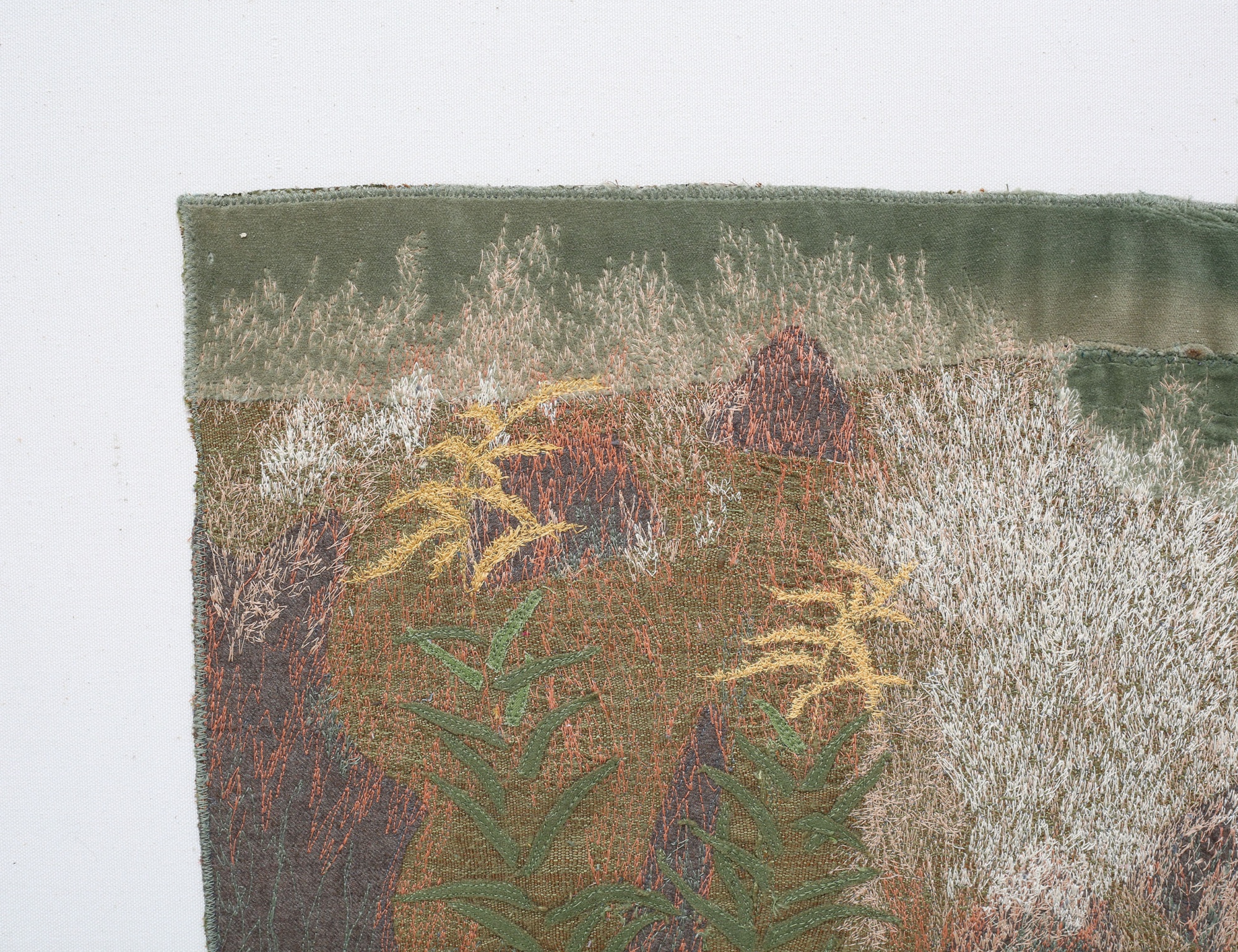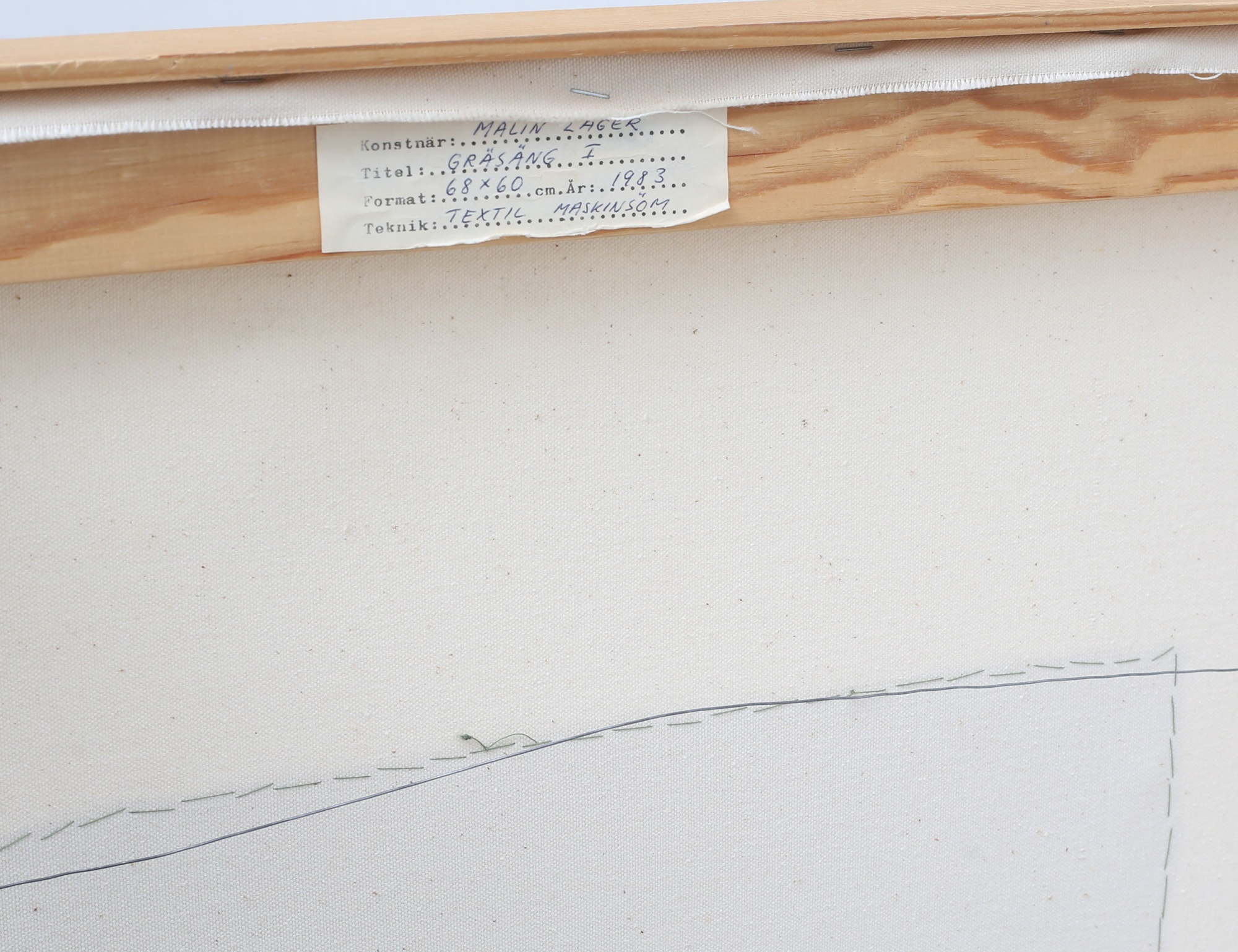 textilkonst "Gräsäng 1" 1983, maskinsöm, utställningsetikett 21, 36x26, rammått 62x70