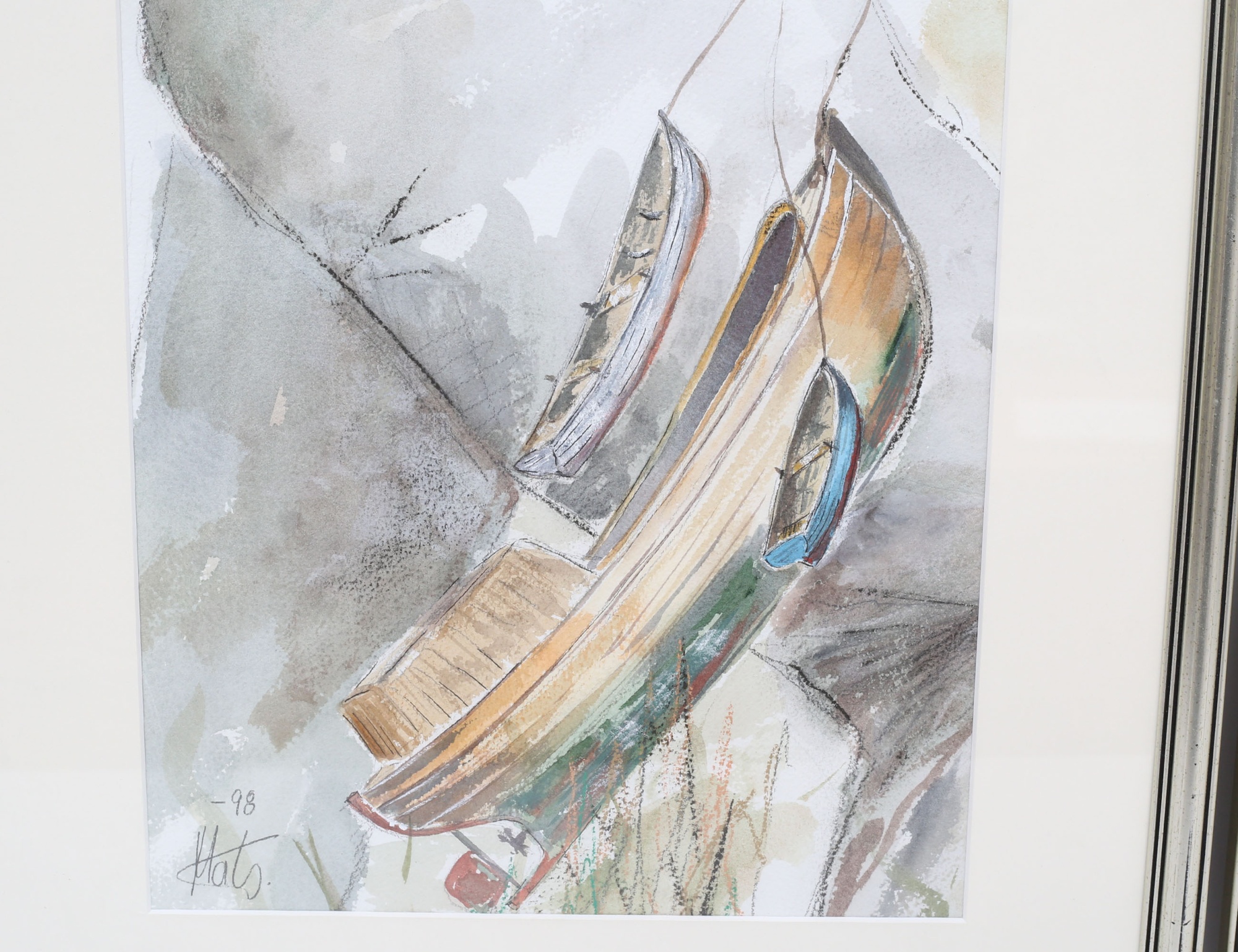 2 akvareller, näckrosdamm respektive komposition med båtar, signerad 2000, 1998, 52x33, rammått 63x48, 75x53