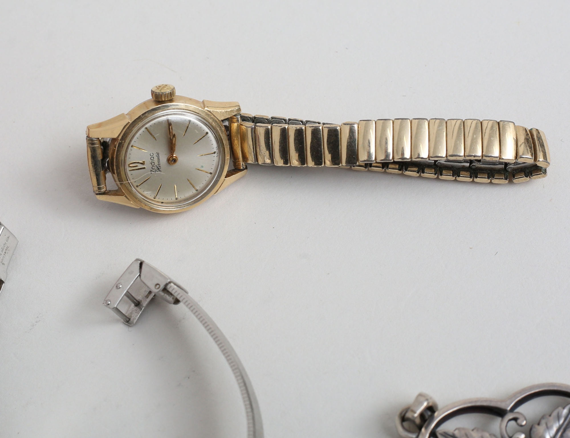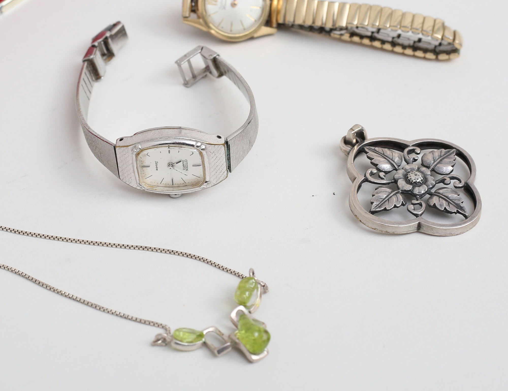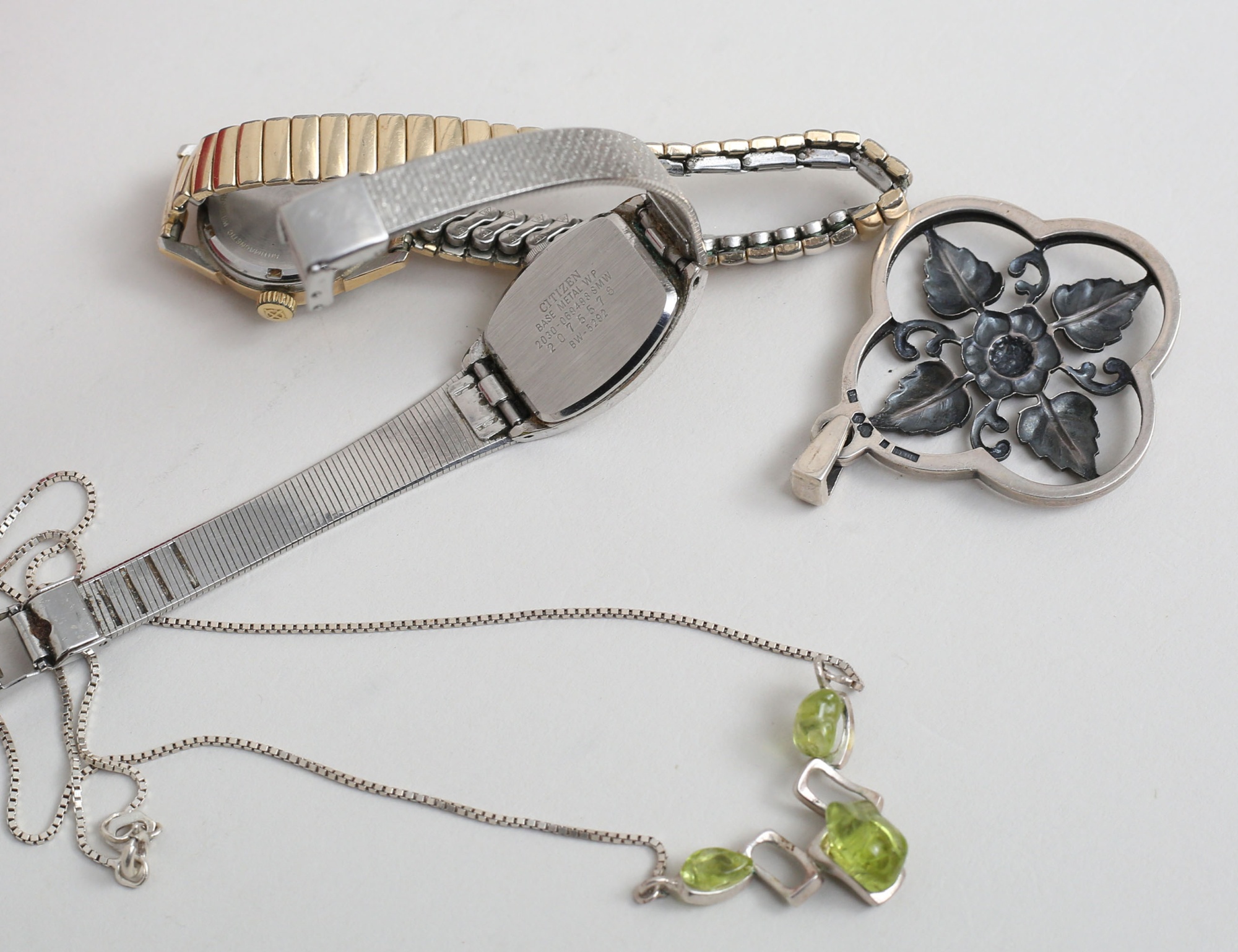 GD & Co Malmö 1948, genombrutna blommor, halscollier silver med gröna stenar, damarmbandsur Zodia, manuell, fungerar vid katalogiseringstillfället, Citizen quartz, klockask Omega