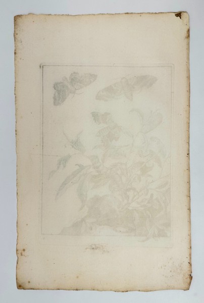 The plate likely belongs to a scientific or artistic series exploring natural history subjects, in the tradition of 18th-century European Enlightenment illustration. The stylized foliage, paired with the dynamic flight of the moths above, reflects both observational accuracy and decorative elegance.