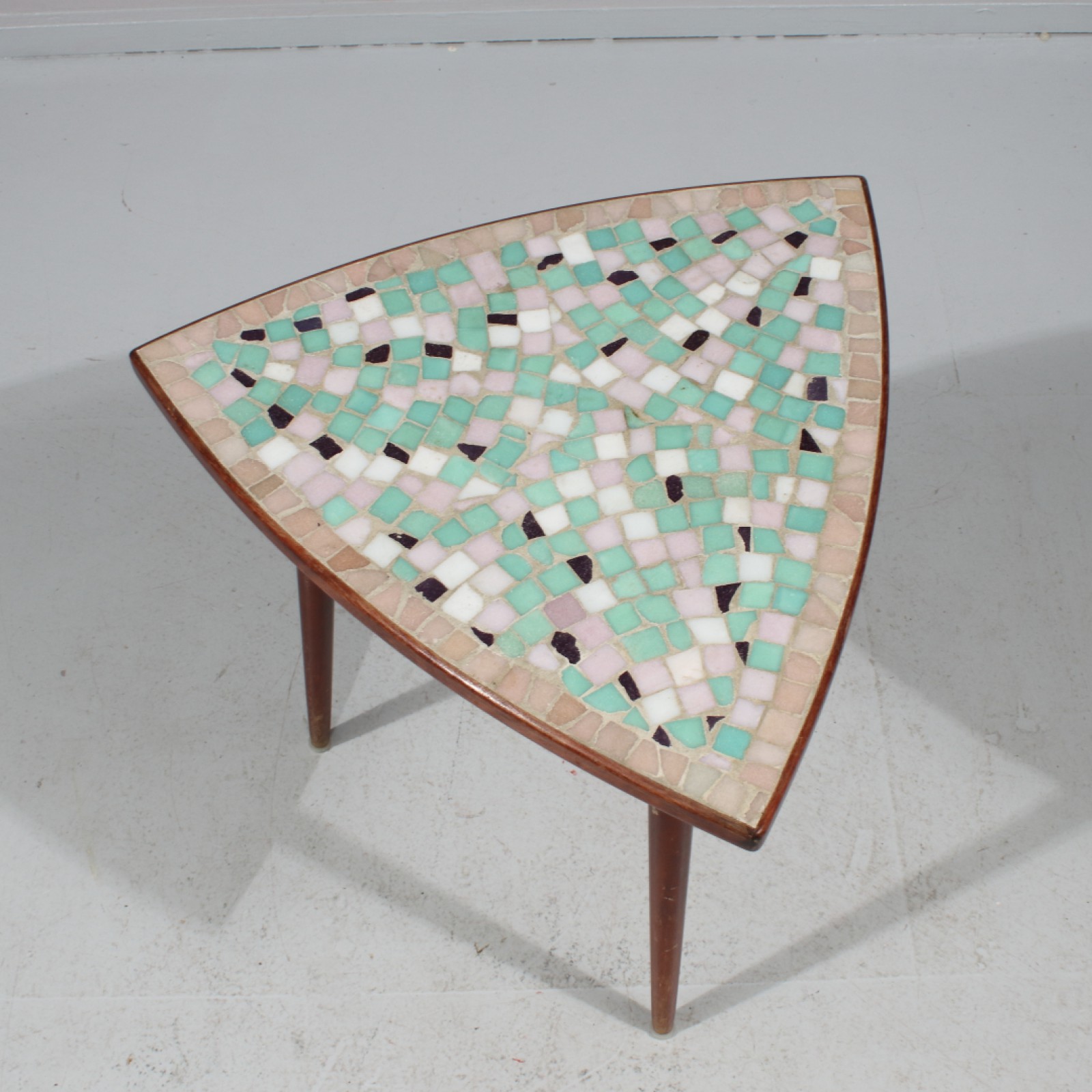 Lövträ, skiva med mosaik, 1950,60-tal, höjd 49,5 cm, skiva 52x52x52 cm. (vån3)