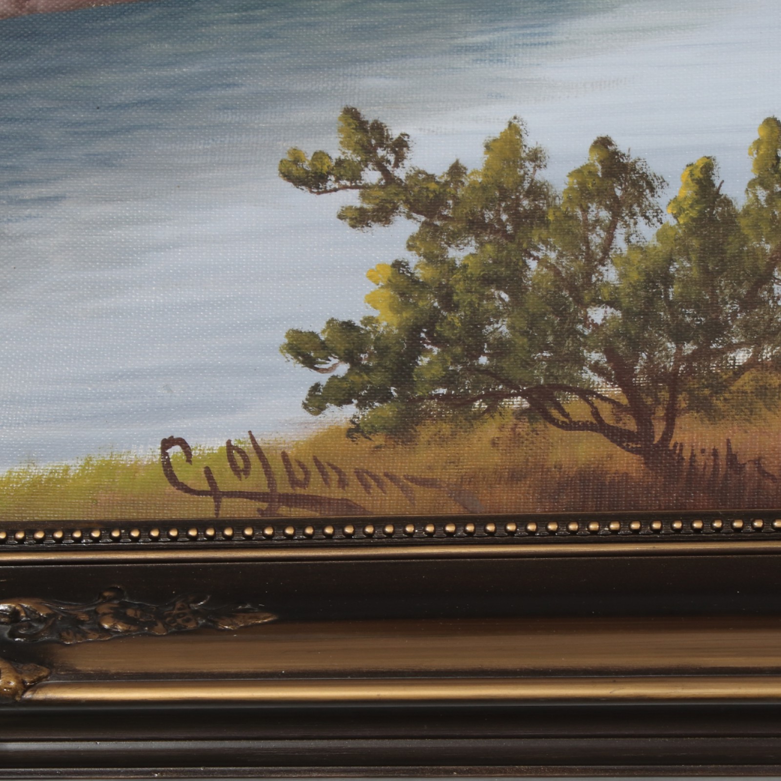 Olja på duk, "Landskapsscen vid sjö", signerad, ram 75x115 cm, bild 58x98 cm. (vån1)