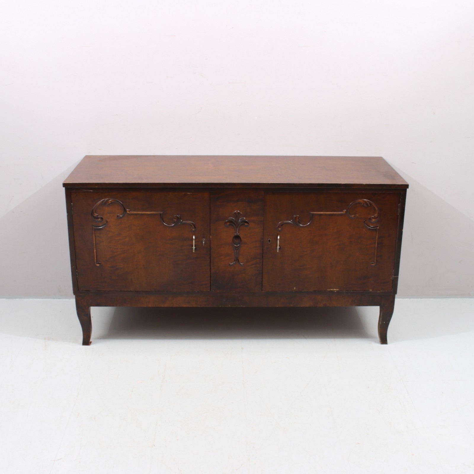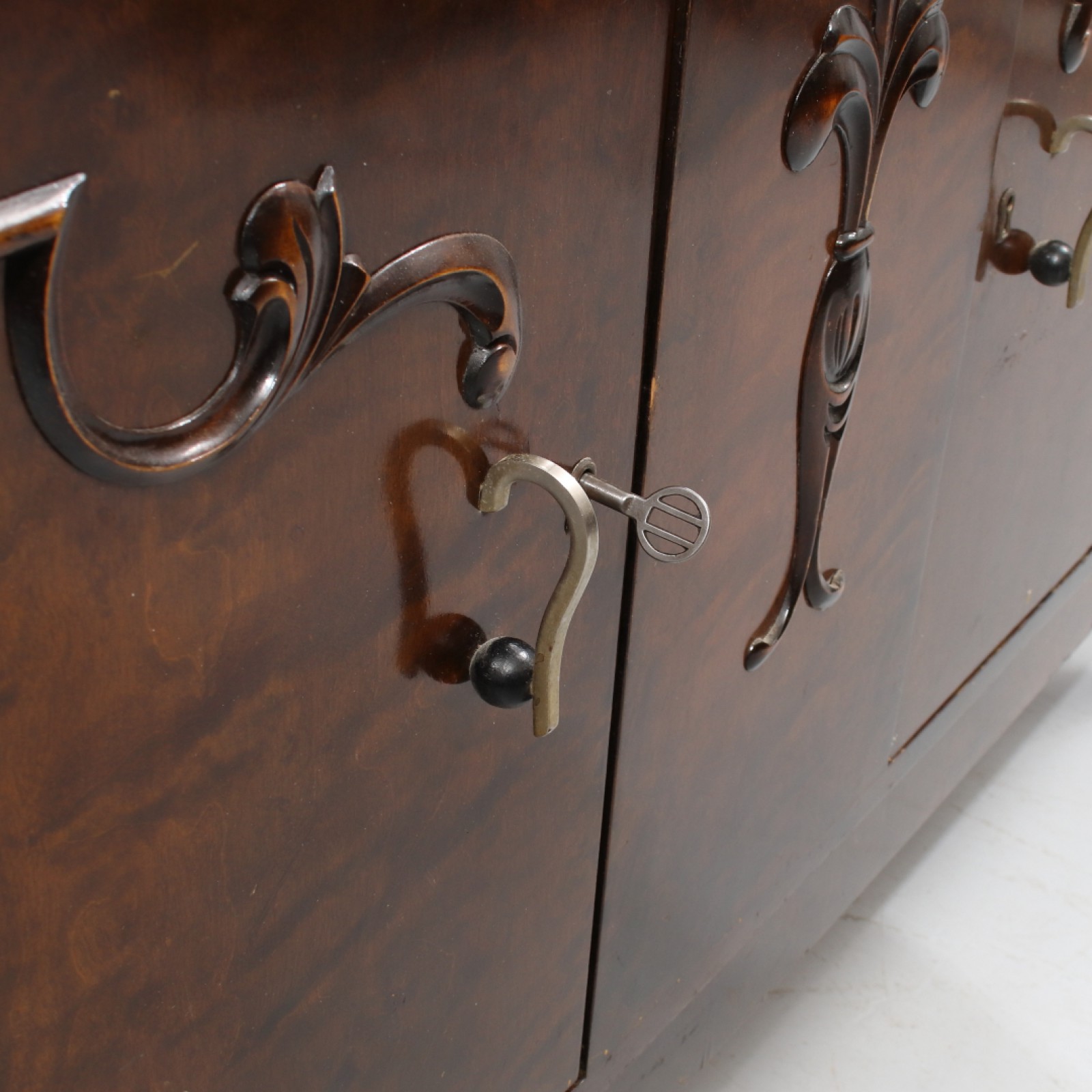 Fanerat med lövträ, 1940,50-tal, åldersrelaterat slitage, 1st inre låda saknas samt 1st senare hyllplan, H.76, B.142, Dj.51 cm. (vån1)