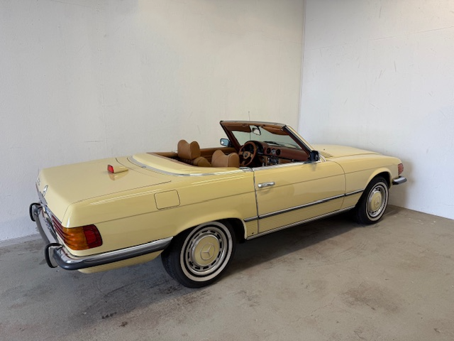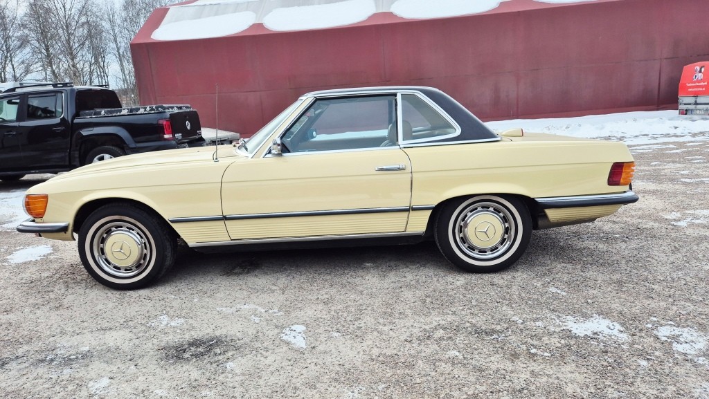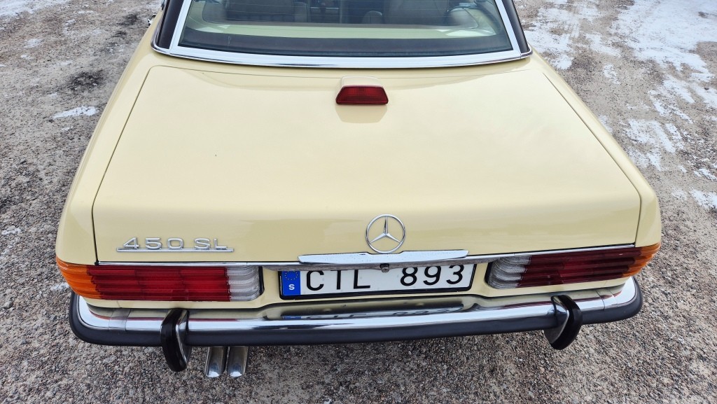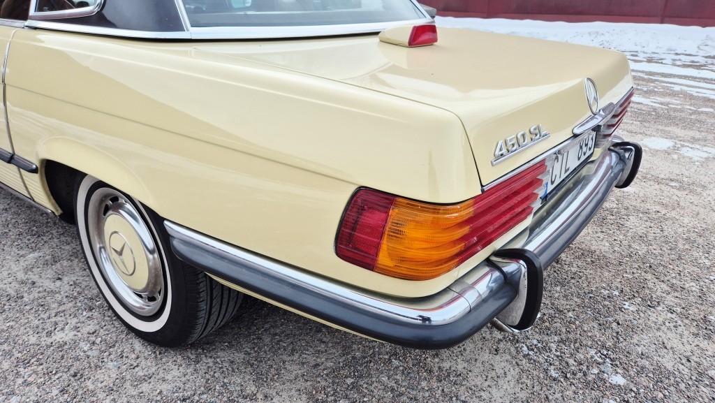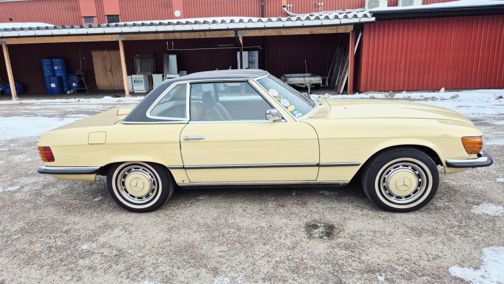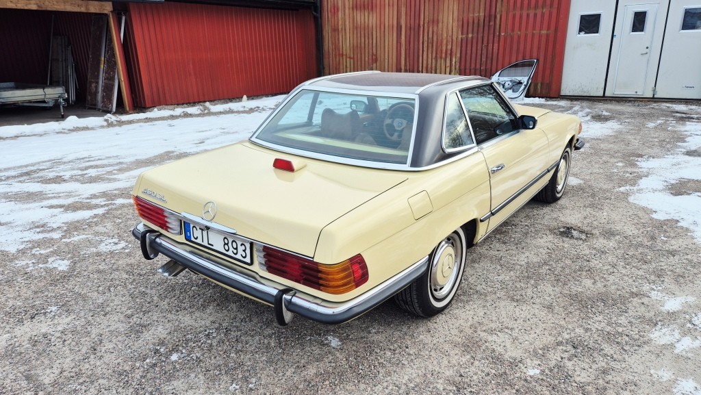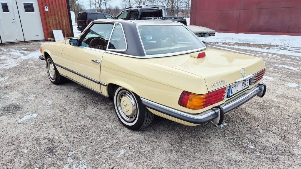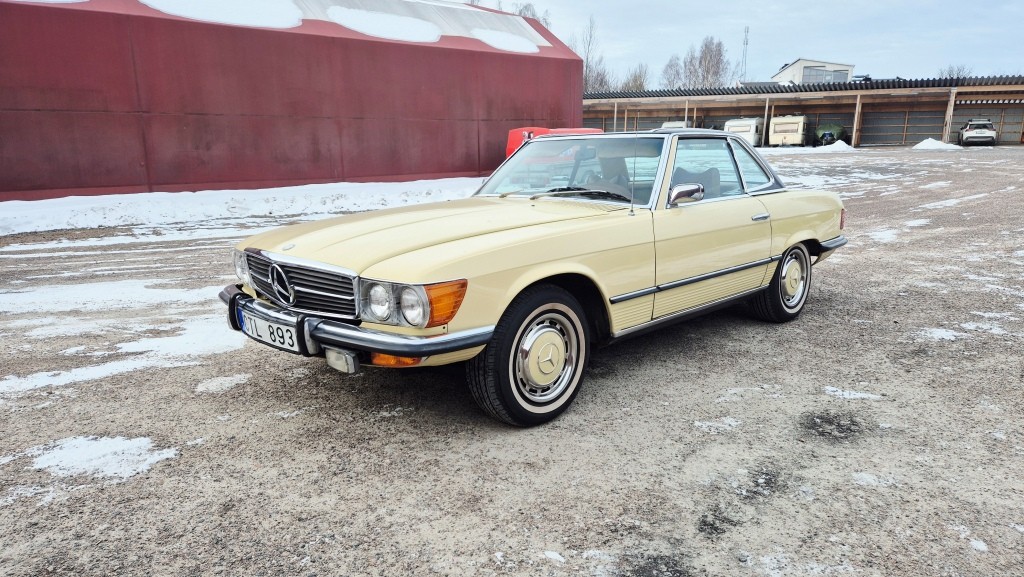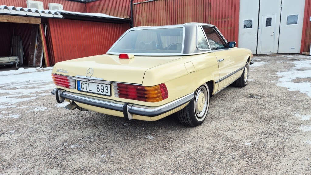 Mercedes-Benz 450 SL i bra bruksskick, importerad och registrerad i Sverige 2011.Avtagbar hardtop och brun tygsuflett i hyfsat skick.Mindre skavanker finnes. (se bilder och video)Fläckarna på huven och skärmen är smuts.