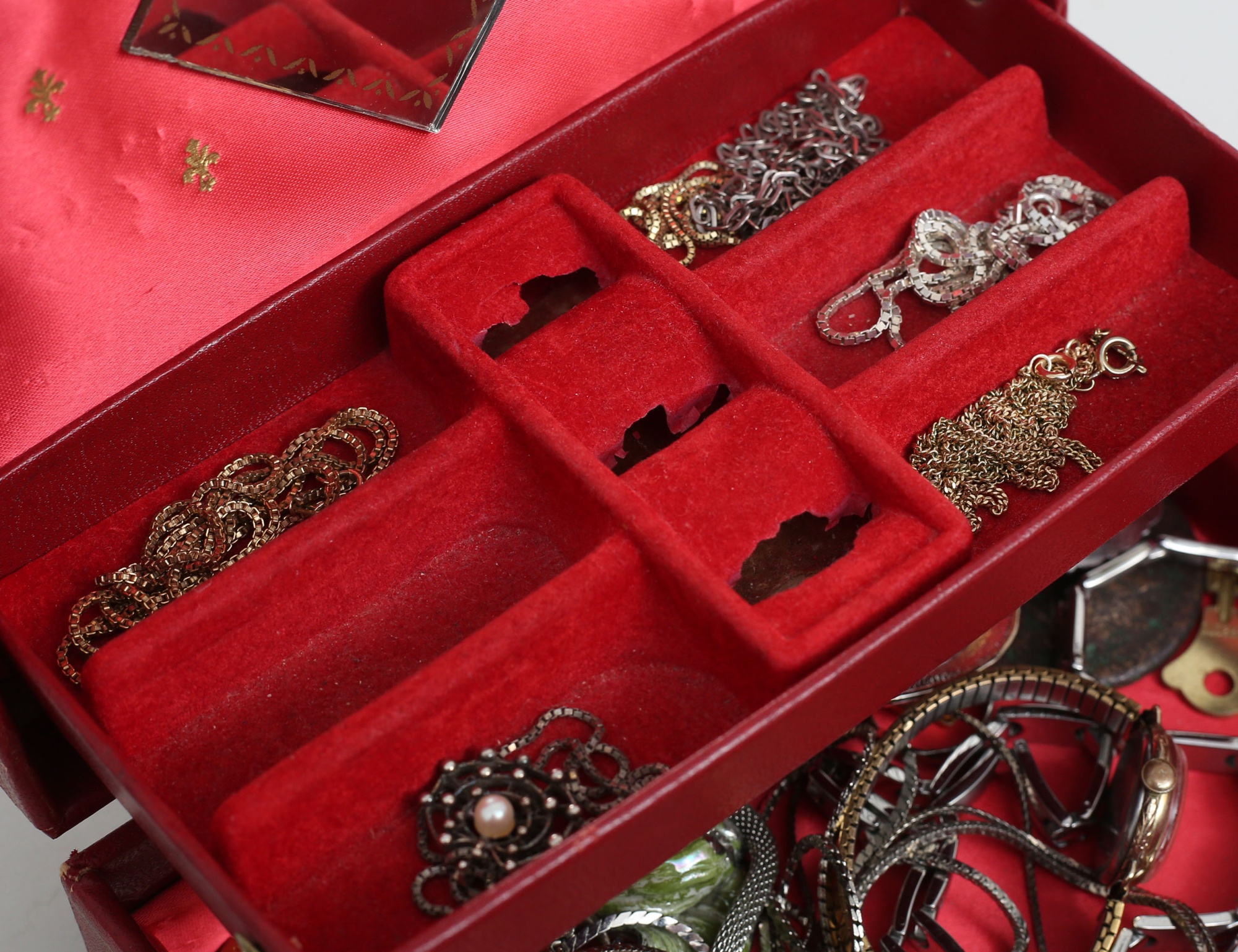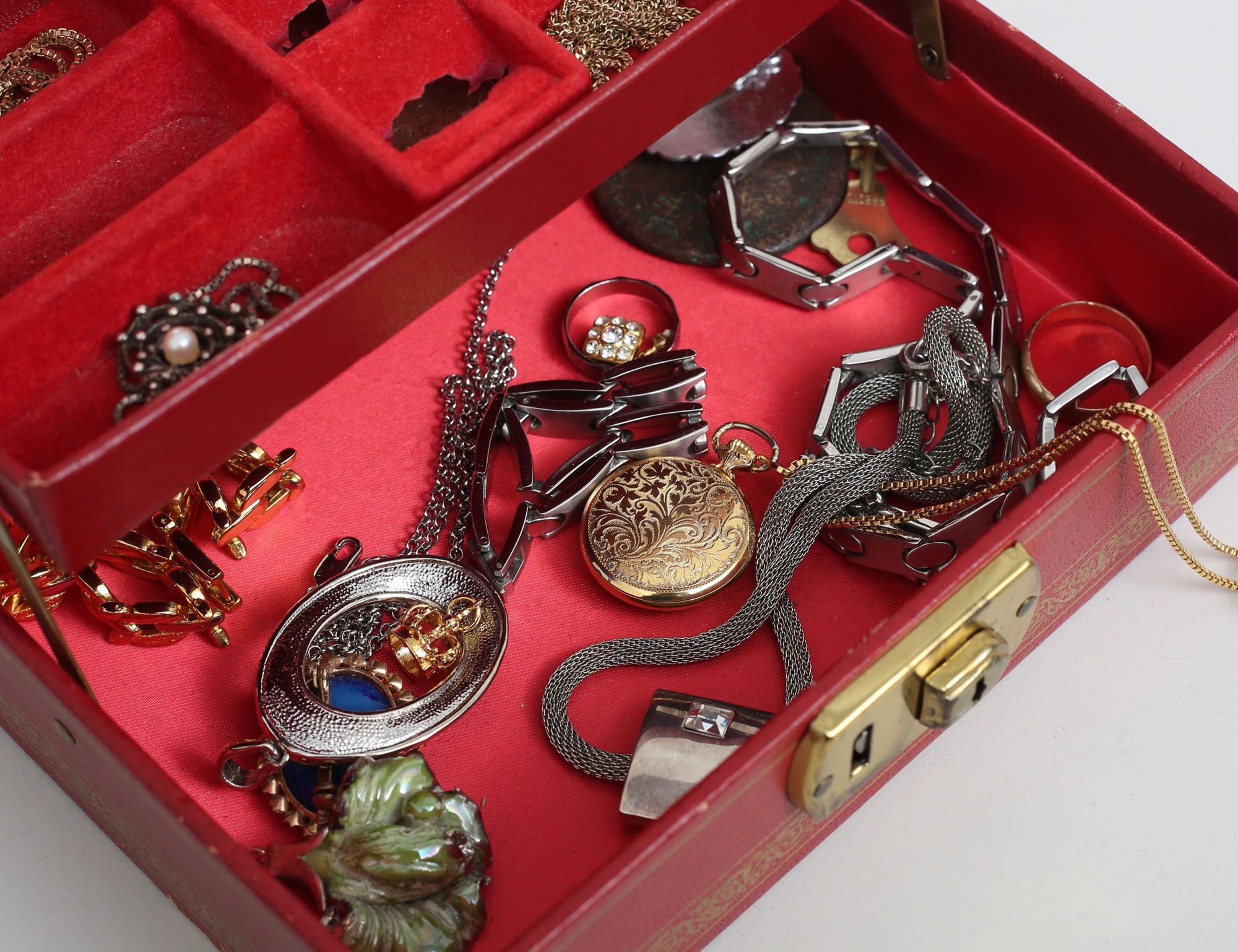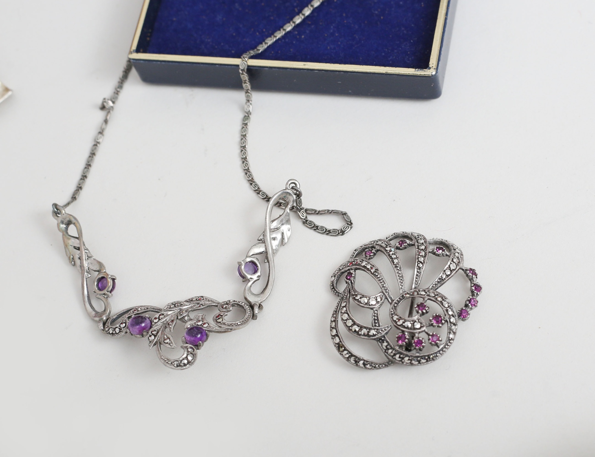 halscollier samt brosch med markasiter och lila stenar, hänge silver, 1970-tal, stämplad 830s, vikt ca 20 gram, smyckesskrin med diverse bijouterier, halskedjor, klockar m.m